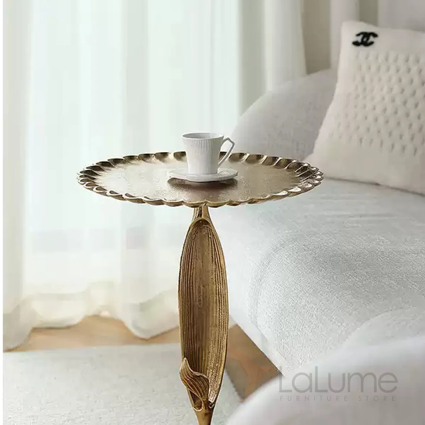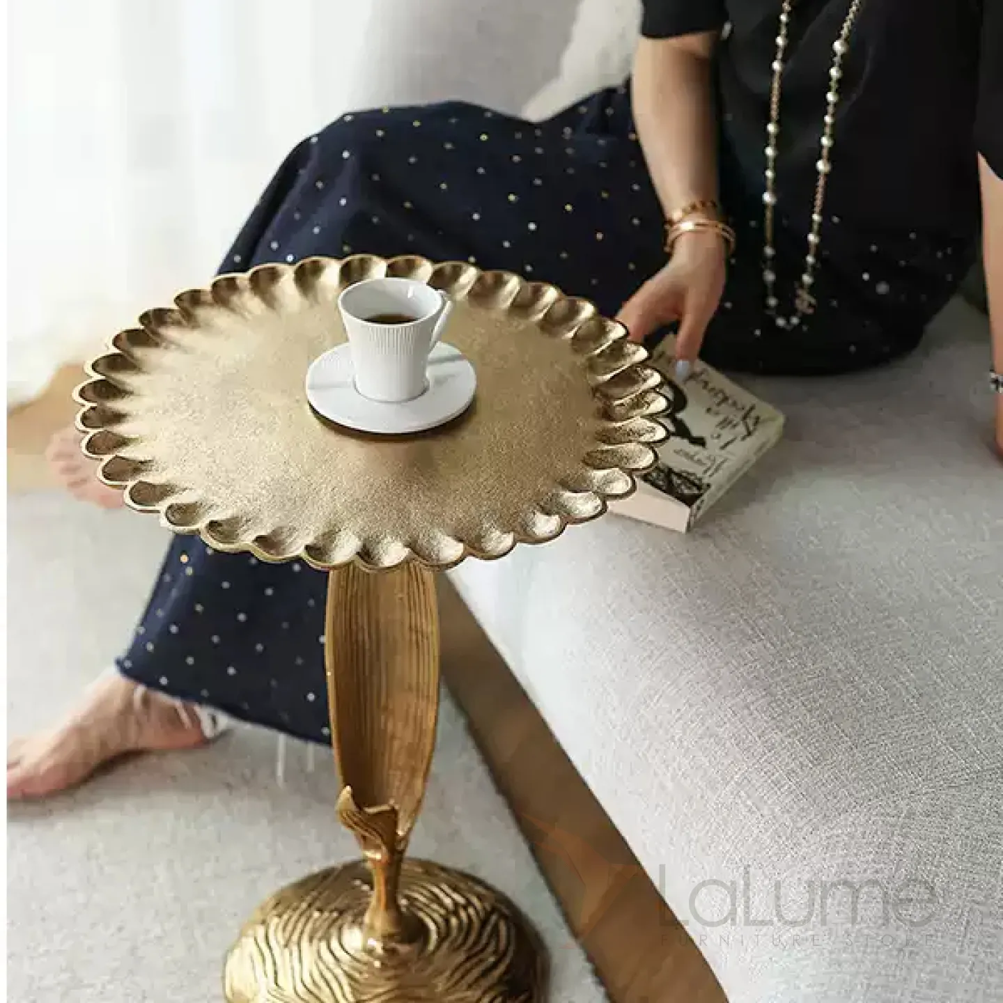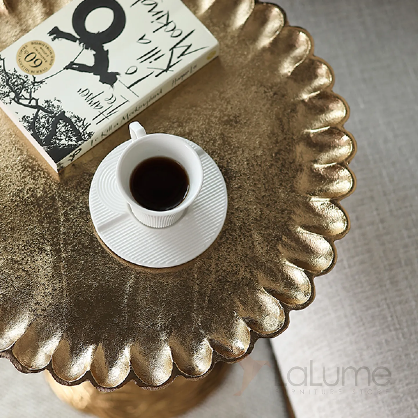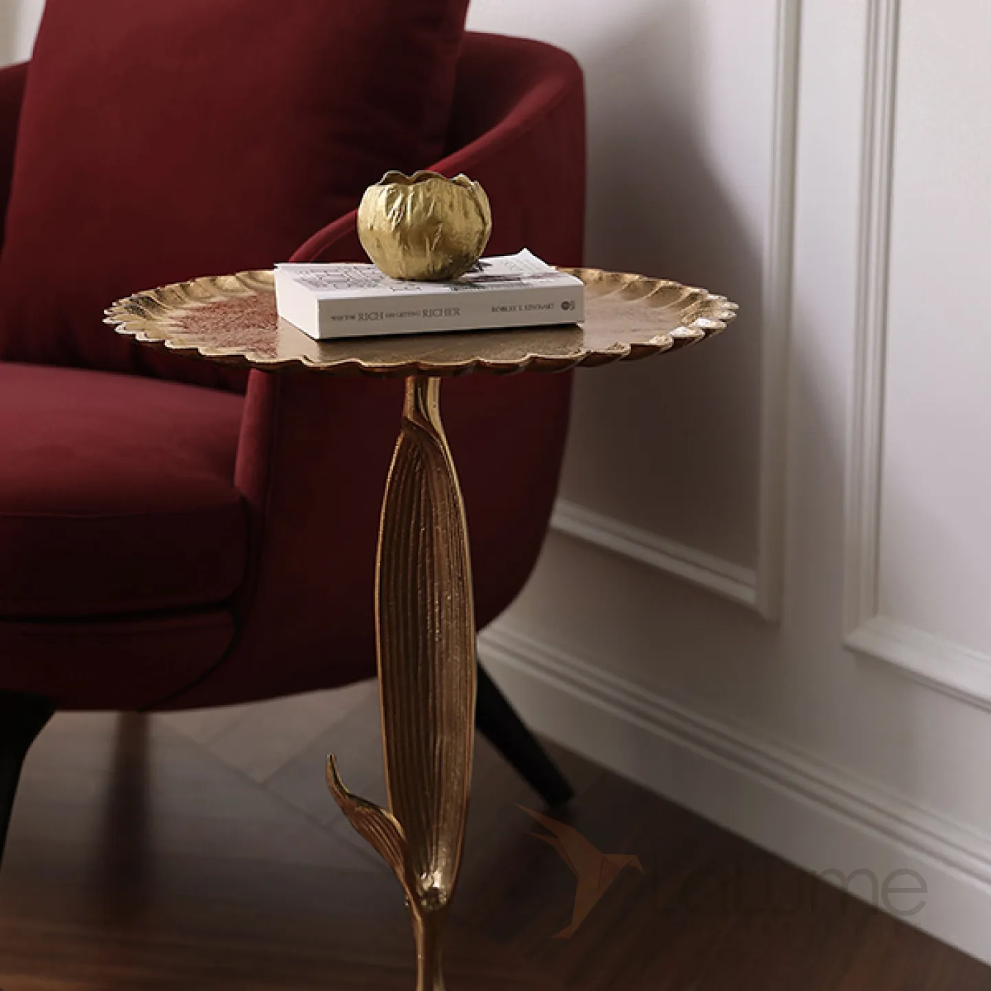 Журнальный столик в виде подсолнуха, изготовленный из алюминия и покрытый позолотой. Этот оригинальный предмет мебели станет ярким акцентом в интерьере, придав ему неповторимый шарм.