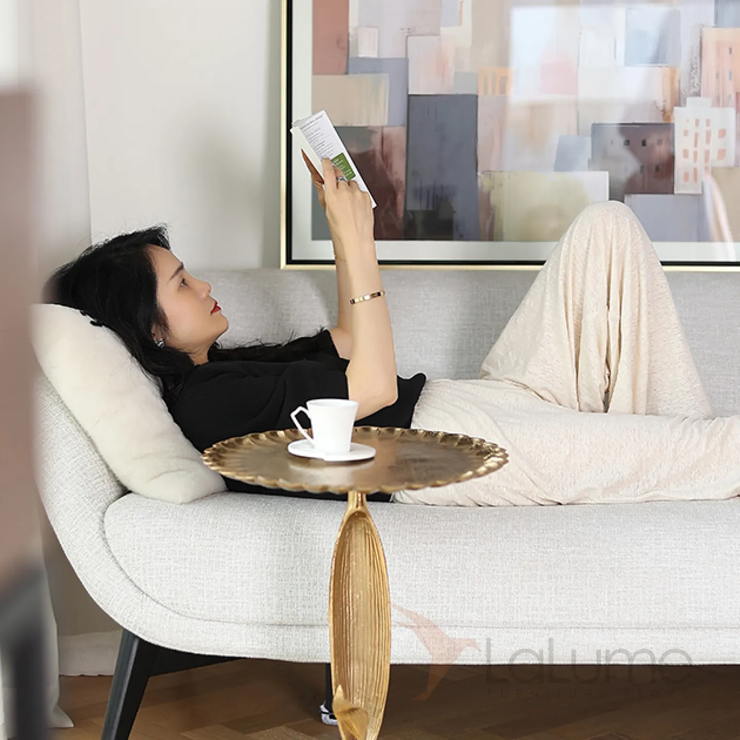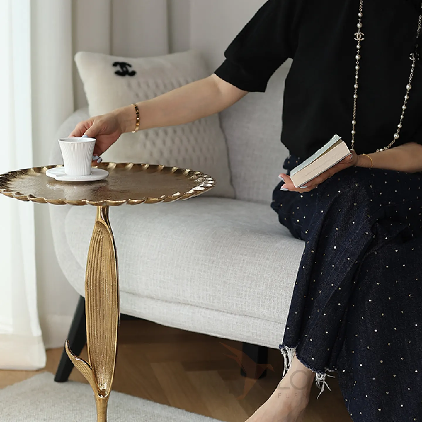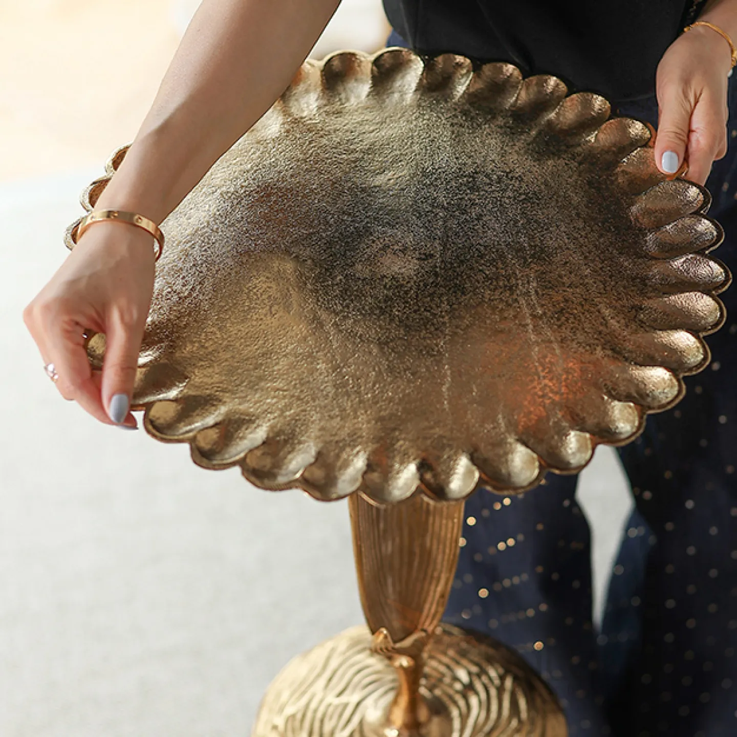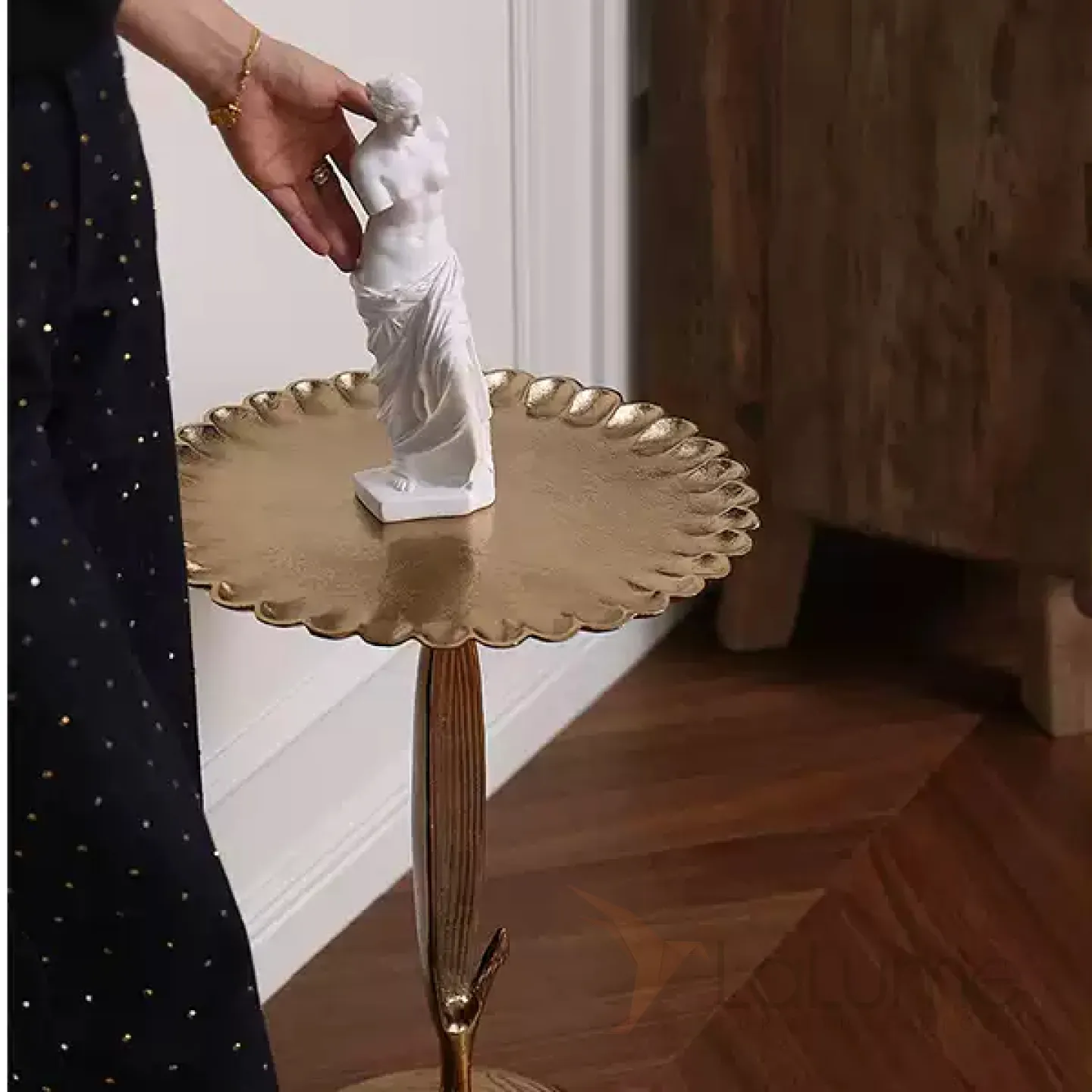 Журнальный столик в виде подсолнуха, изготовленный из алюминия и покрытый позолотой. Этот оригинальный предмет мебели станет ярким акцентом в интерьере, придав ему неповторимый шарм.