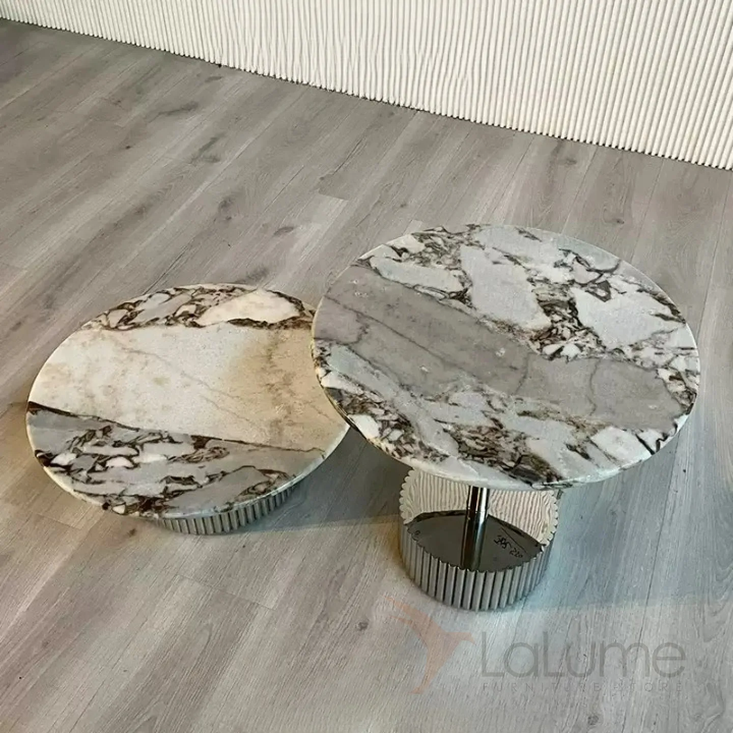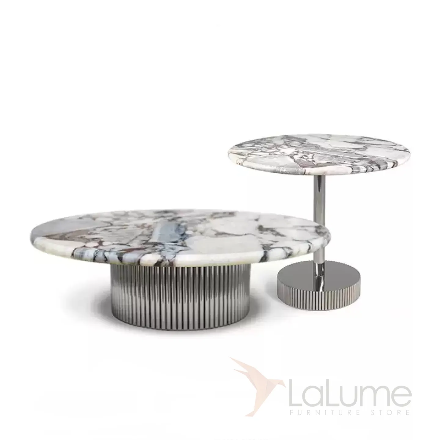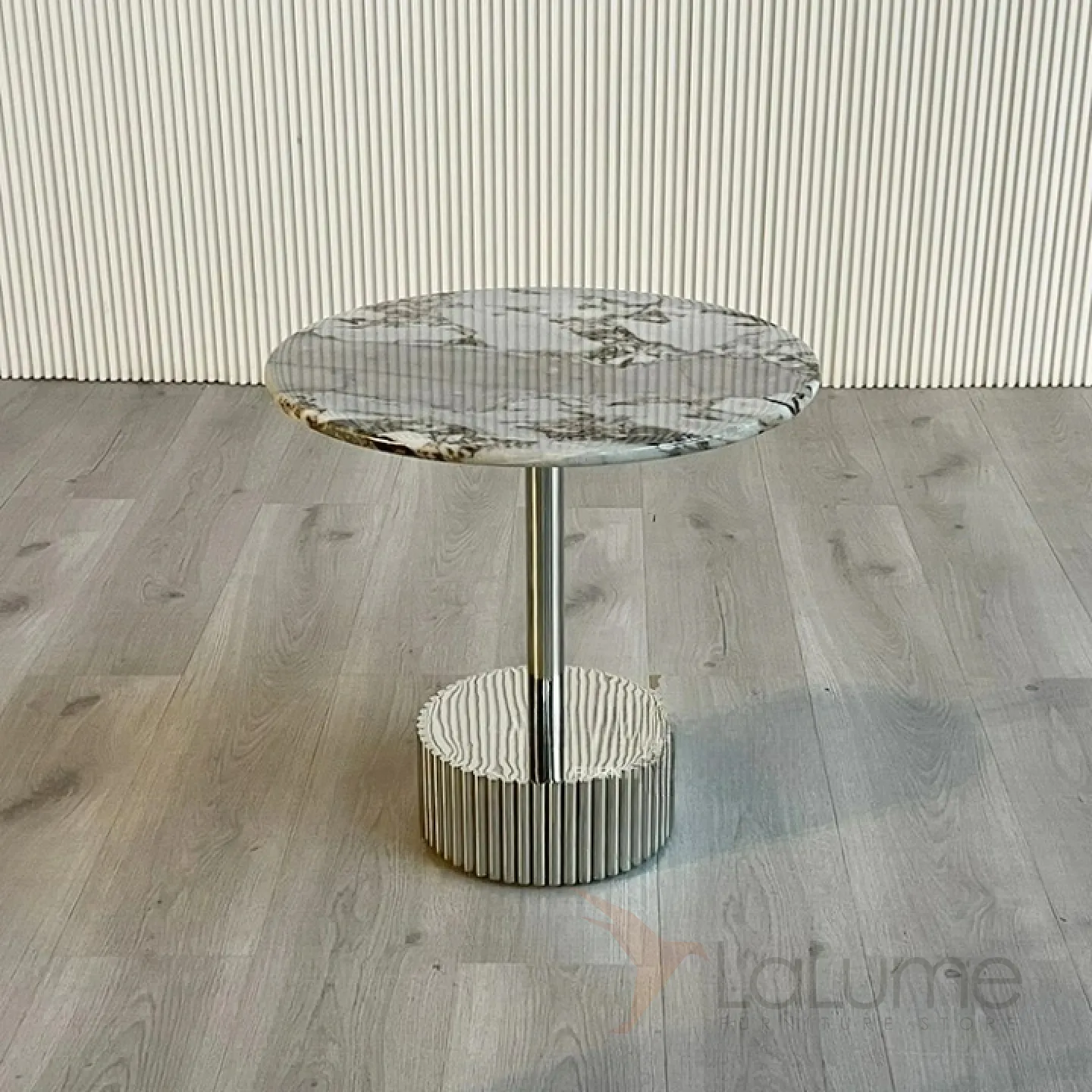 Журнальный столик на металлическом основании со столешницей из мрамора или терраццо в зависимости от модели.