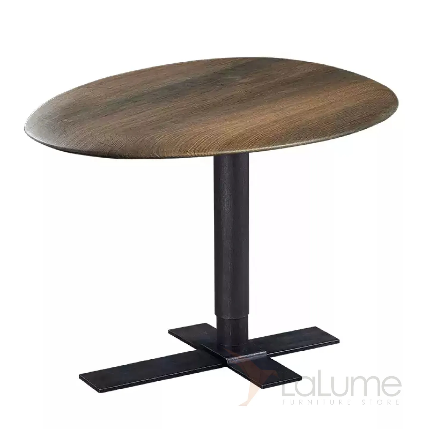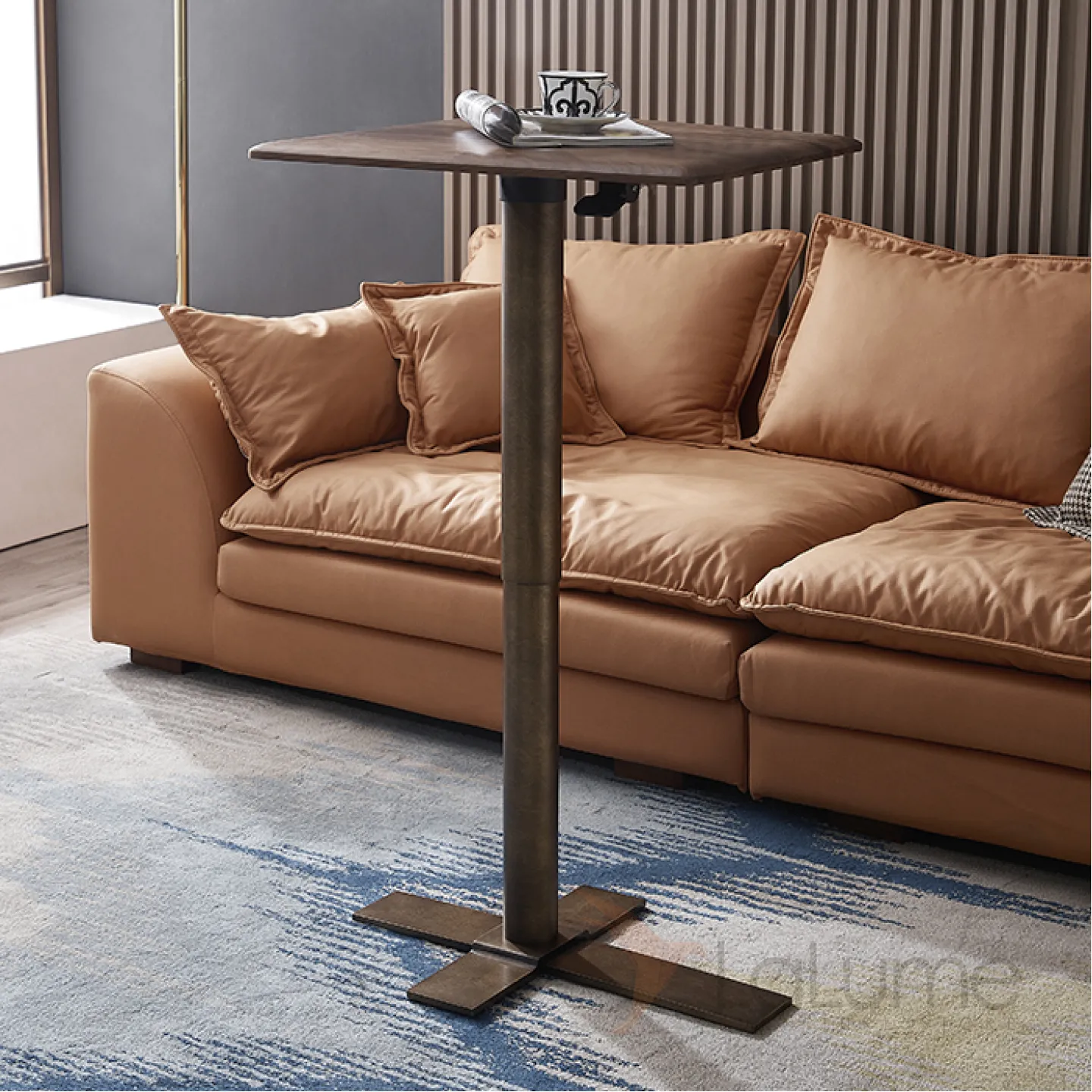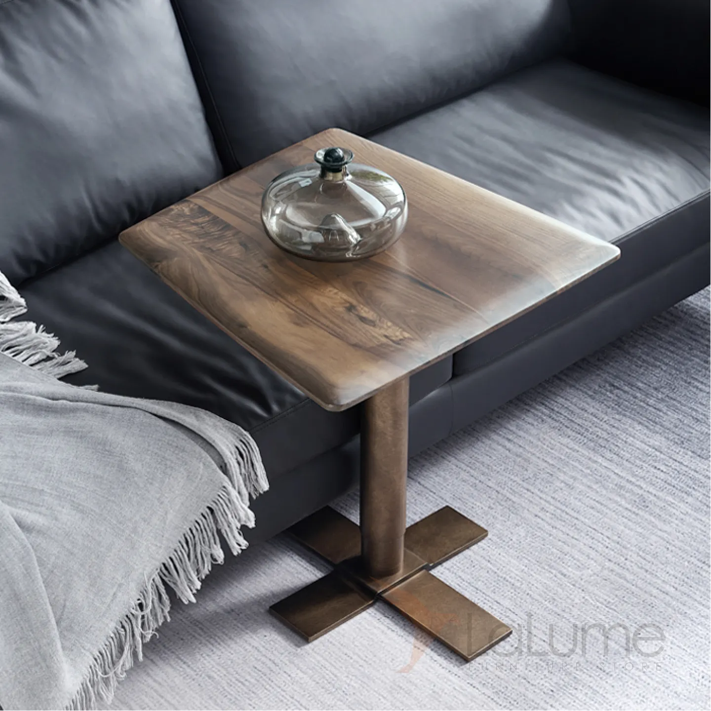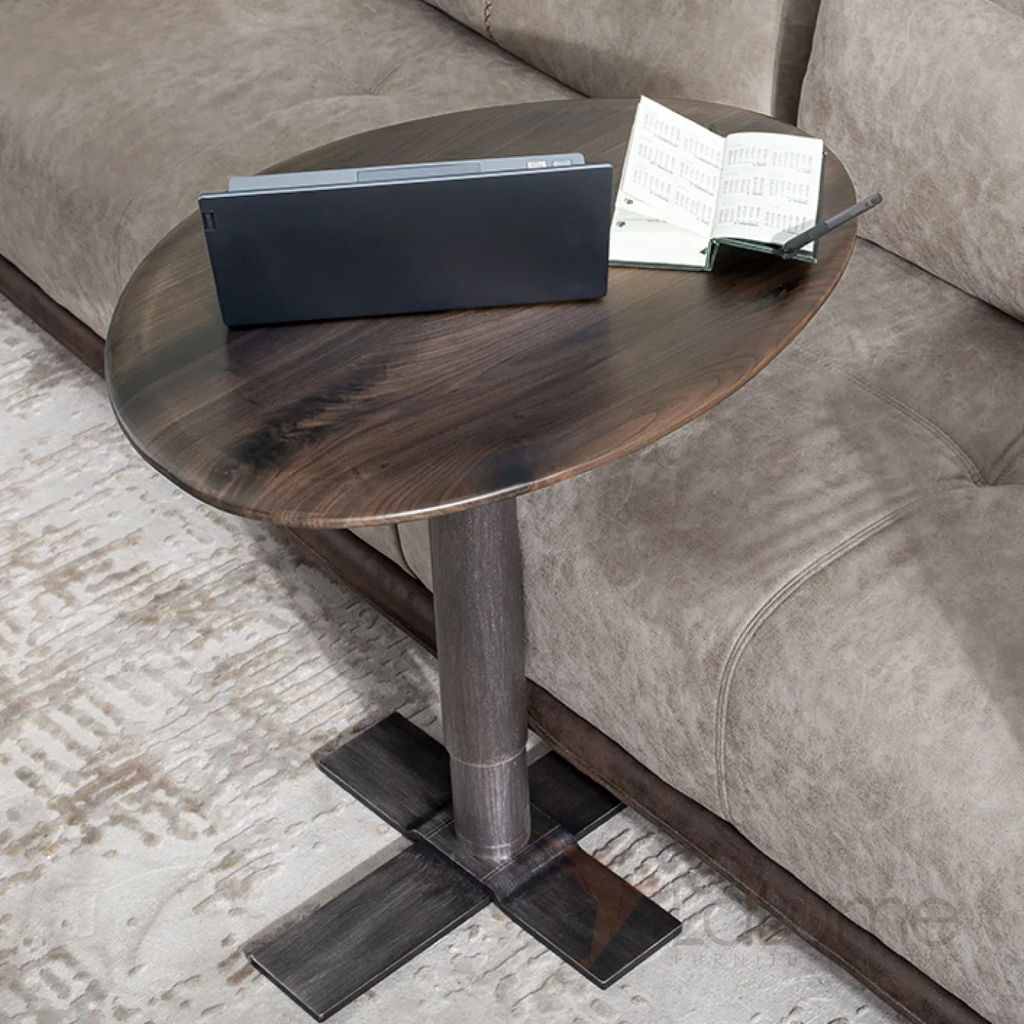Журнальный столик с металлической ножкой и столешницей из чёрного ореха. Столешница может быть любой формы. Ножка оснащена подъёмным механизмом, который позволяет регулировать высоту.