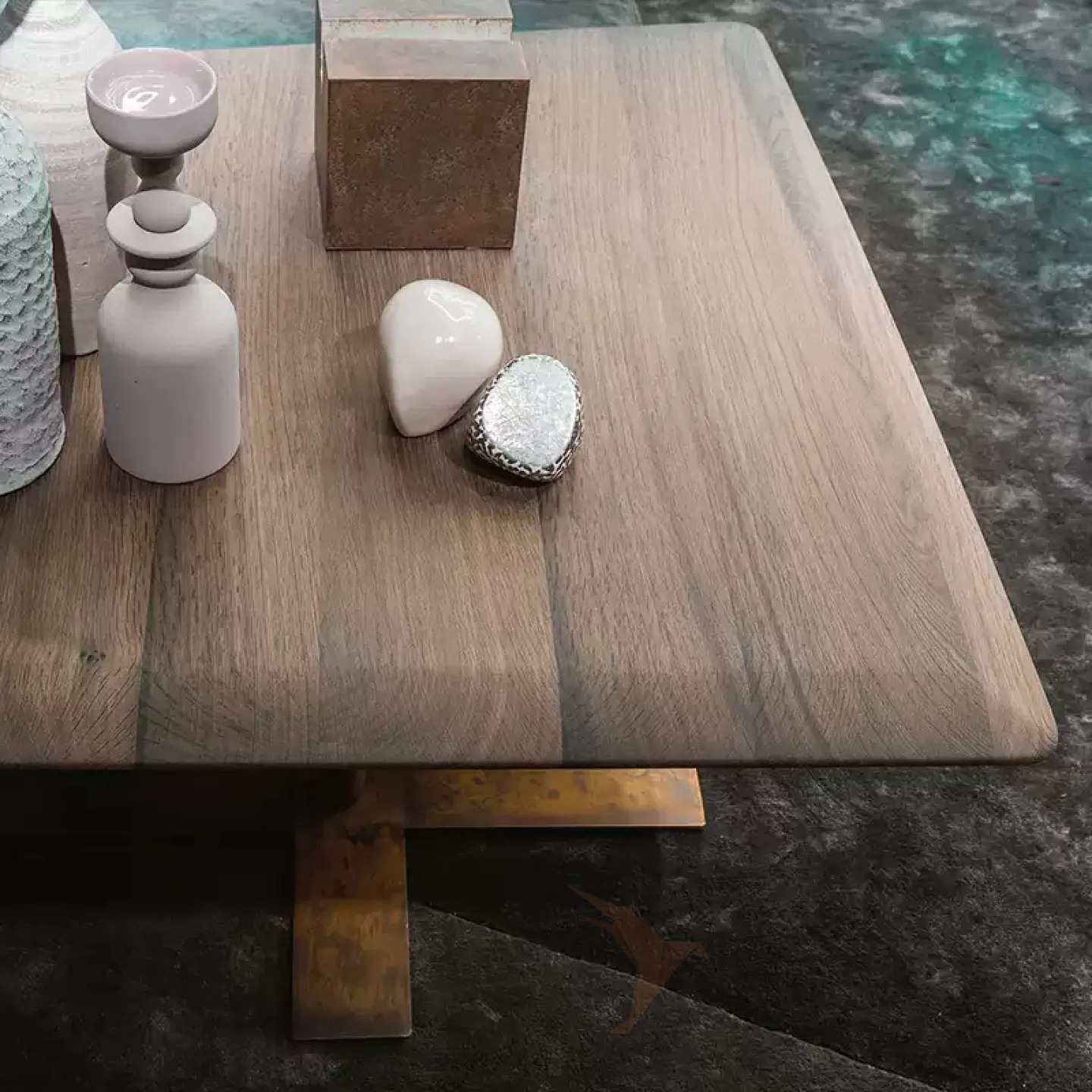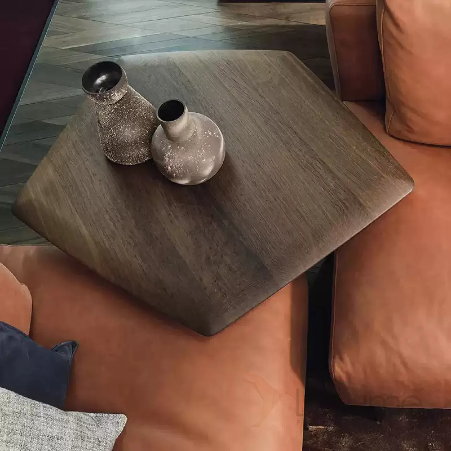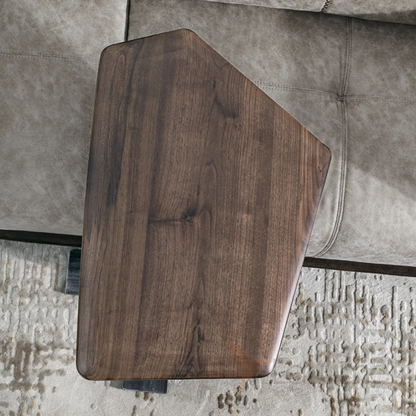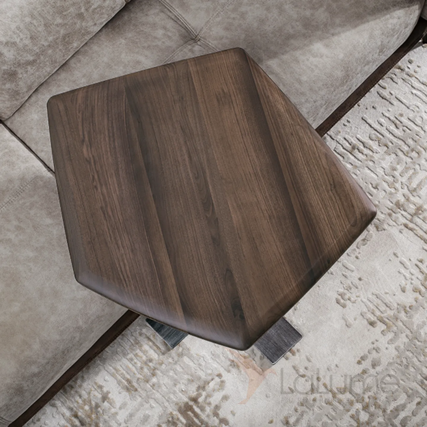 Журнальный столик с металлической ножкой и столешницей из чёрного ореха. Столешница может быть любой формы. Ножка оснащена подъёмным механизмом, который позволяет регулировать высоту.