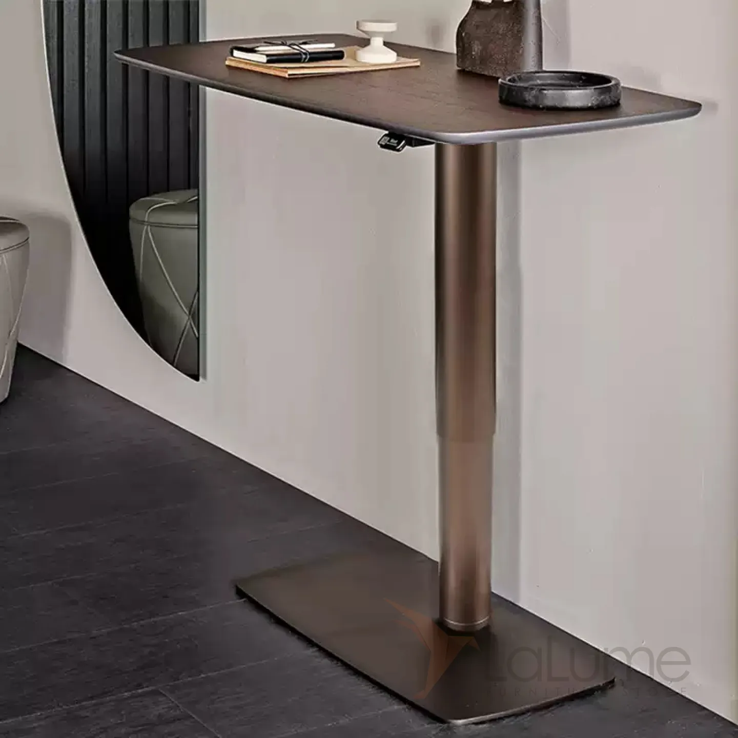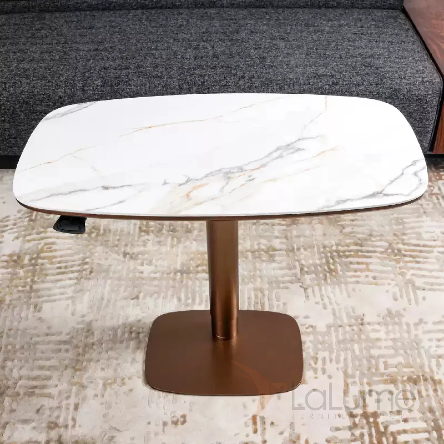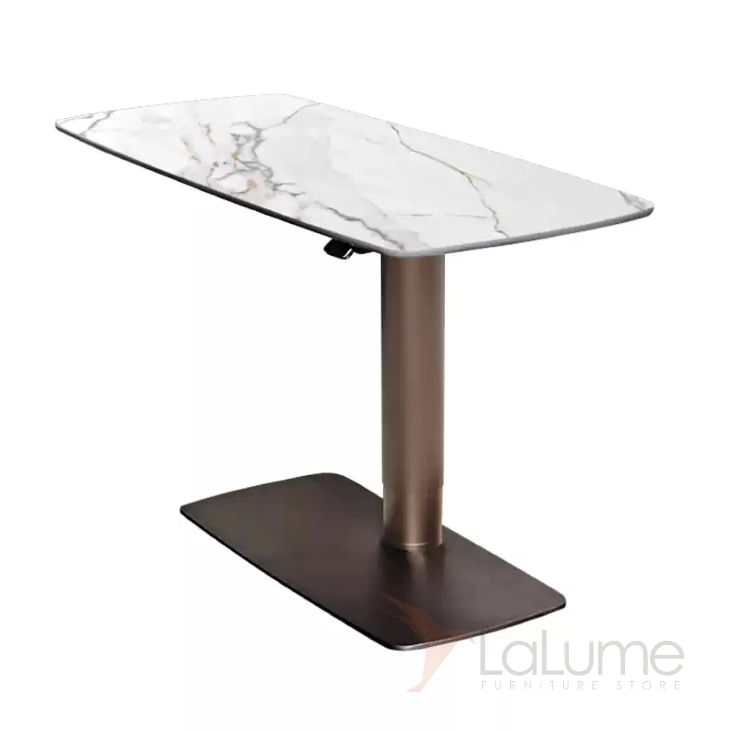 Журнальный столик с металлической ножкой и столешницей из мрамора или дерева, в зависимости от модели. Ножка оснащена подъёмным механизмом, который позволяет регулировать высоту.