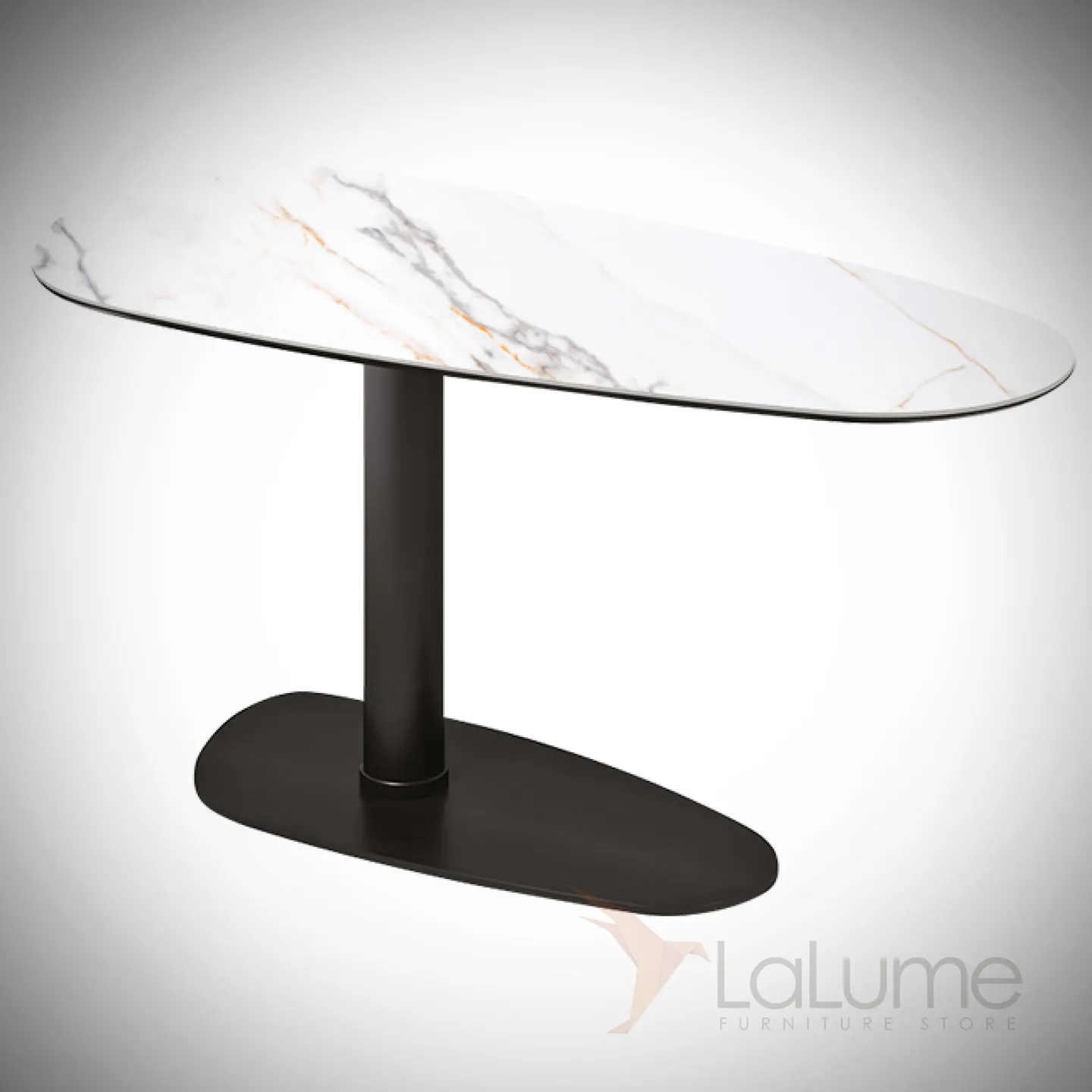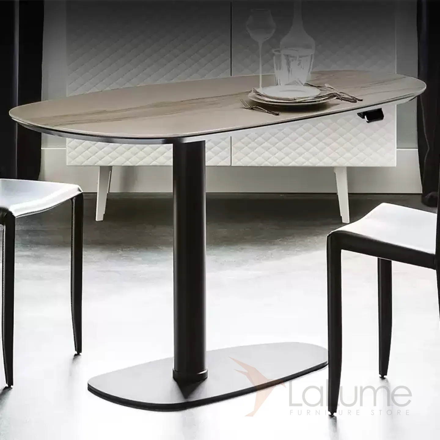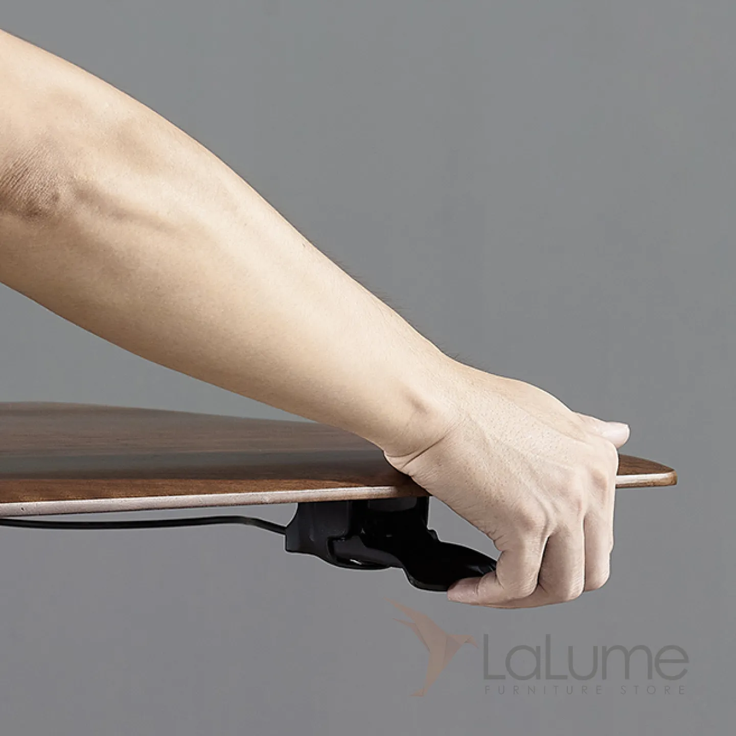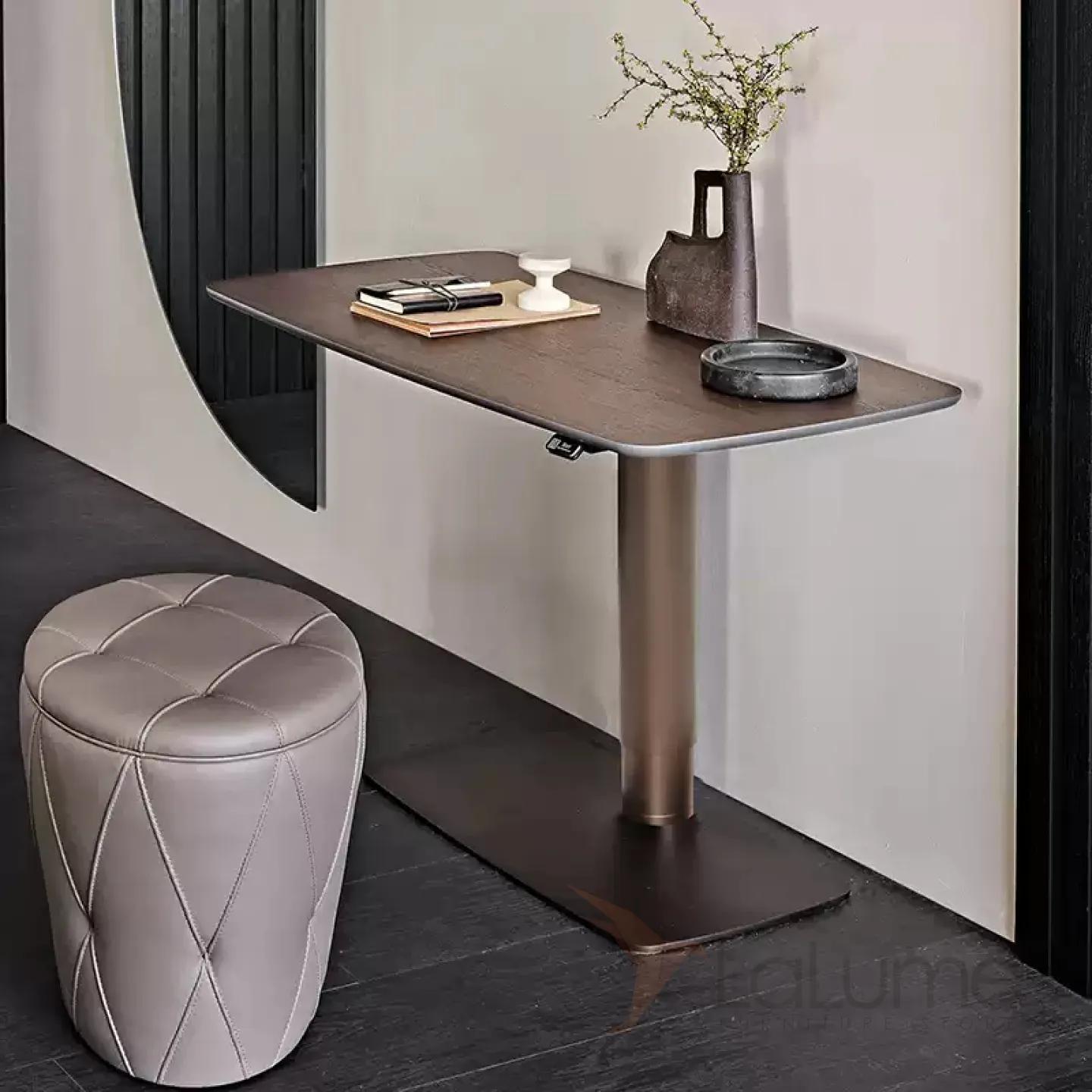 Журнальный столик с металлической ножкой и столешницей из мрамора или дерева, в зависимости от модели. Ножка оснащена подъёмным механизмом, который позволяет регулировать высоту.