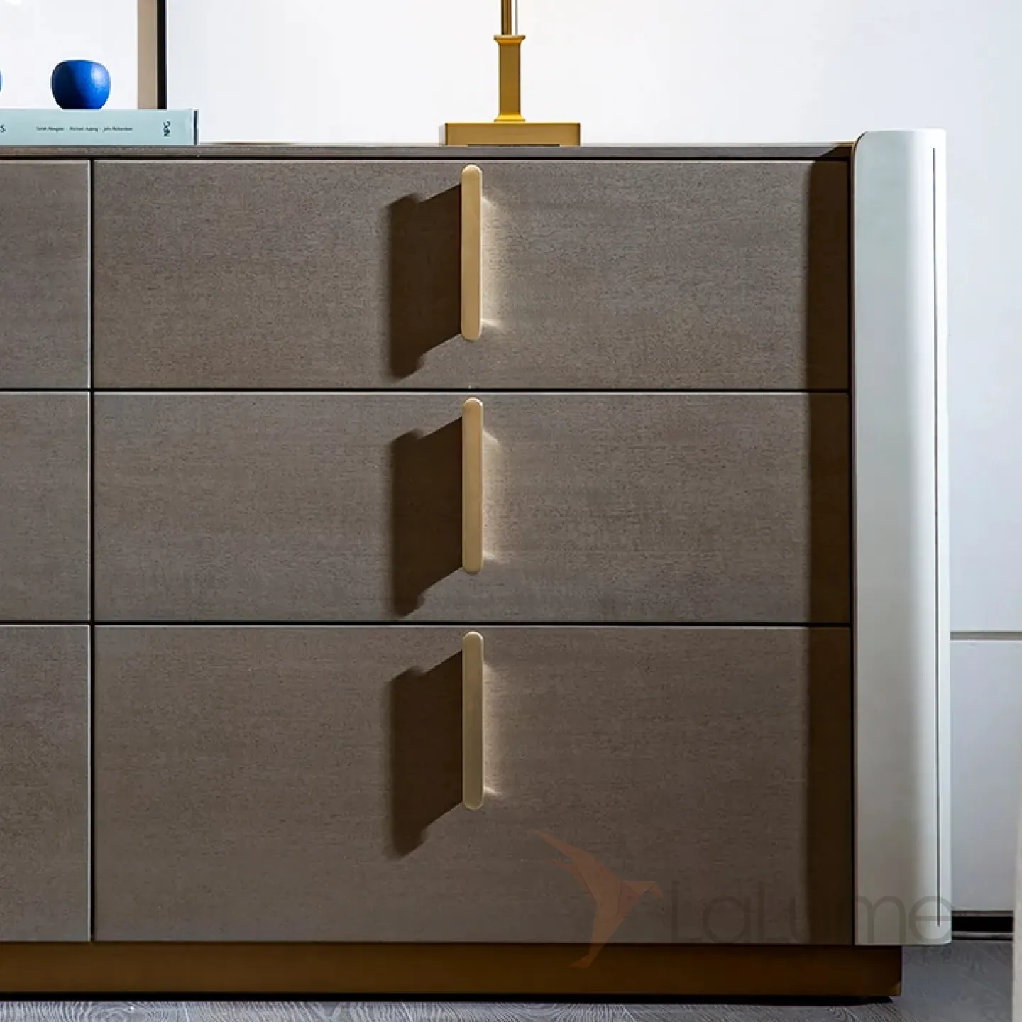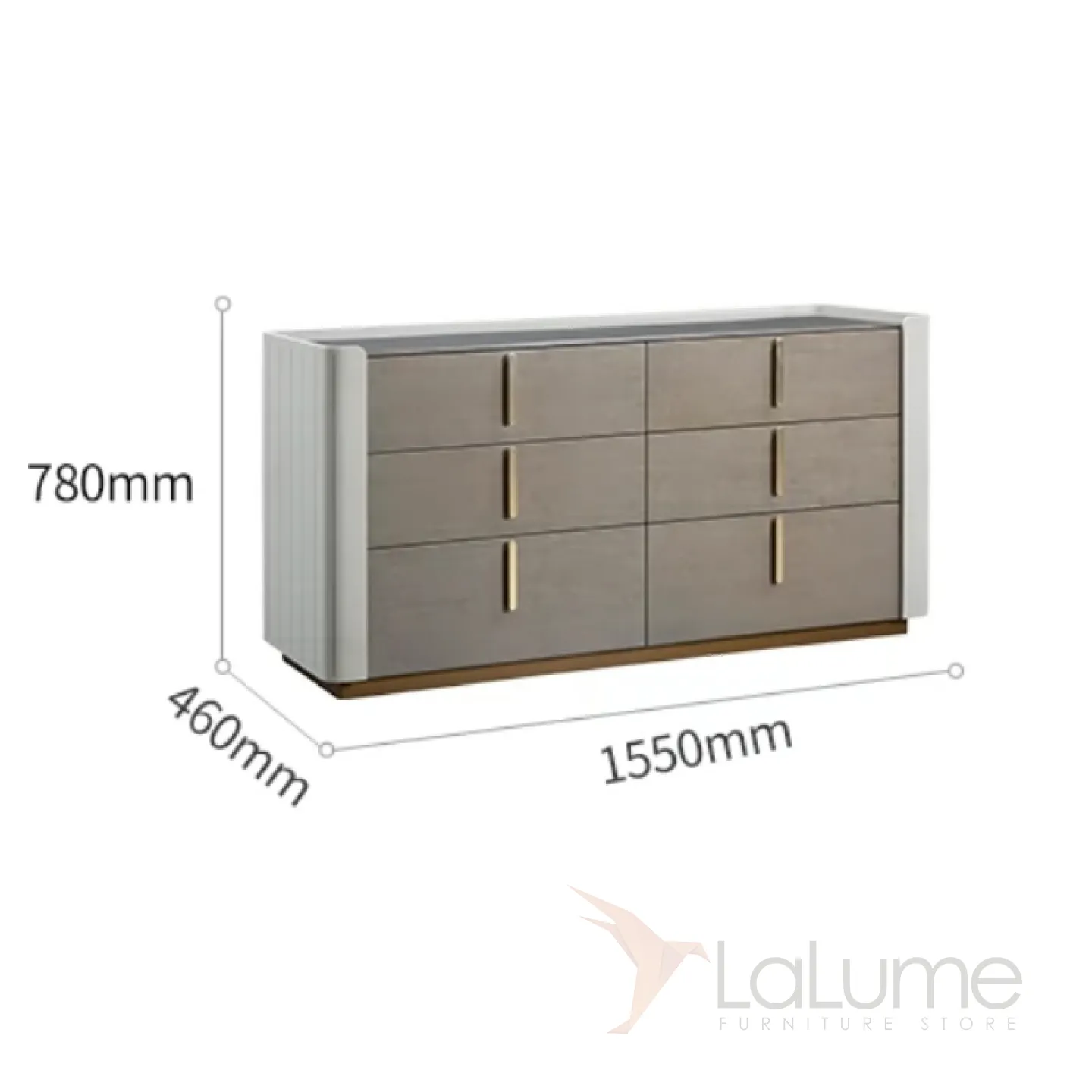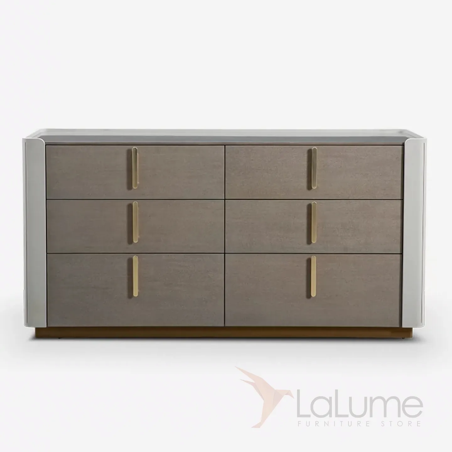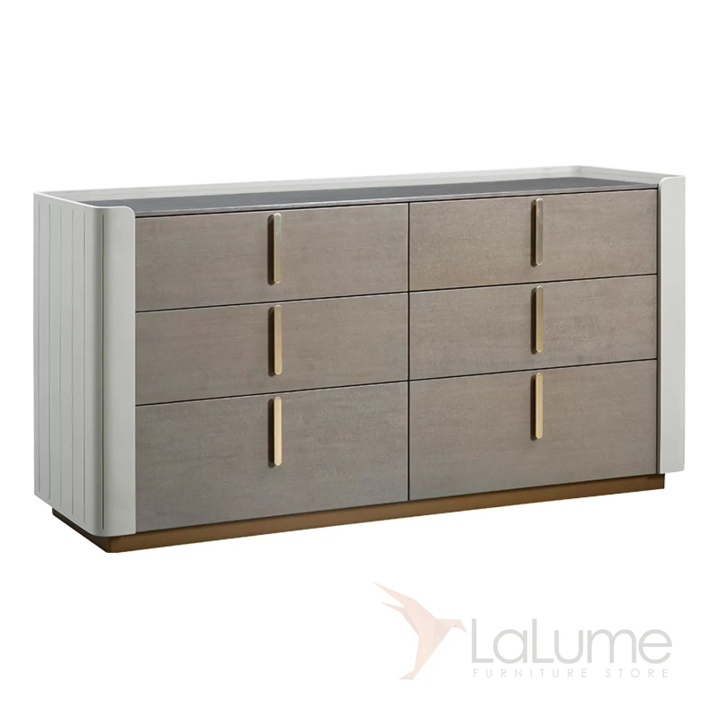 Комод из массива белого дуба и шпона украшен фурнитурой с золотой ручкой. В нем шесть выдвижных ящиков для удобного хранения.