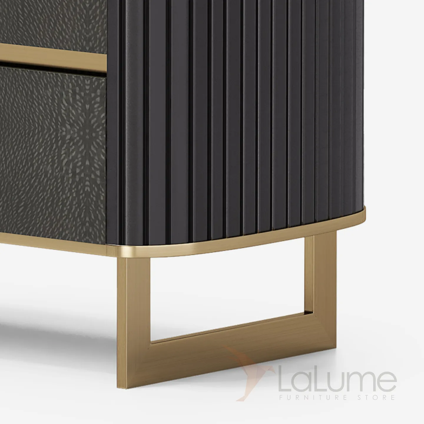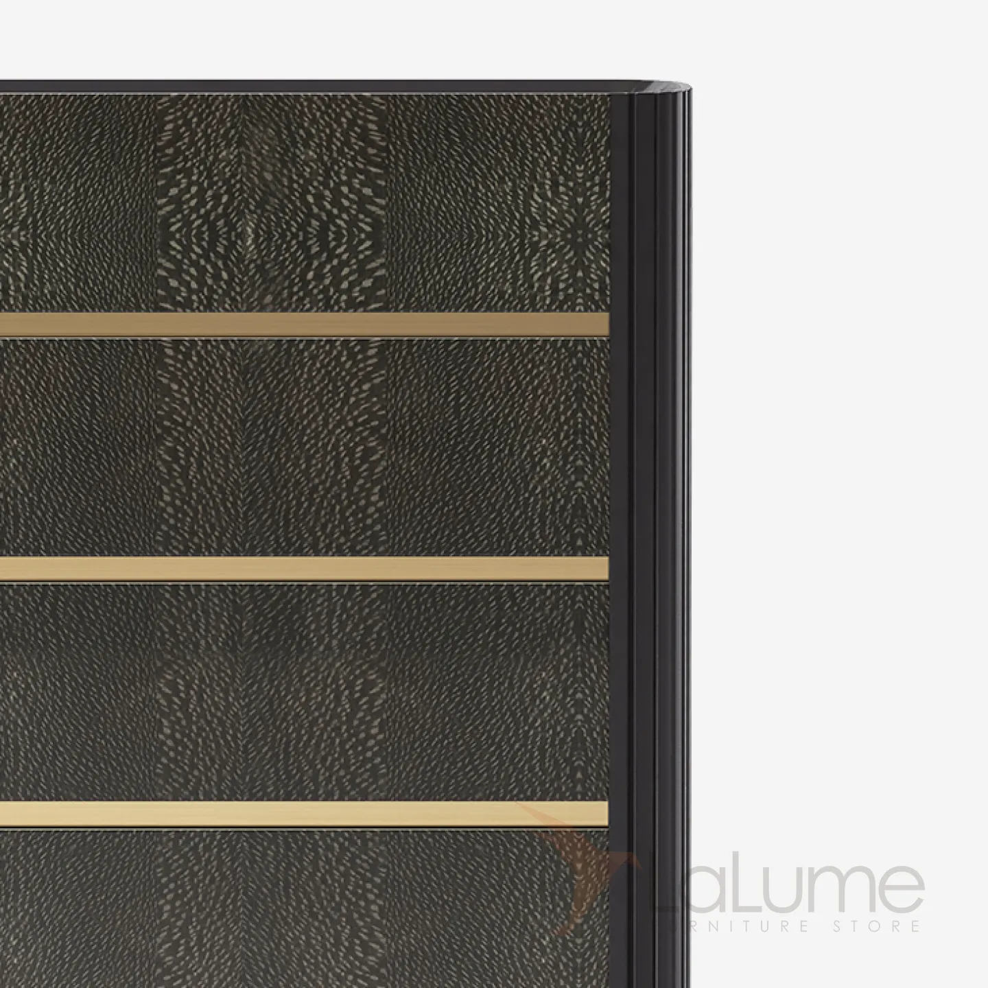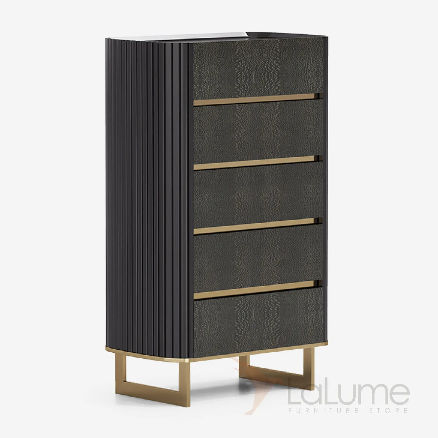 Изделие из натурального дерева бука, покрытое шпоном, декорировано фурнитурой, имитирующей золото. В комоде пять удобных ящиков для хранения вещей.