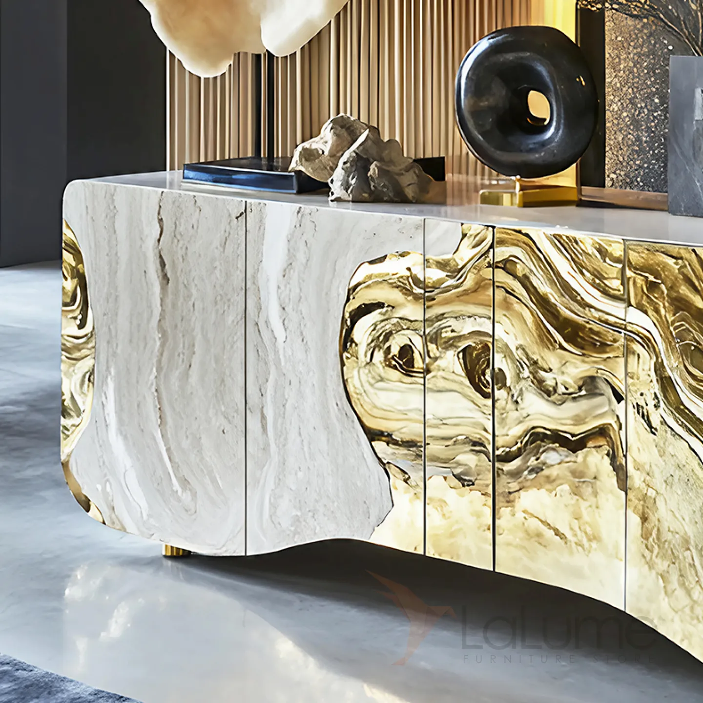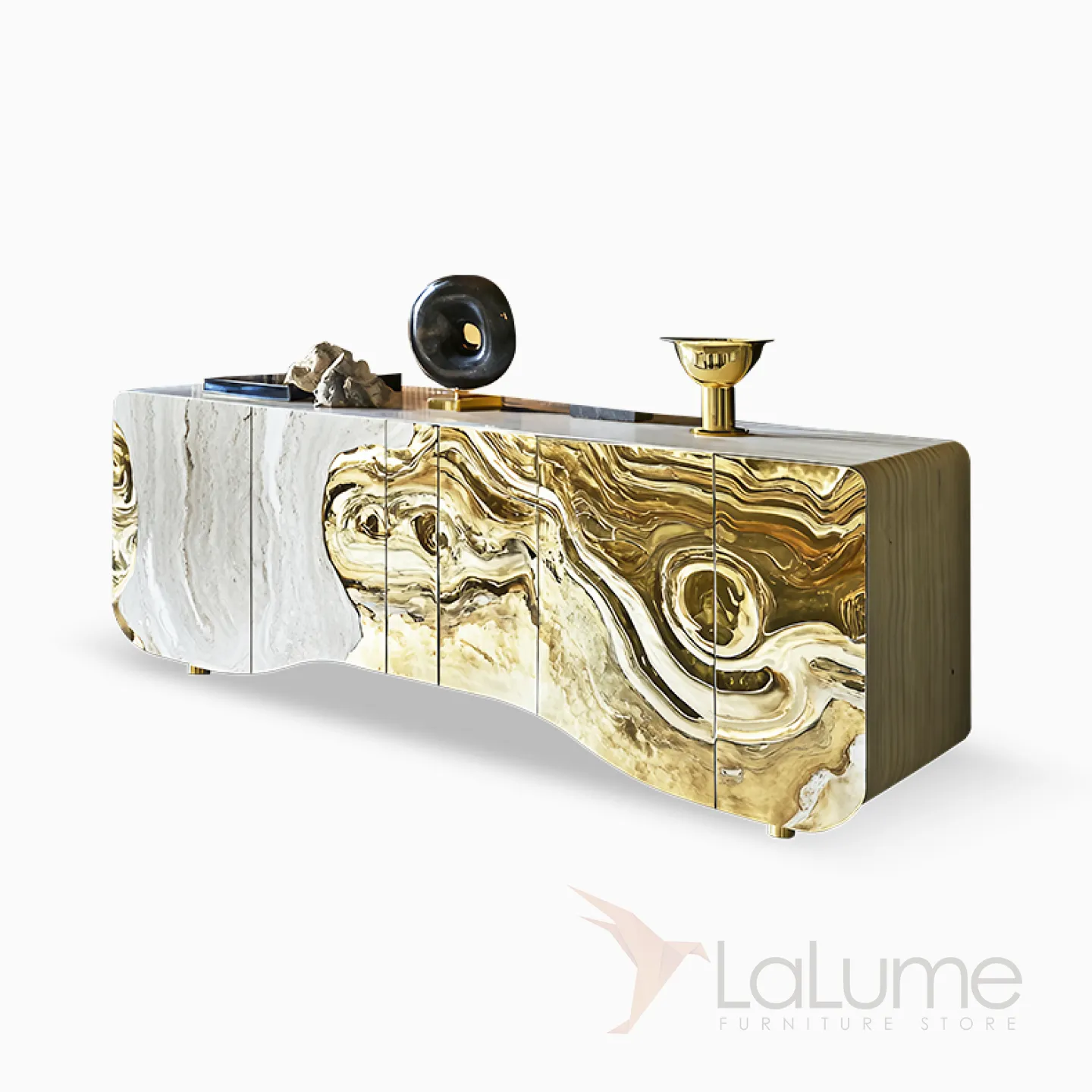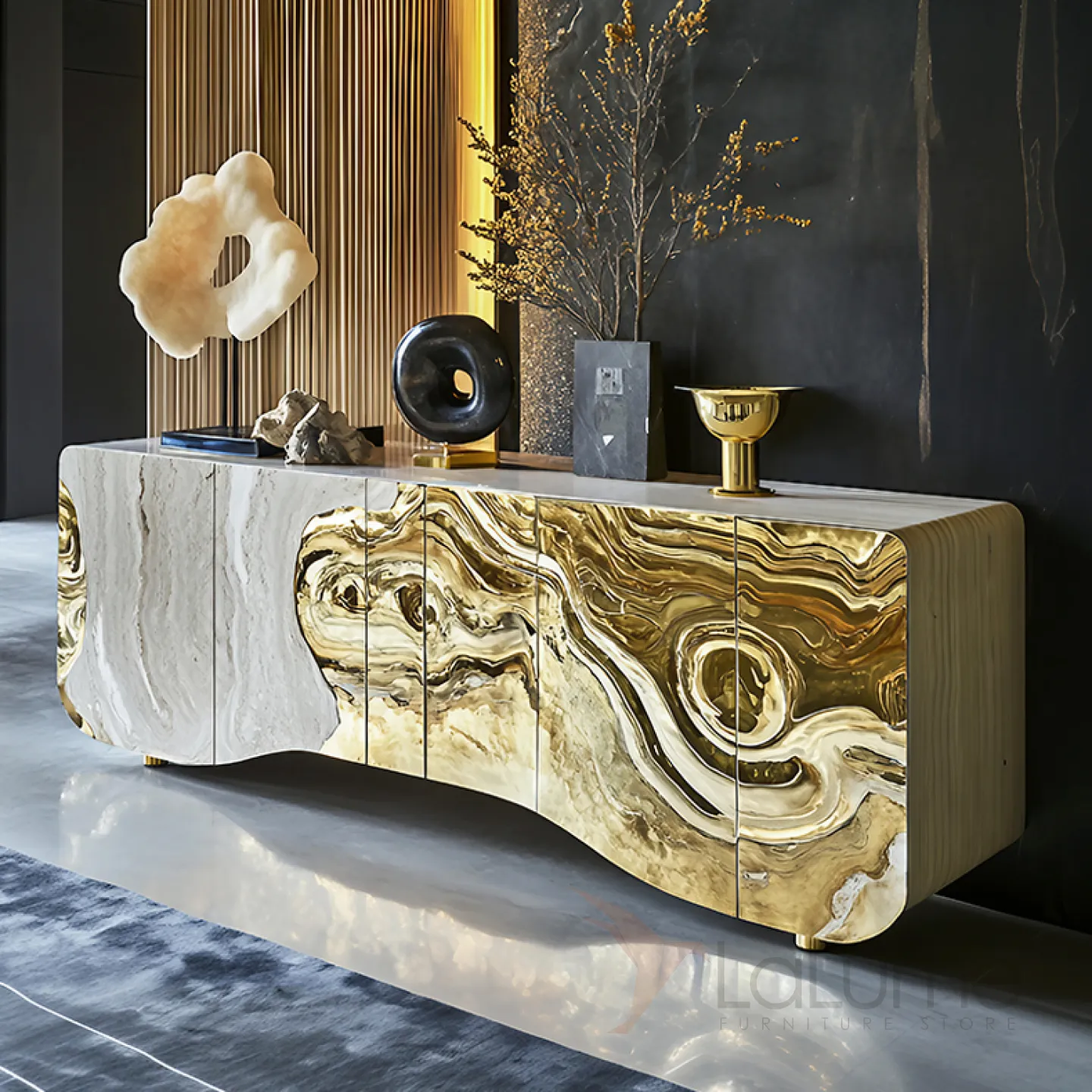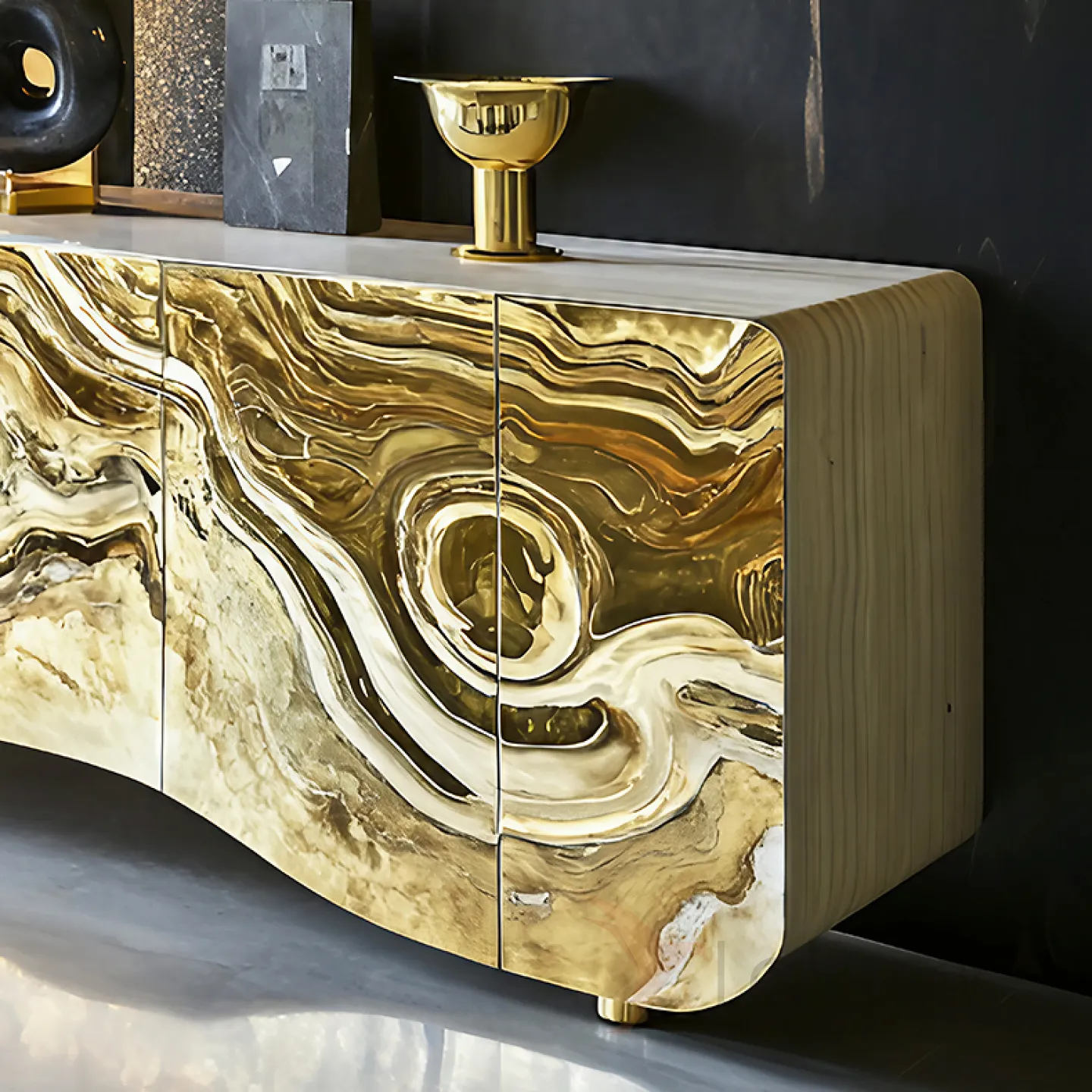 Этот элегантный комод объединяет классику дерева и современные нанотехнологии, дополненные блеском золота. Он не только украшает интерьер, но и функционален: внутри пять отделений с дверцами для удобного хранения вещей.
