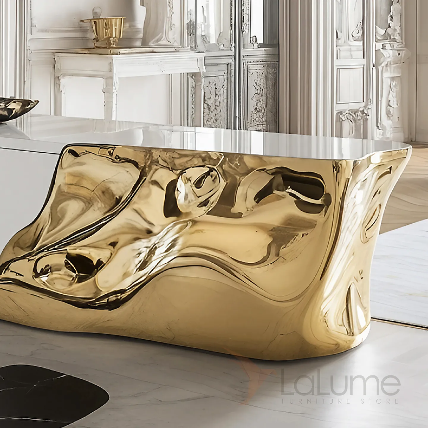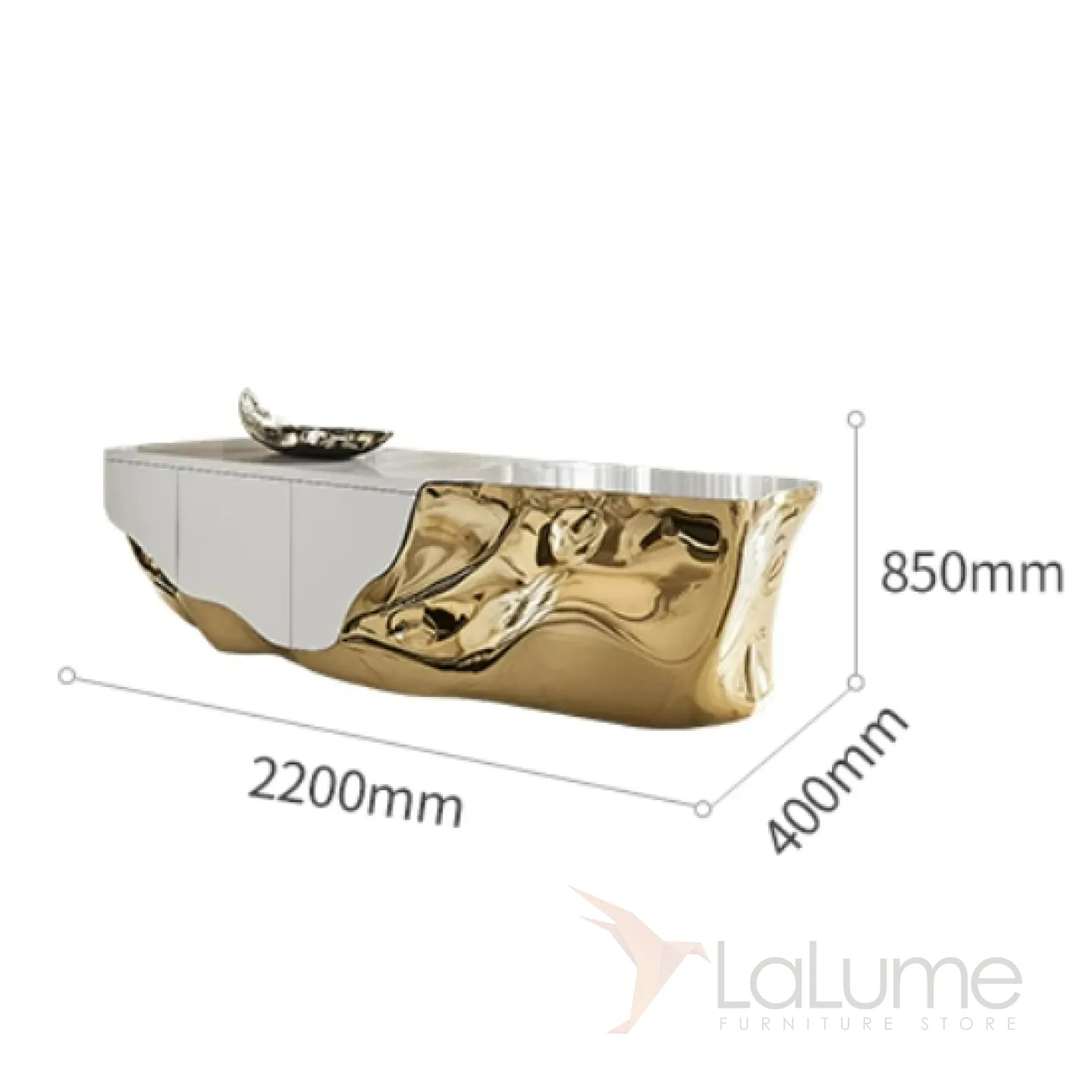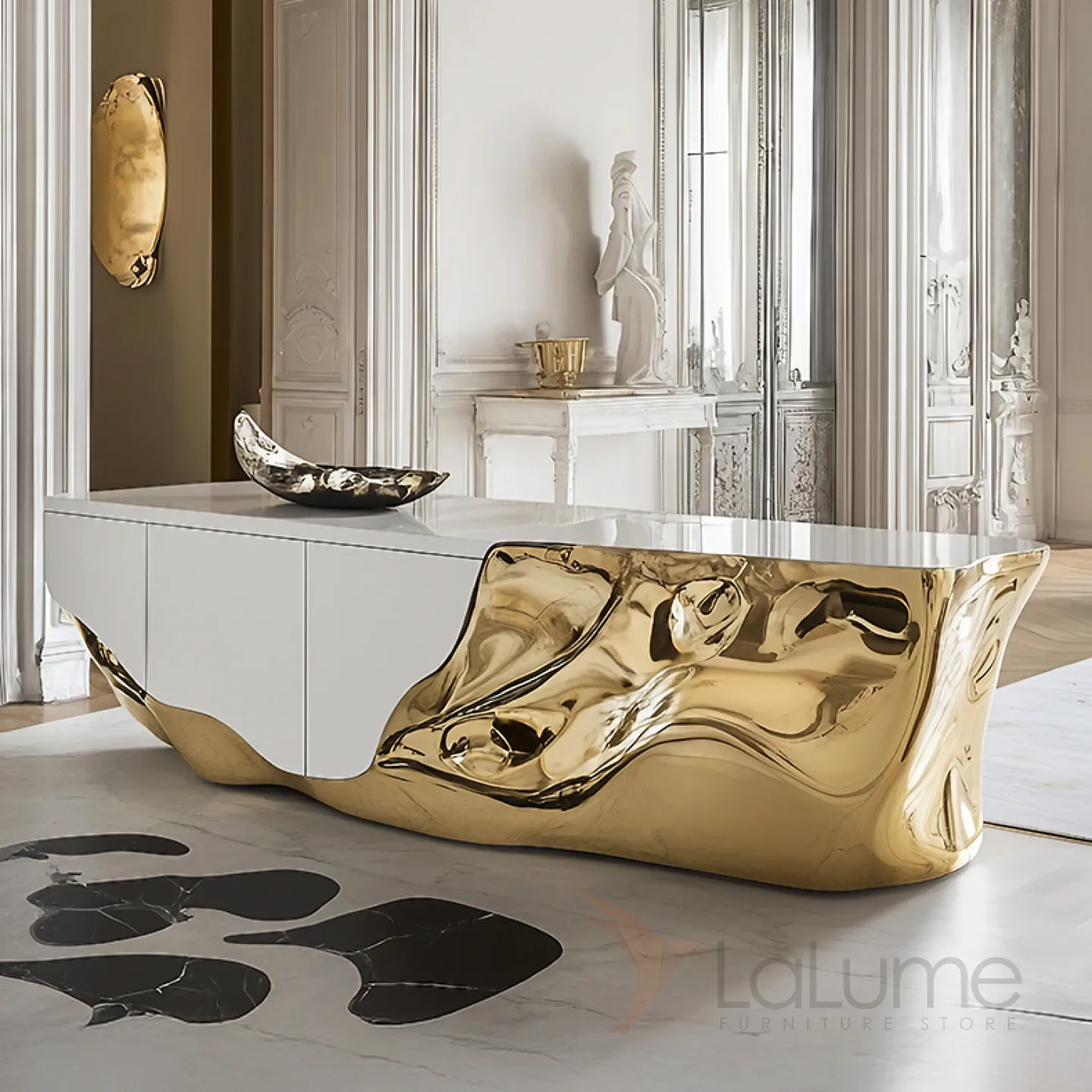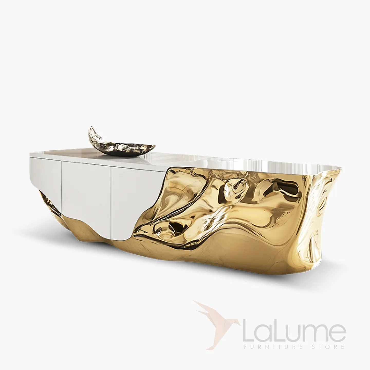 Элегантный комод объединяет классику и современные технологии. Золотой блеск добавляет ему изысканности. Он не только украшает интерьер, но и удобен в использовании: внутри два отделения с дверцами для хранения вещей.
