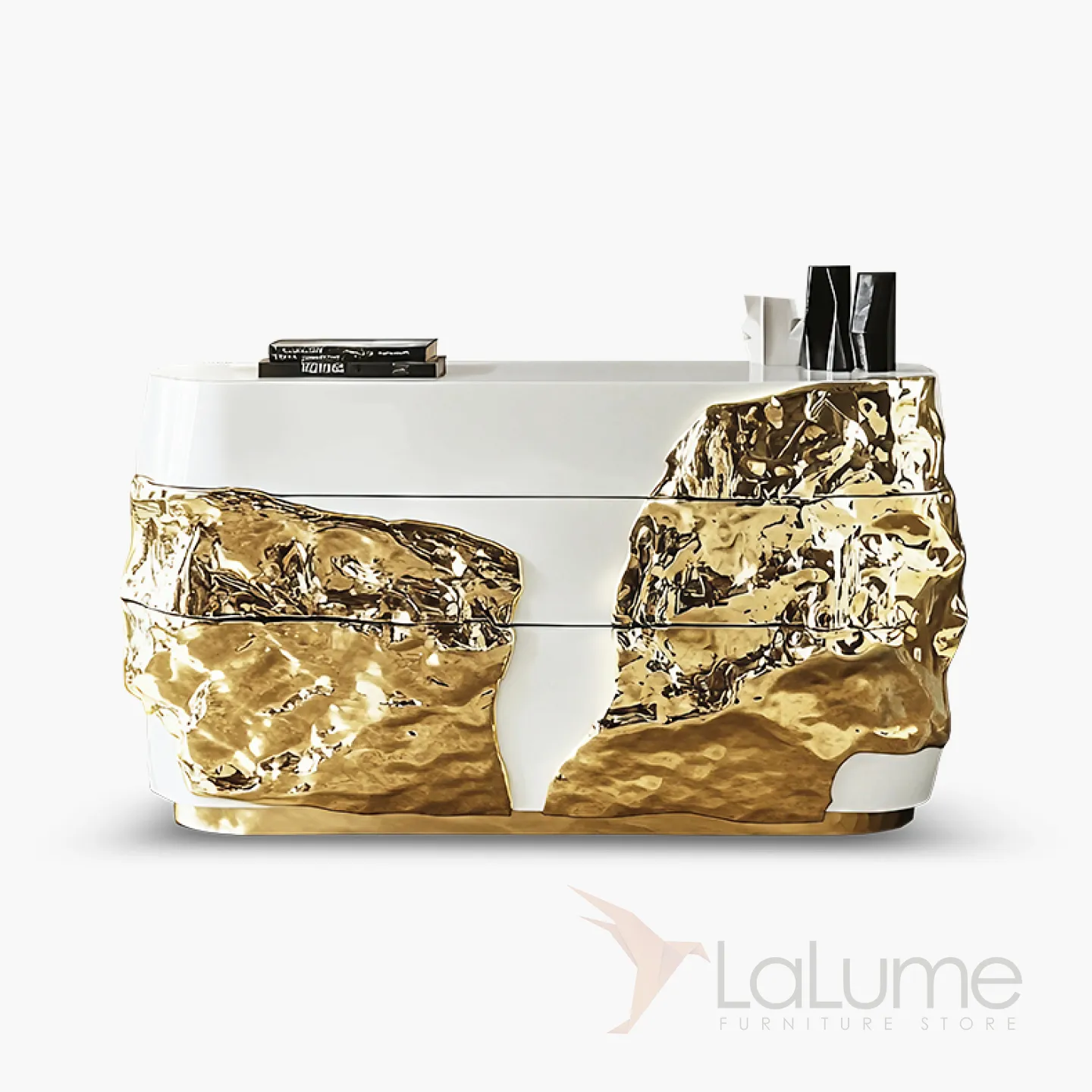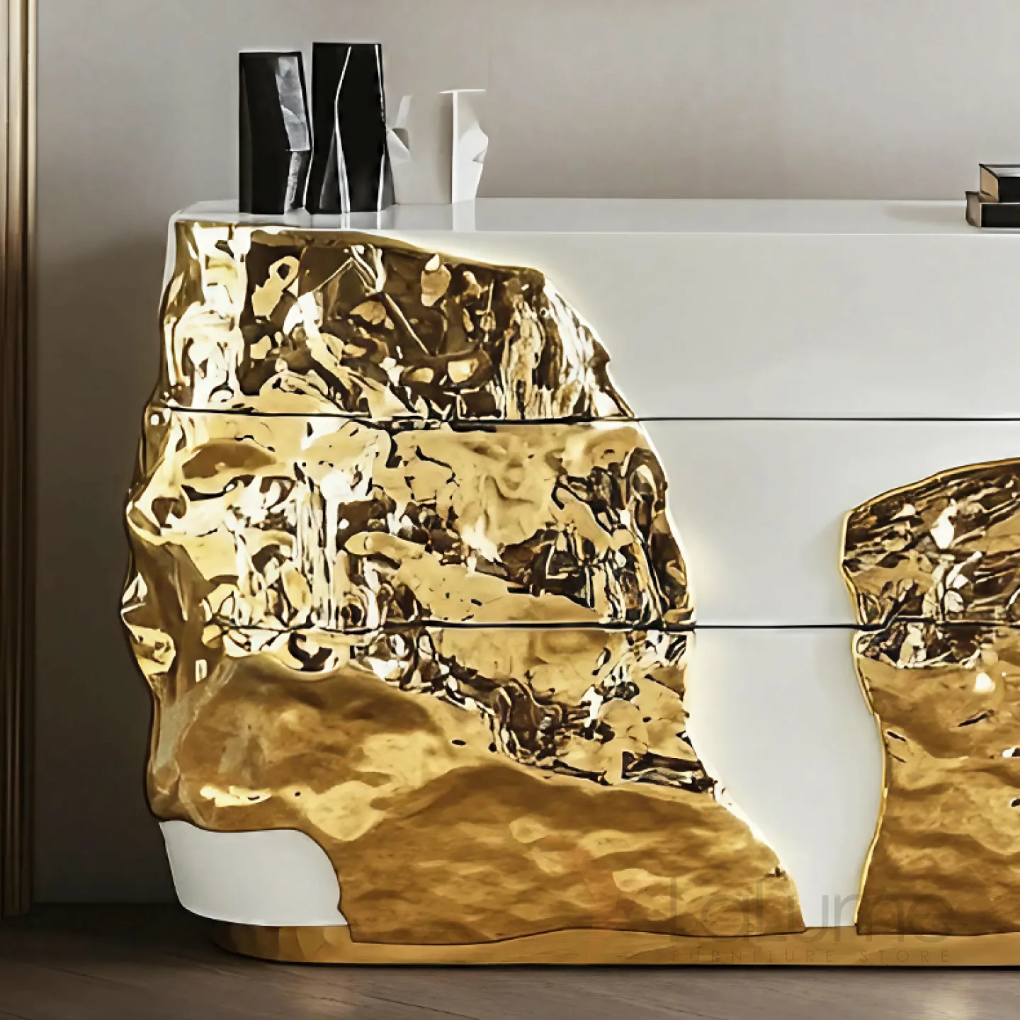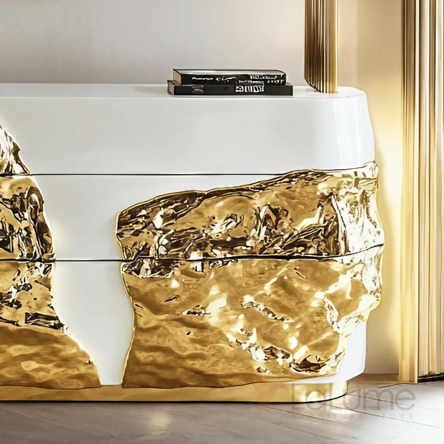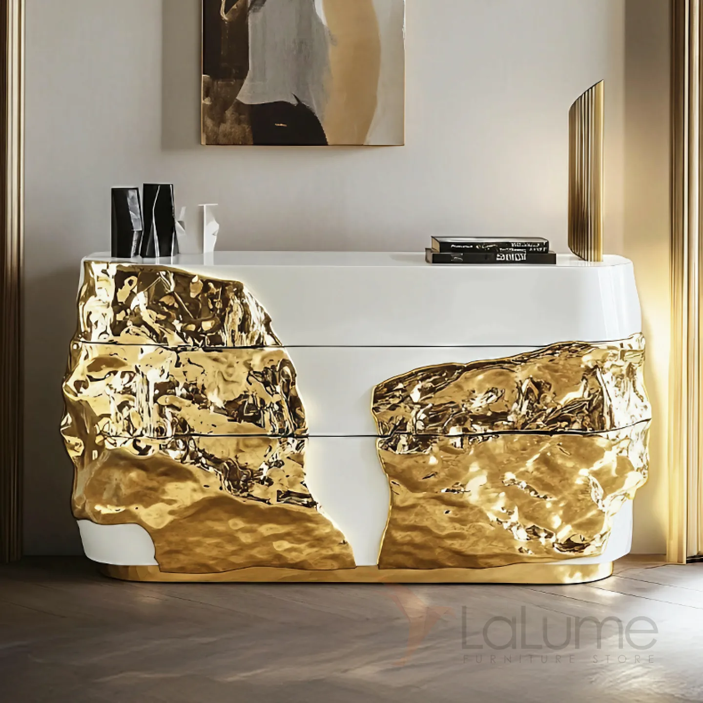 Изящный комод — воплощение элегантности. В нём сочетаются традиционные деревянные элементы и современные технологии, которые эффектно подчёркивает золотое сияние. Комод не только украшает интерьер, но и удобен в использовании благодаря вместительным выдвижным ящикам.