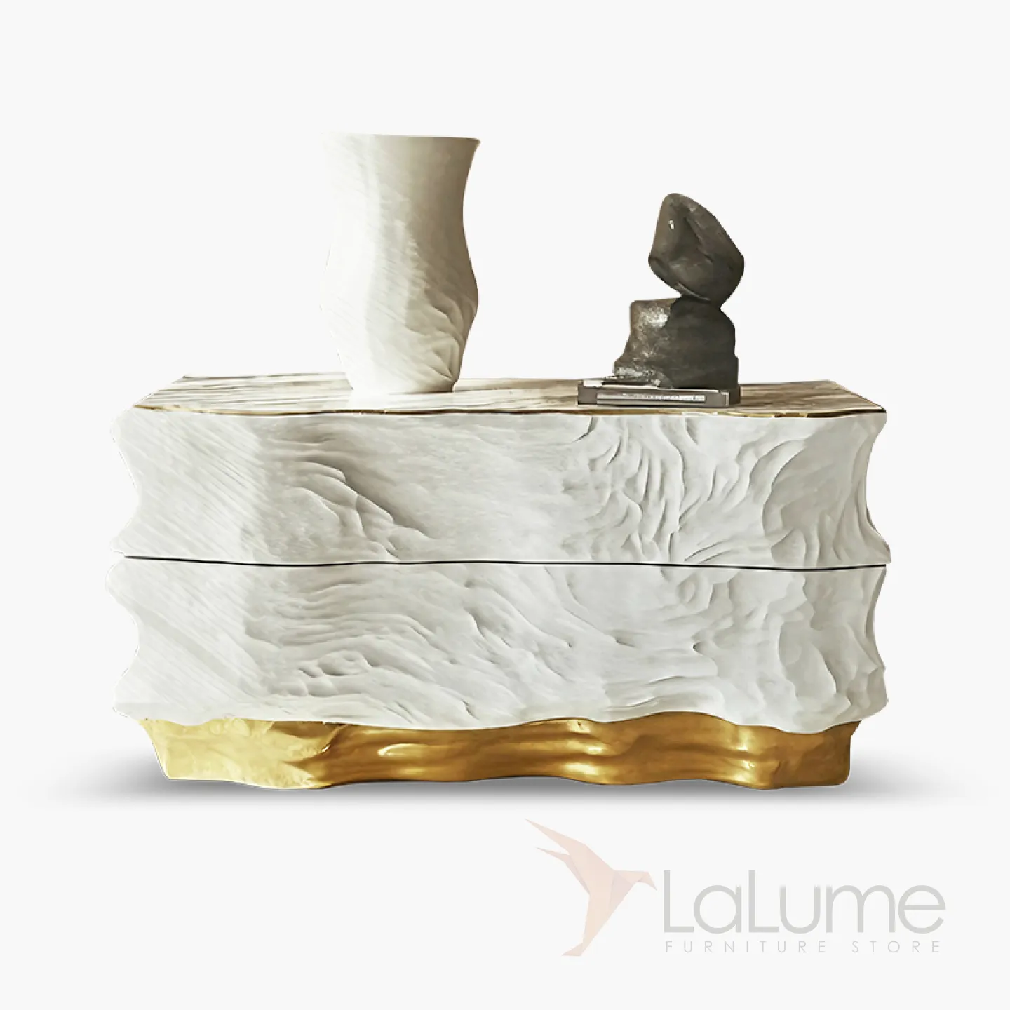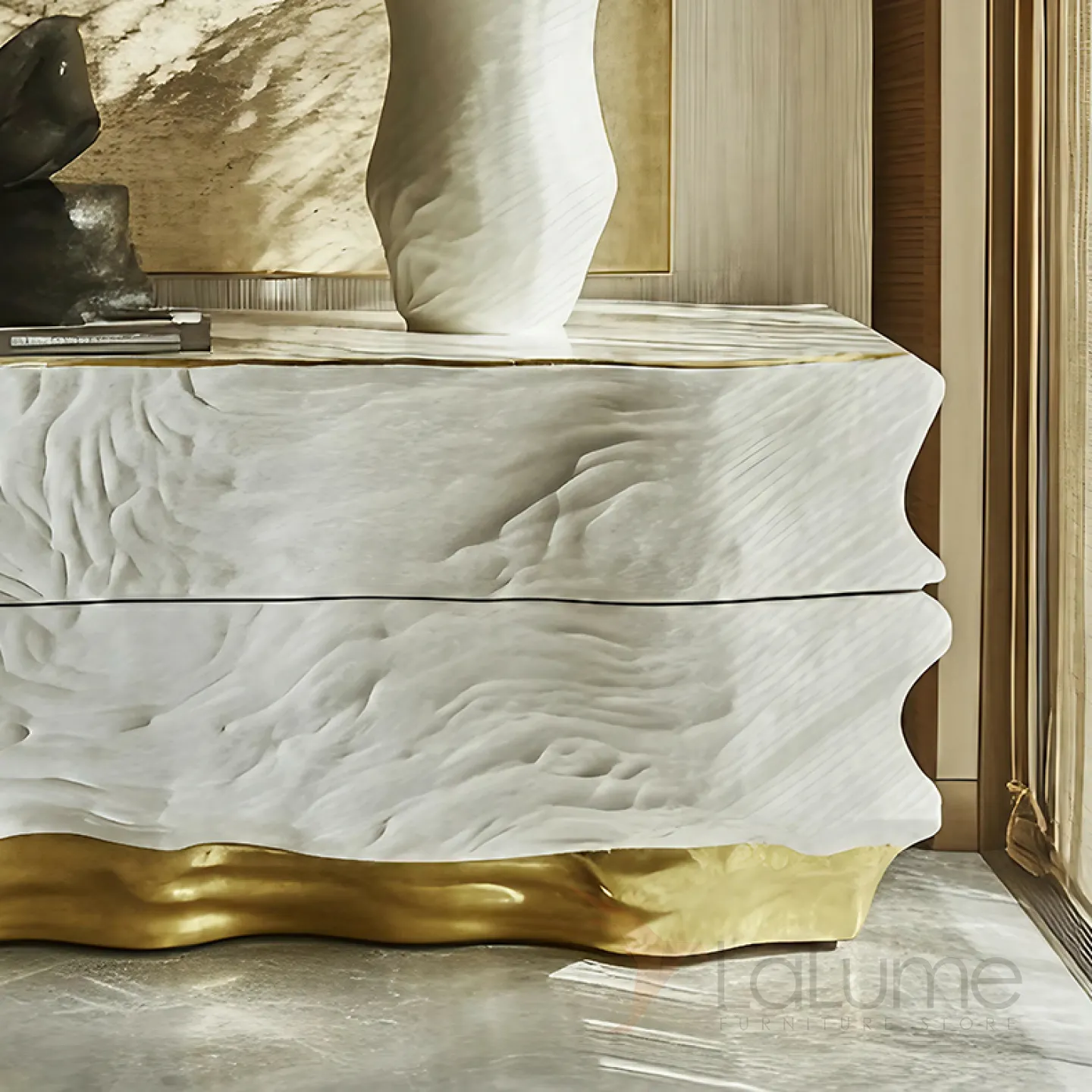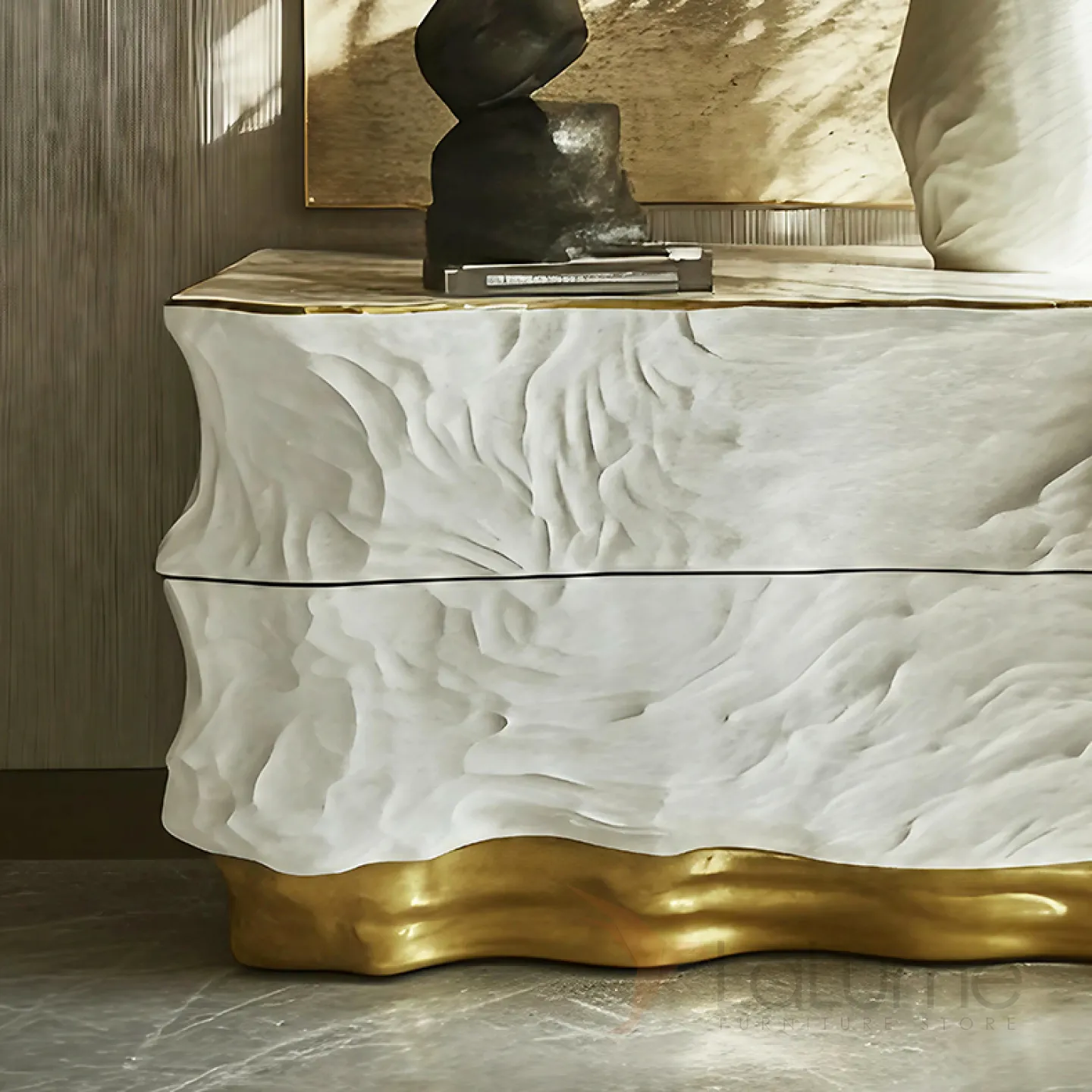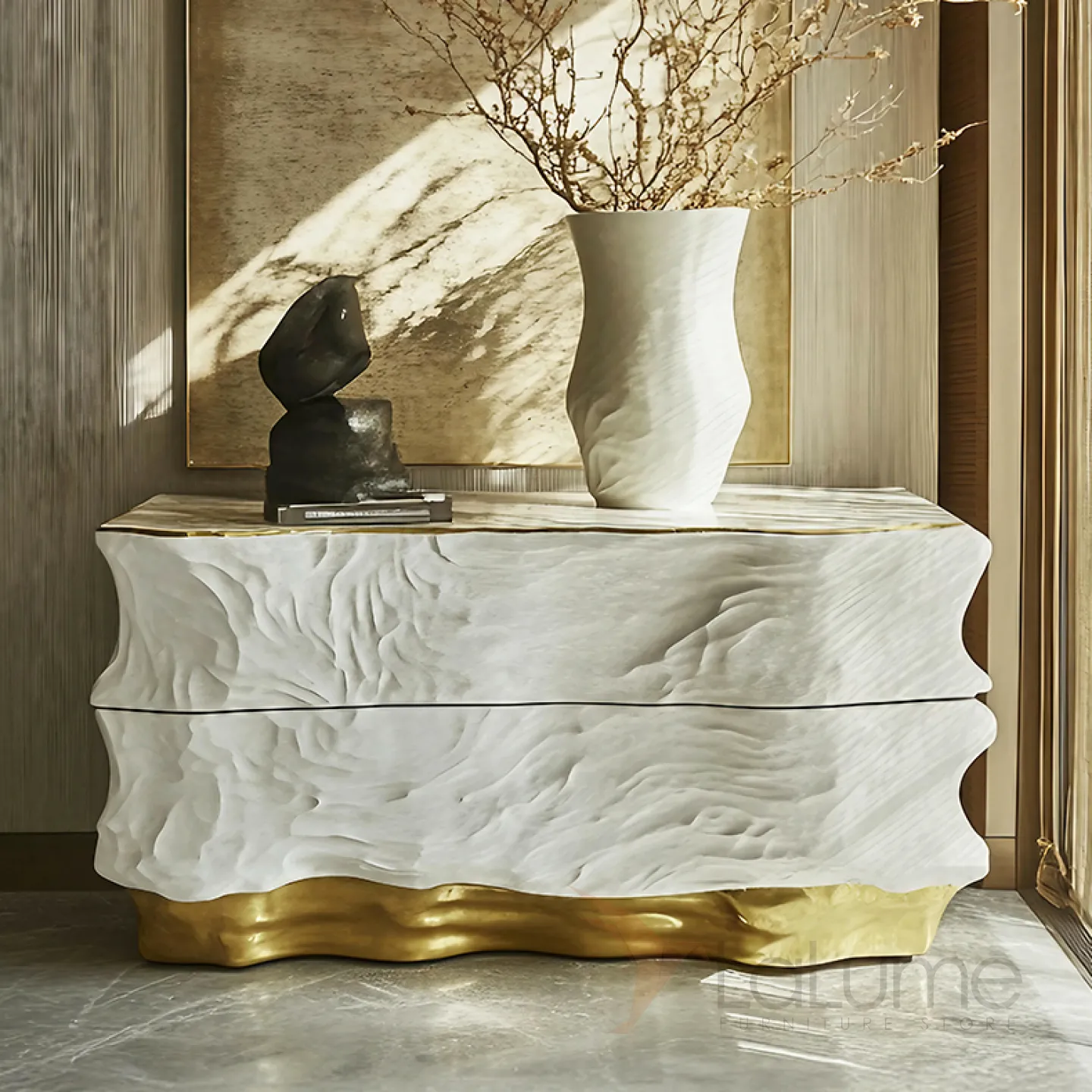 Красивый комод — это воплощение изящества. Он выполнен из дерева, но украшен современными элементами. Золотистый цвет придаёт ему особую привлекательность. Этот комод не только стильно дополняет интерьер, но и невероятно функционален. Множество выдвижных ящичков позволяют удобно разместить все необходимые вещи.