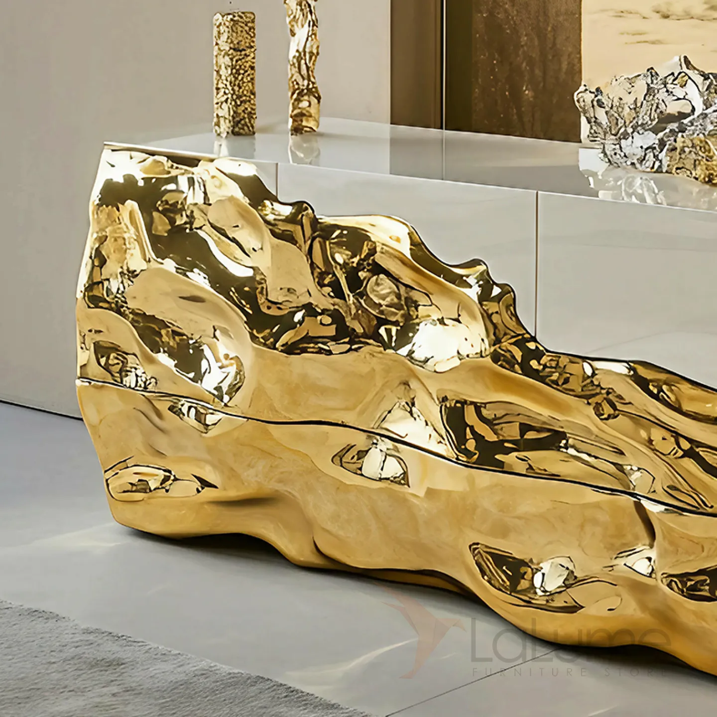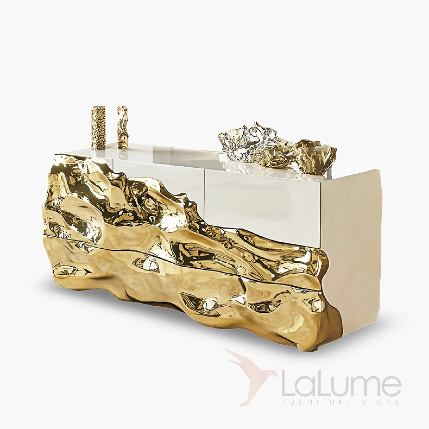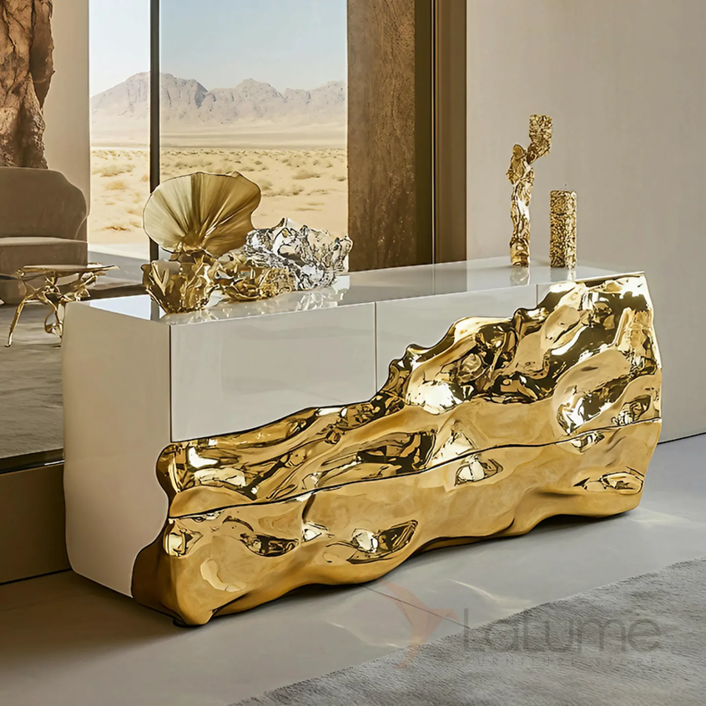 Изящный комод — это воплощение элегантности и стиля. В его дизайне гармонично сочетаются традиционные дерево и современные технологии, которые подчёркиваются золотым блеском. Этот предмет мебели не только украшает пространство, но и практичен, ведь у него есть выдвижной ящик.