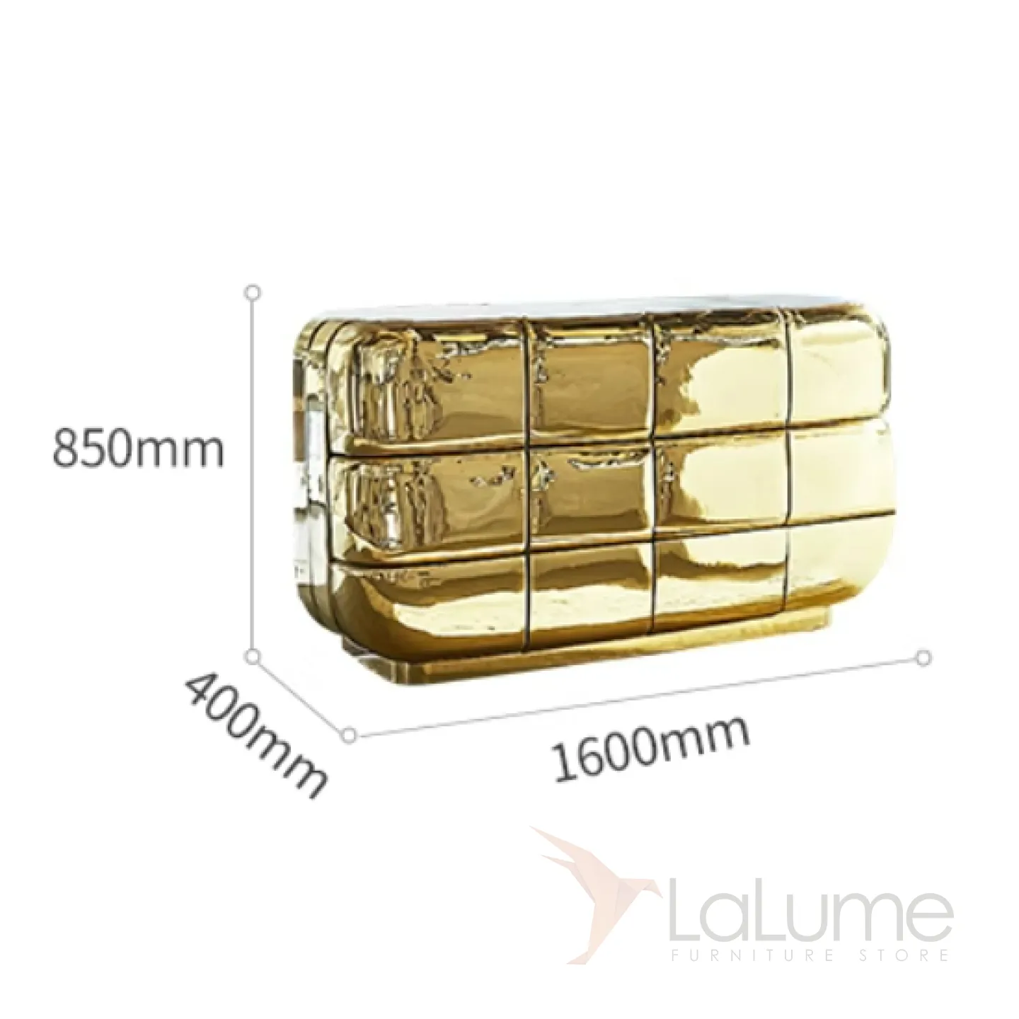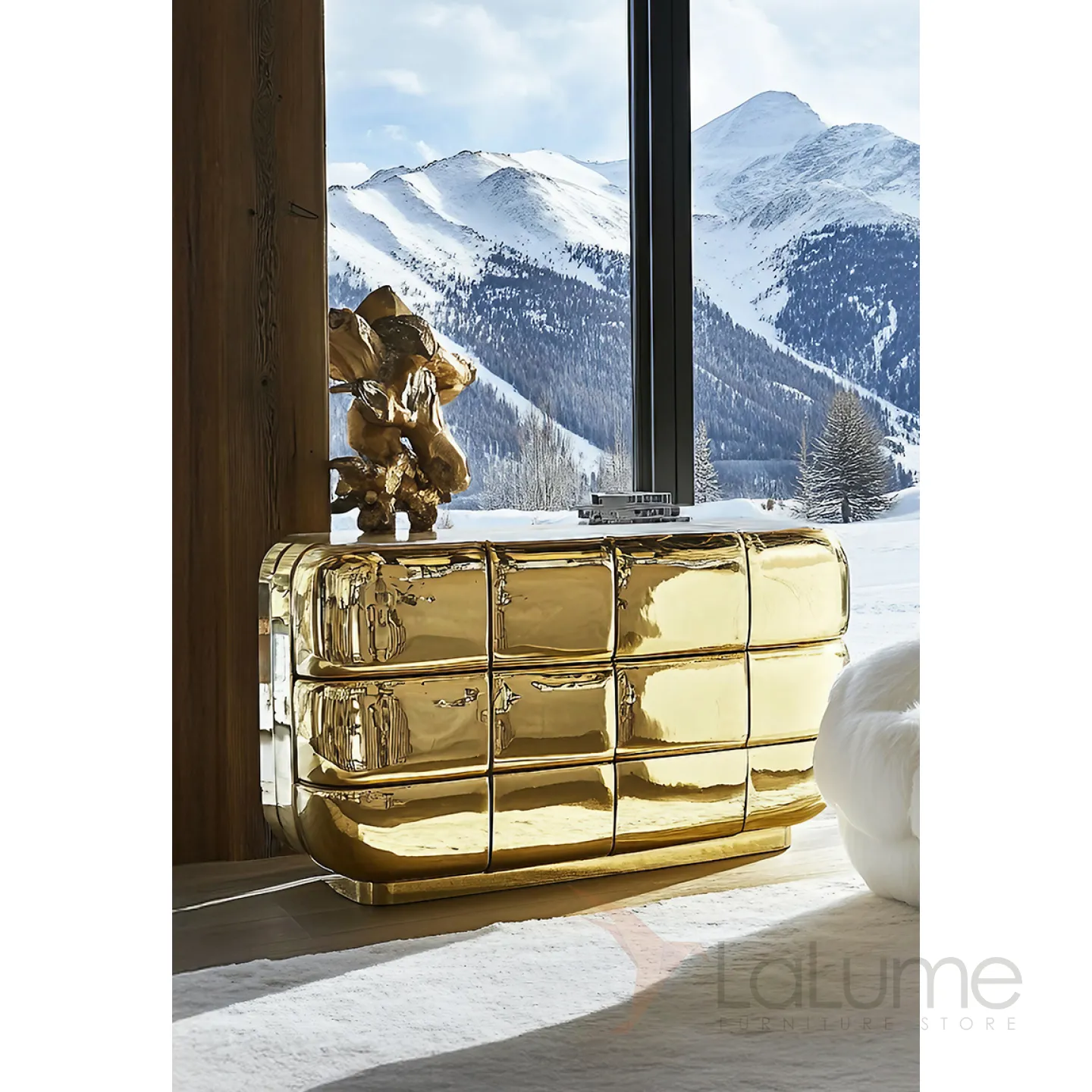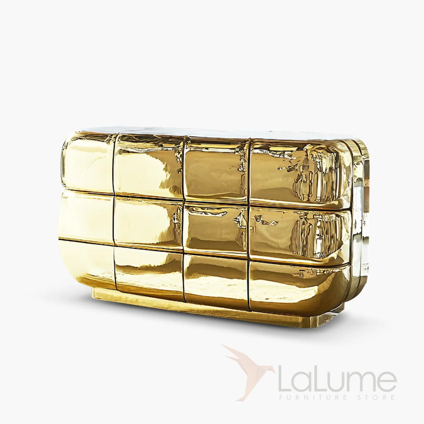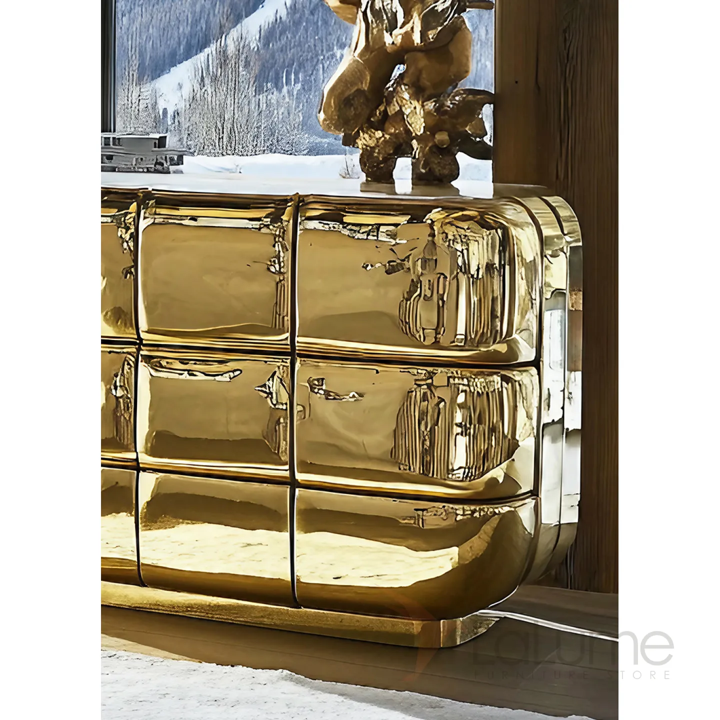 Изысканный комод из дерева с золотым покрытием сразу привлечет взгляды. Двенадцать выдвижных ящиков помогут организовать хранение вещей.