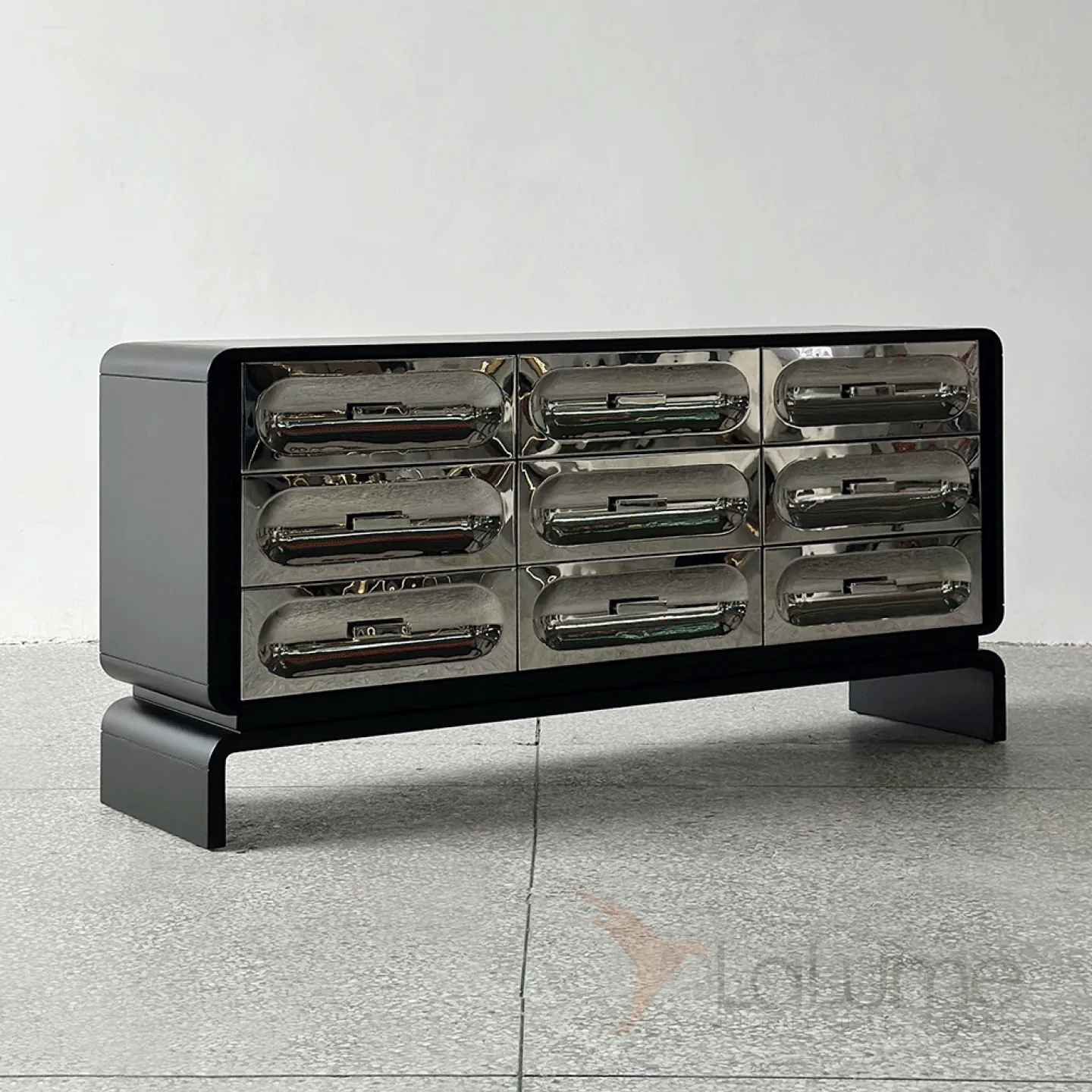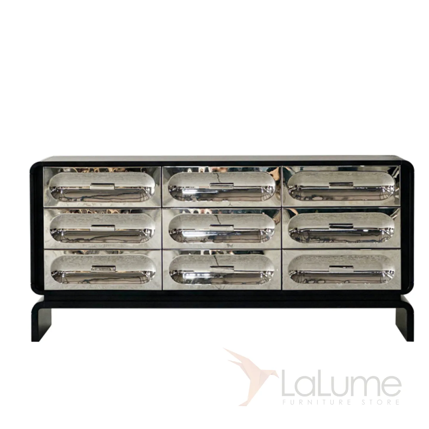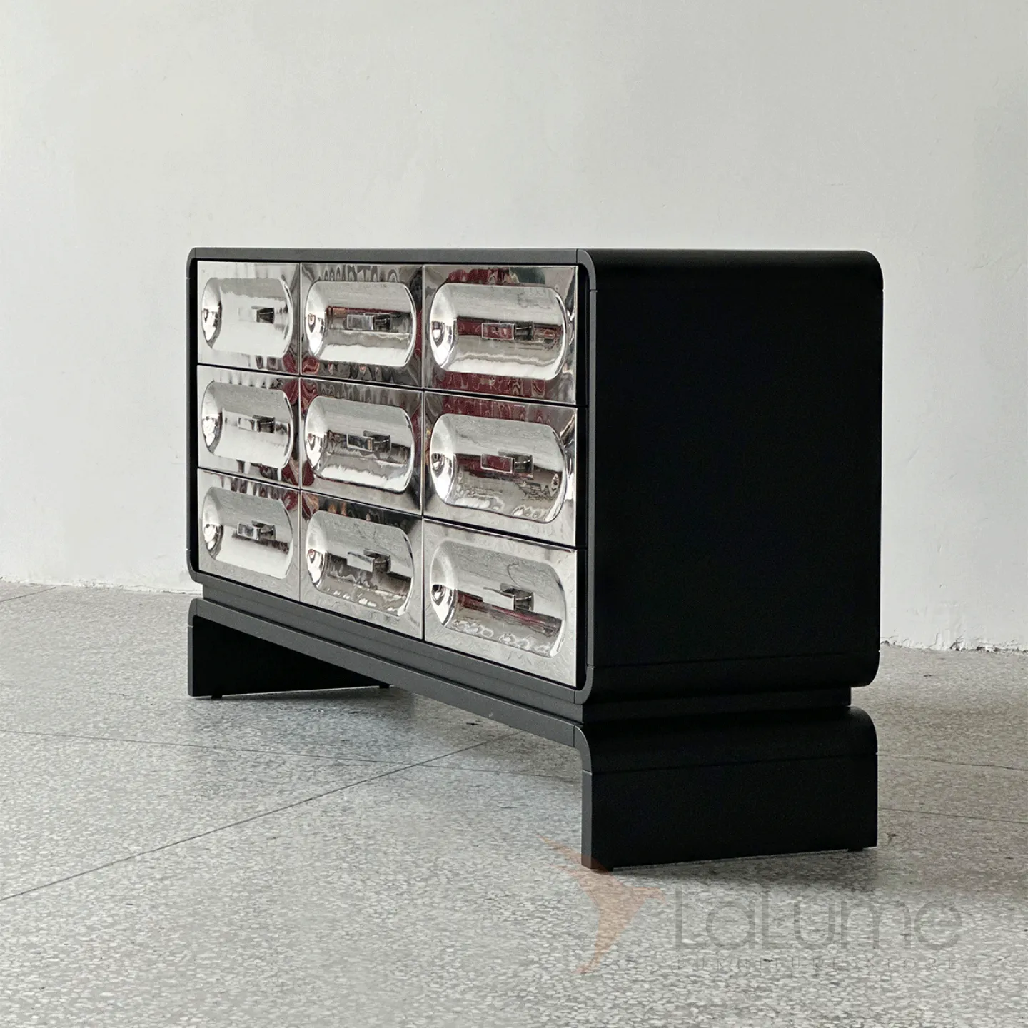 Изящный комод, выполненный из натурального дерева, имеет плавные очертания и оригинальные ножки. Девять выдвижных ящиков декорированы фасадами из нержавеющей стали с рельефными изгибами.