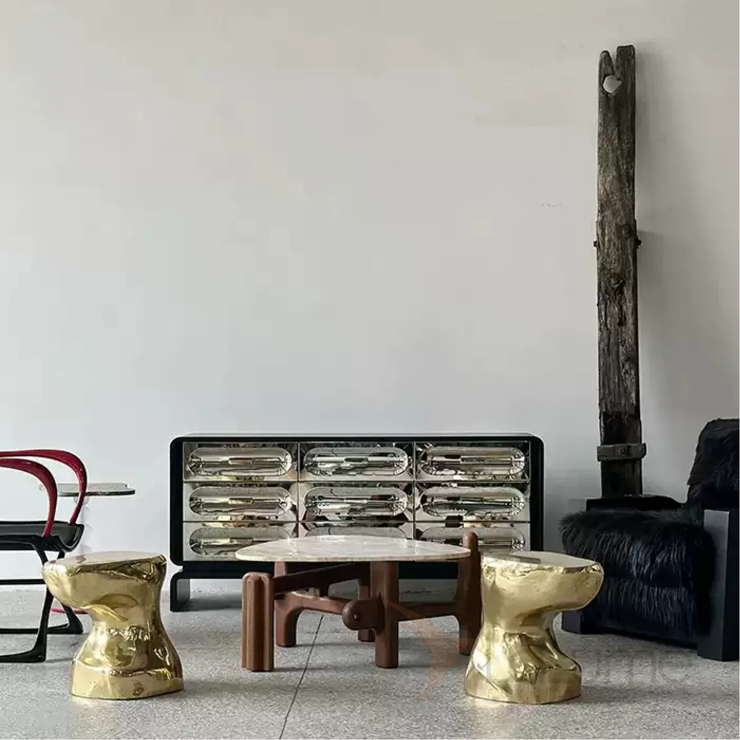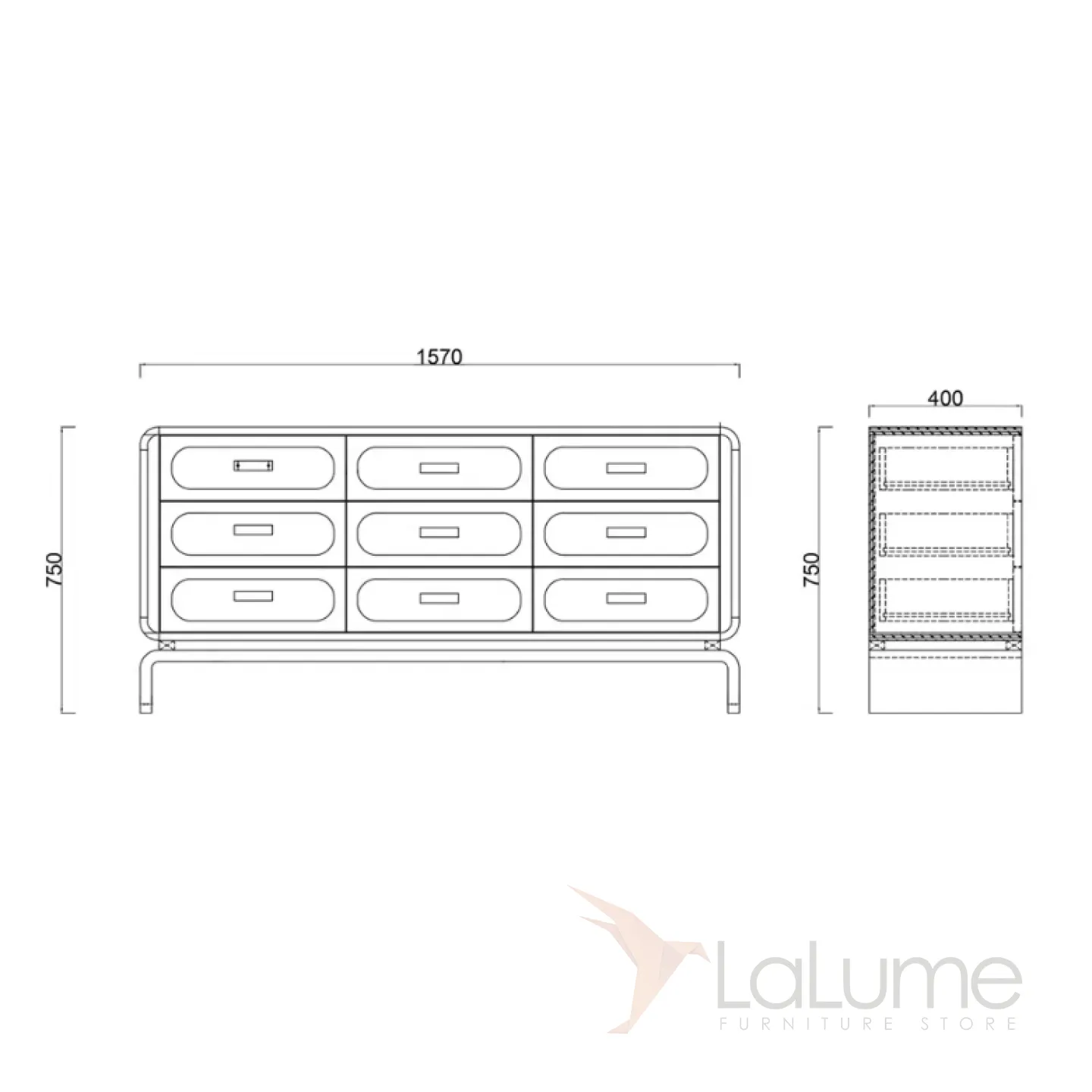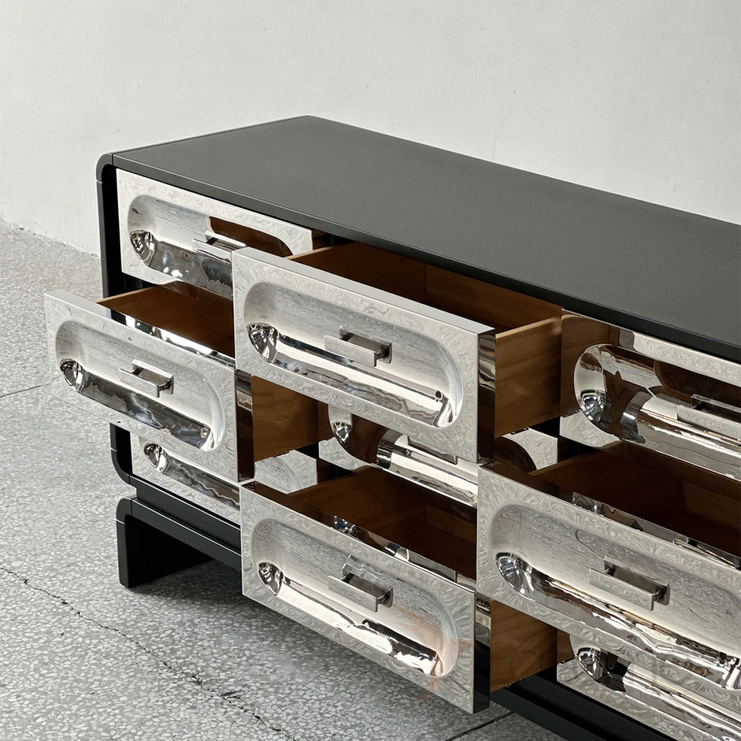 Изящный комод, выполненный из натурального дерева, имеет плавные очертания и оригинальные ножки. Девять выдвижных ящиков декорированы фасадами из нержавеющей стали с рельефными изгибами.