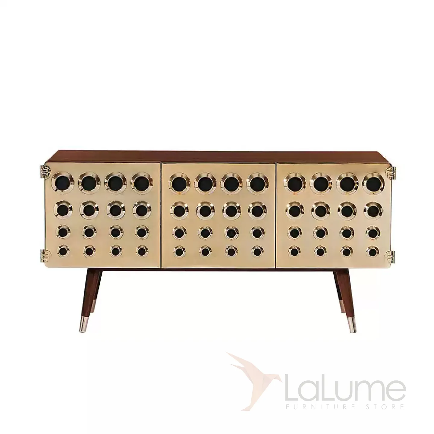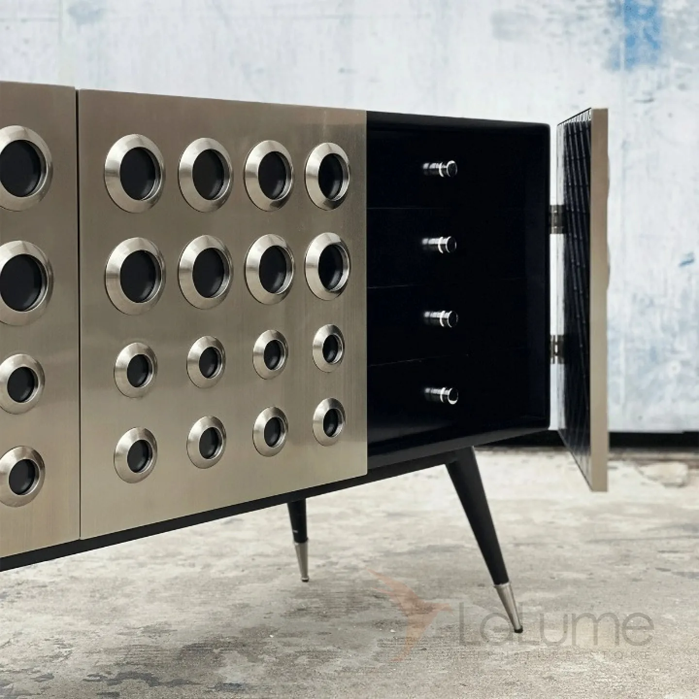 Шкаф-комод из натурального бука, который отличается практичностью и удобством в использовании. Его фасад выполнен из качественного шпона, а три дверцы с распашными механизмами изготовлены из нержавеющей стали. За ними скрываются четыре выдвижных ящика.