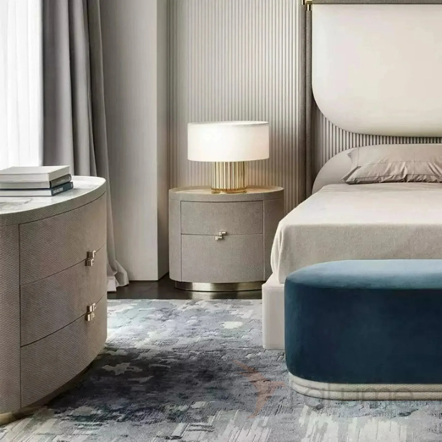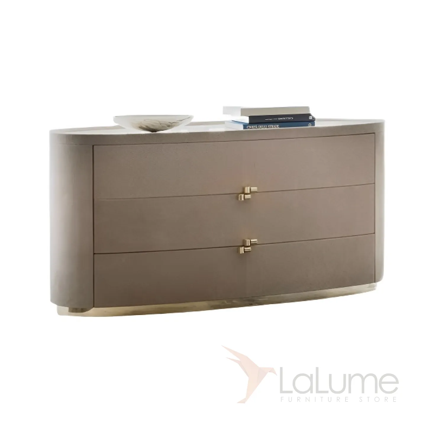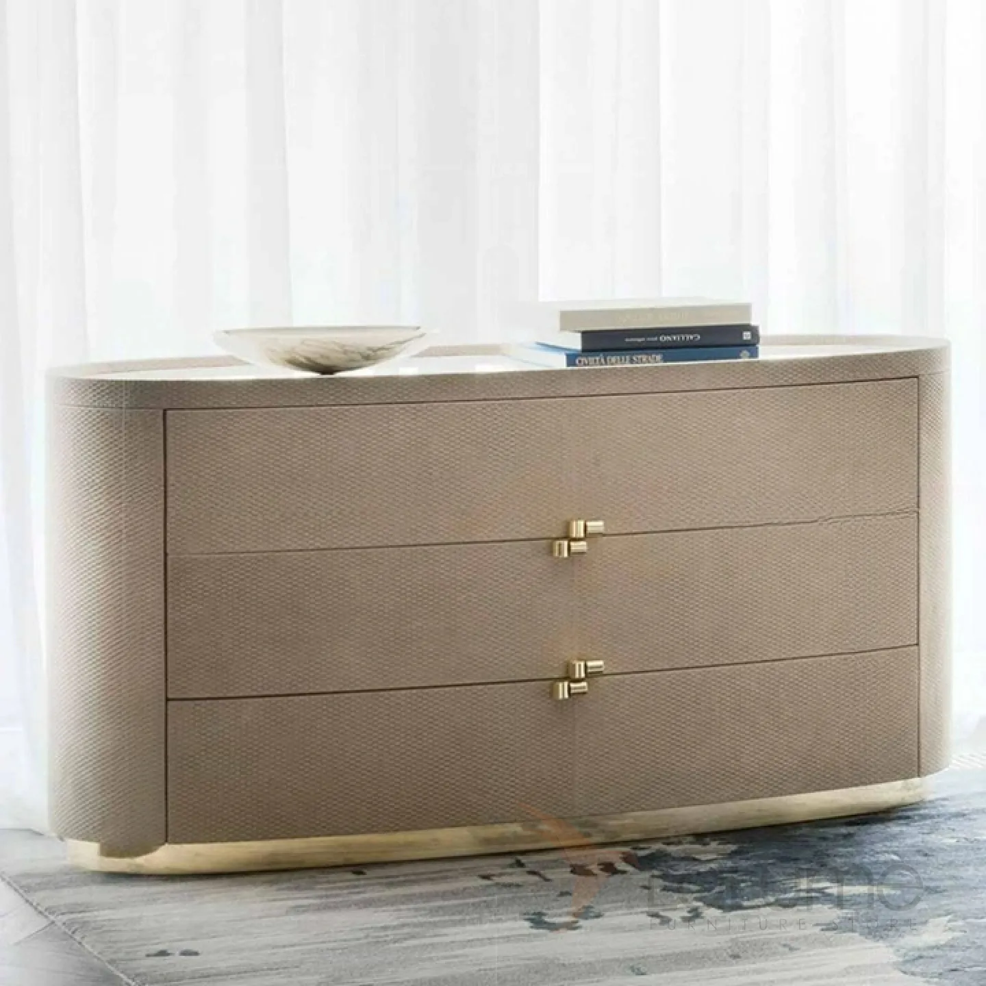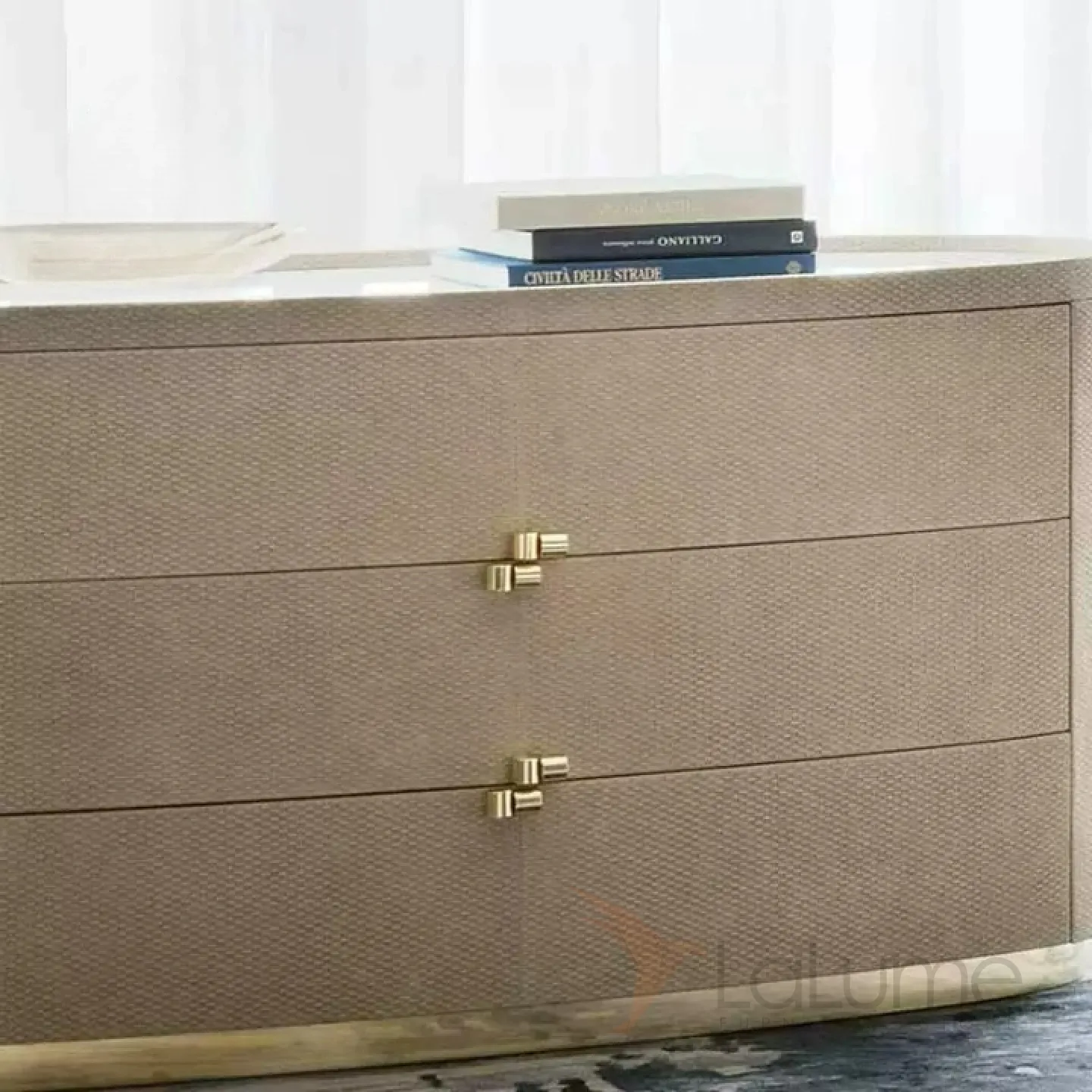 Комод из березы с тисненой кожей и ножкой из нержавеющей стали. Столешница из белого мрамора. Три выдвижных ящика обеспечивают удобство и функциональность.