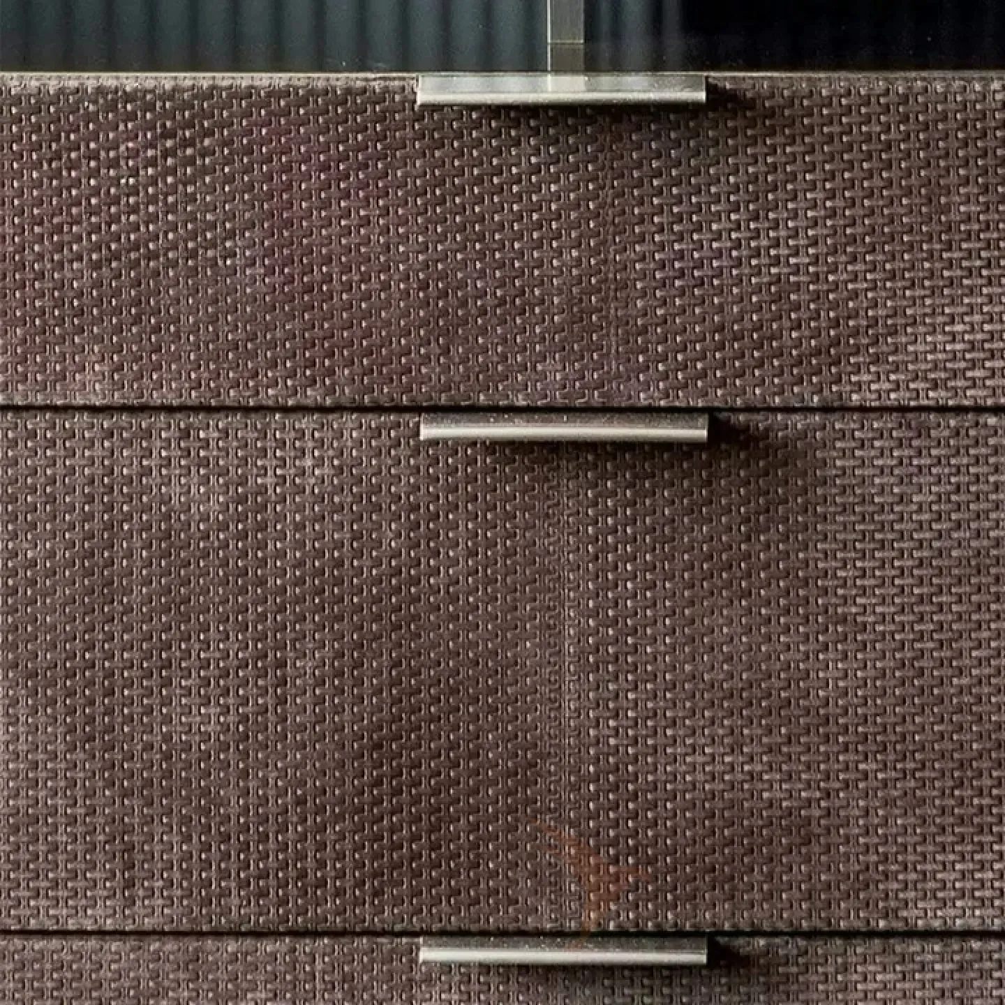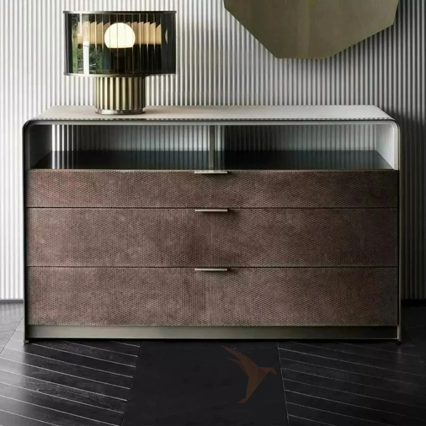 Удобный комод из дерева и нержавеющей стали, обит мягкой кожей из микрофибры. Три выдвижных ящика помогут организовать хранение вещей.