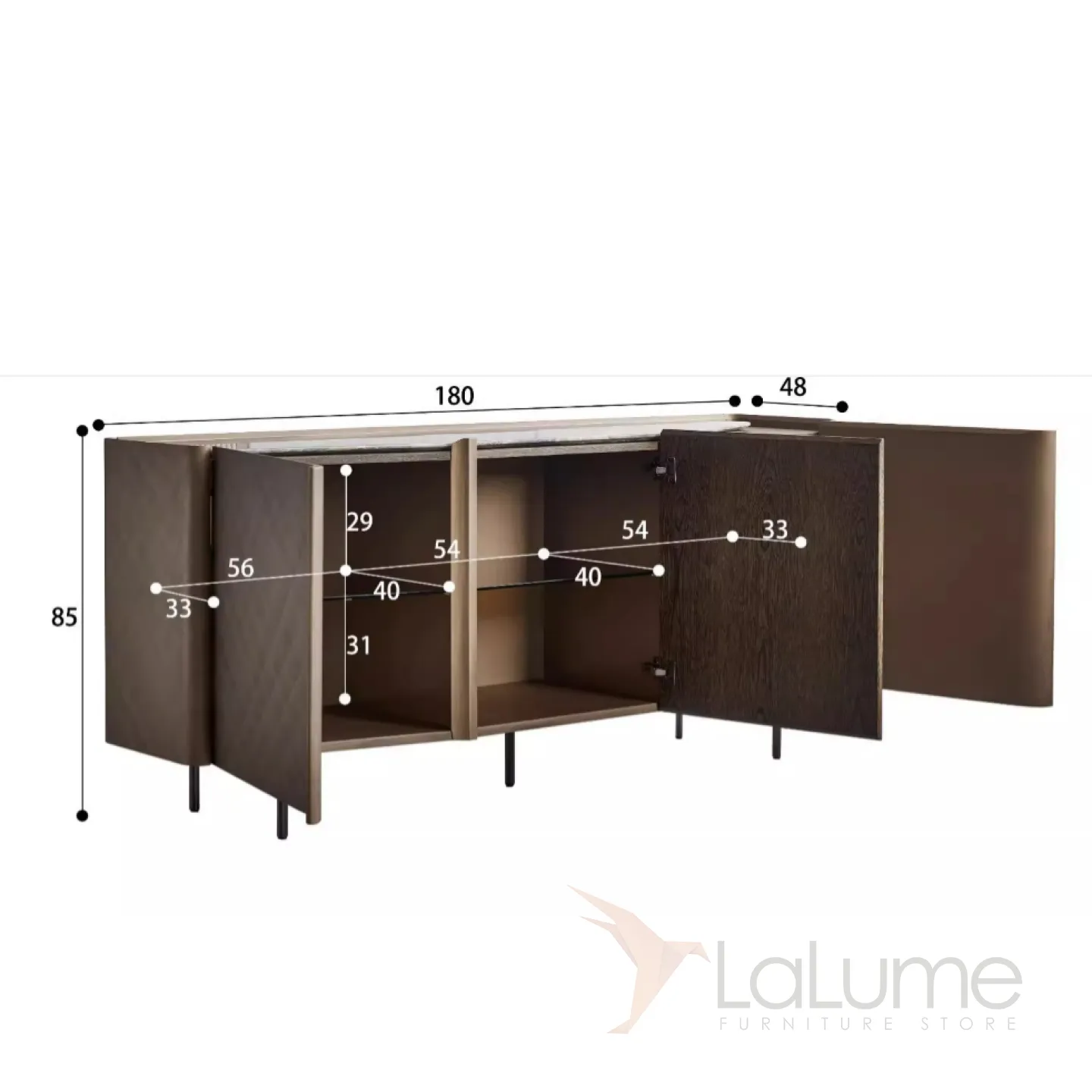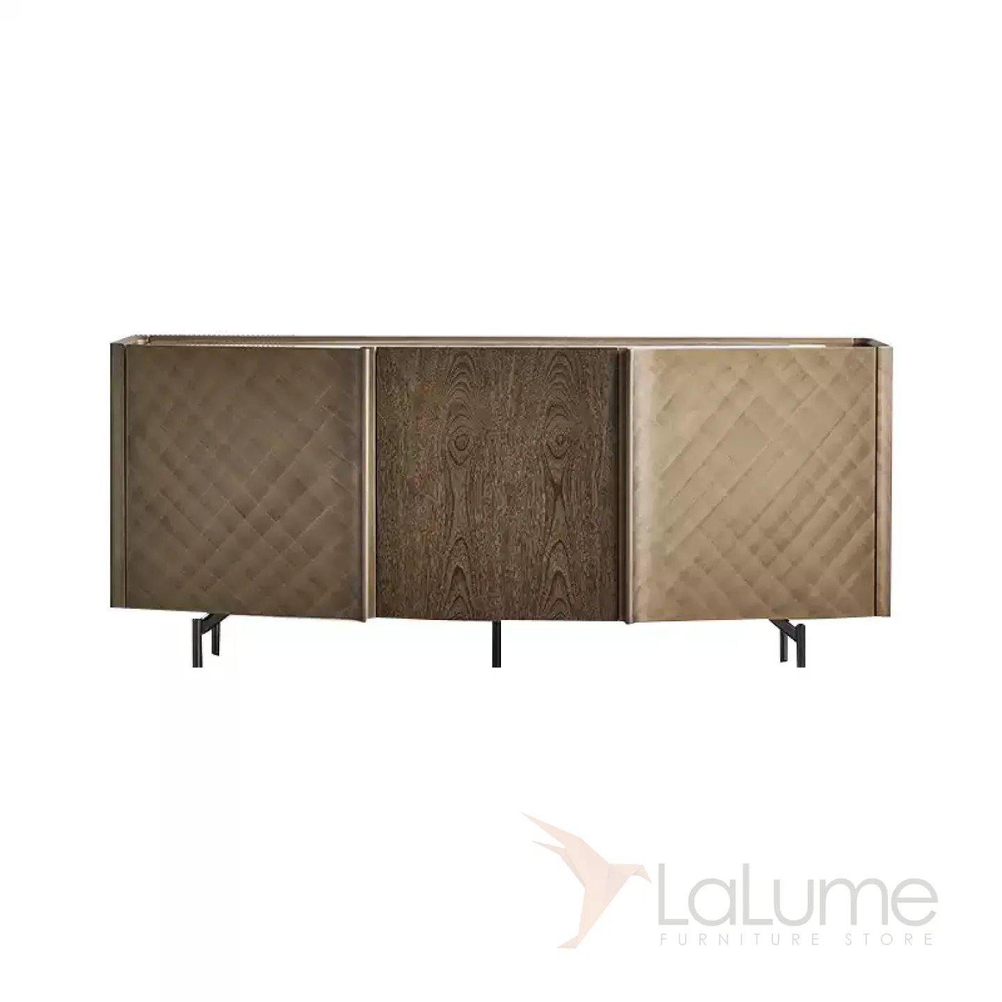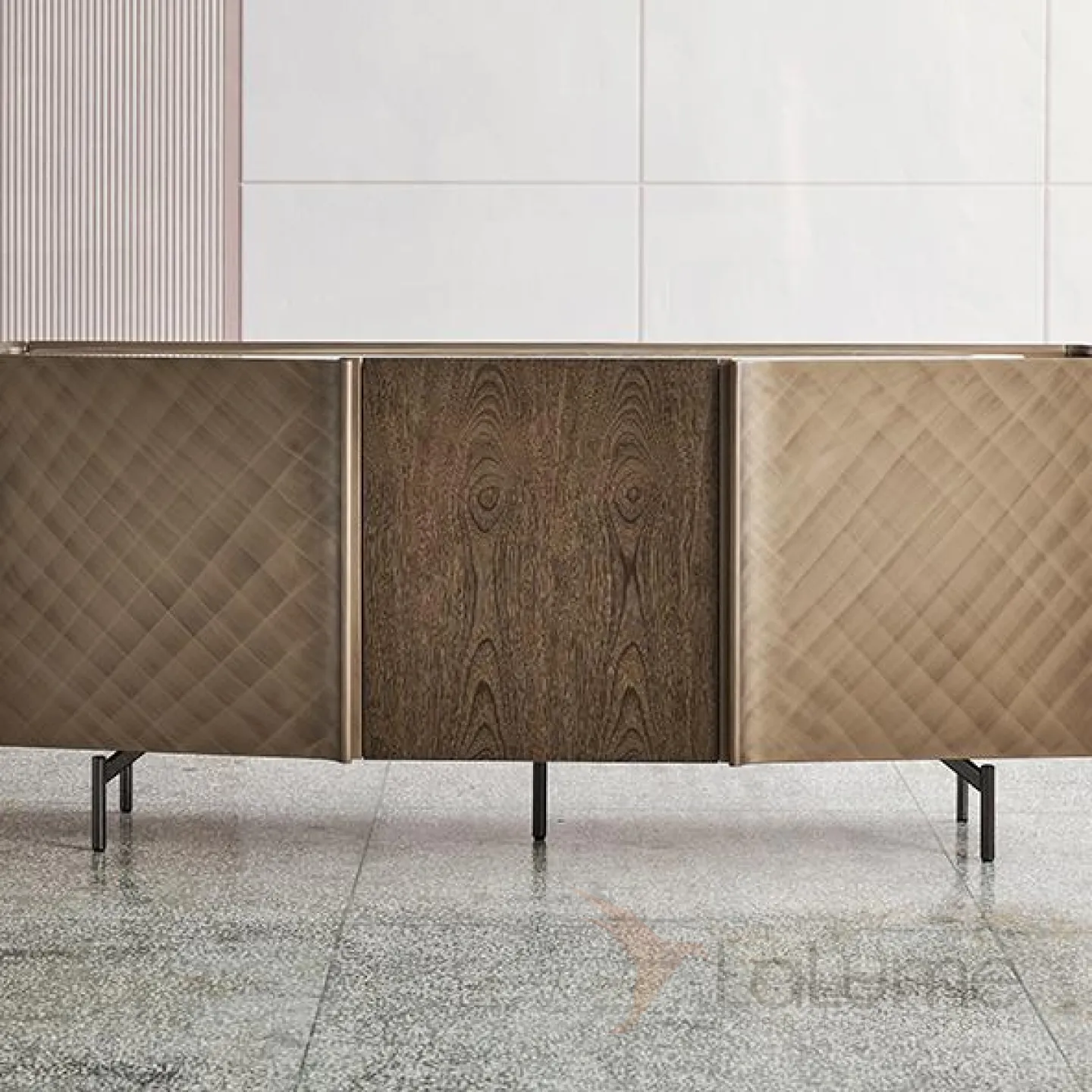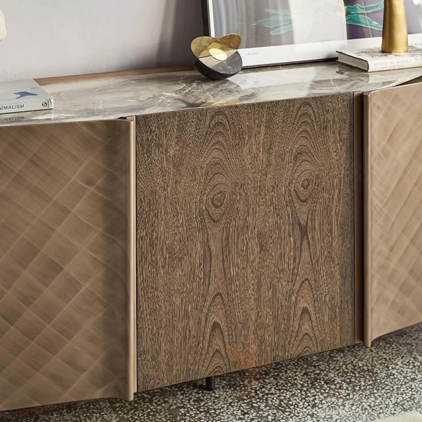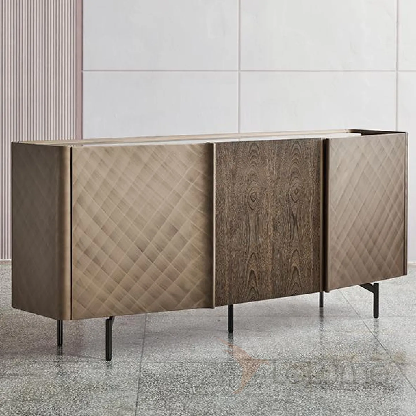 Комод из дерева украшен мраморной столешницей и встроенным тройным подсвечником. Оригинальный узор на дверцах добавляет особый шарм. Ножки выполнены из нержавеющей стали.
