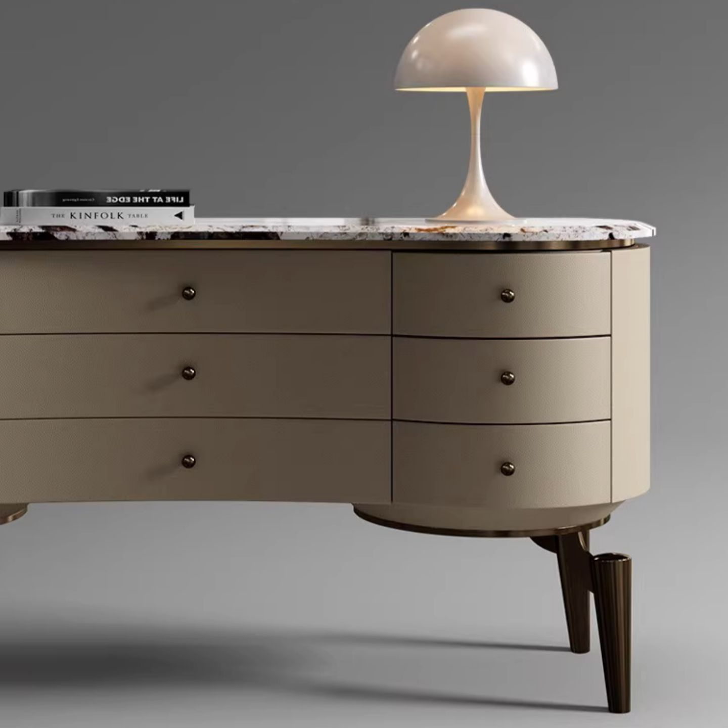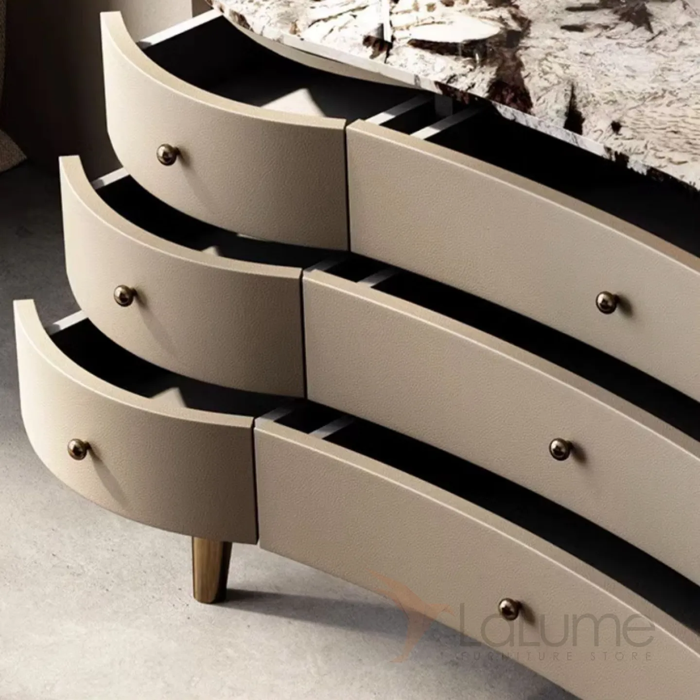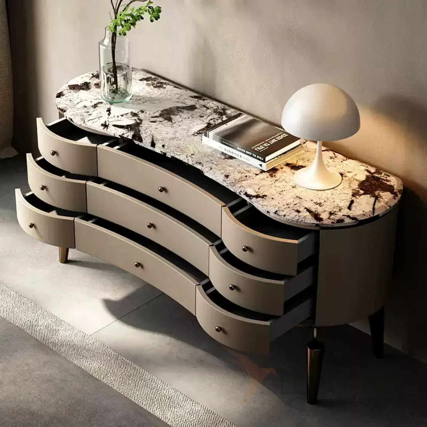 Комод из дерева с мраморной столешницей. Изящные ножки из нержавеющей стали. Девять выдвижных ящиков.