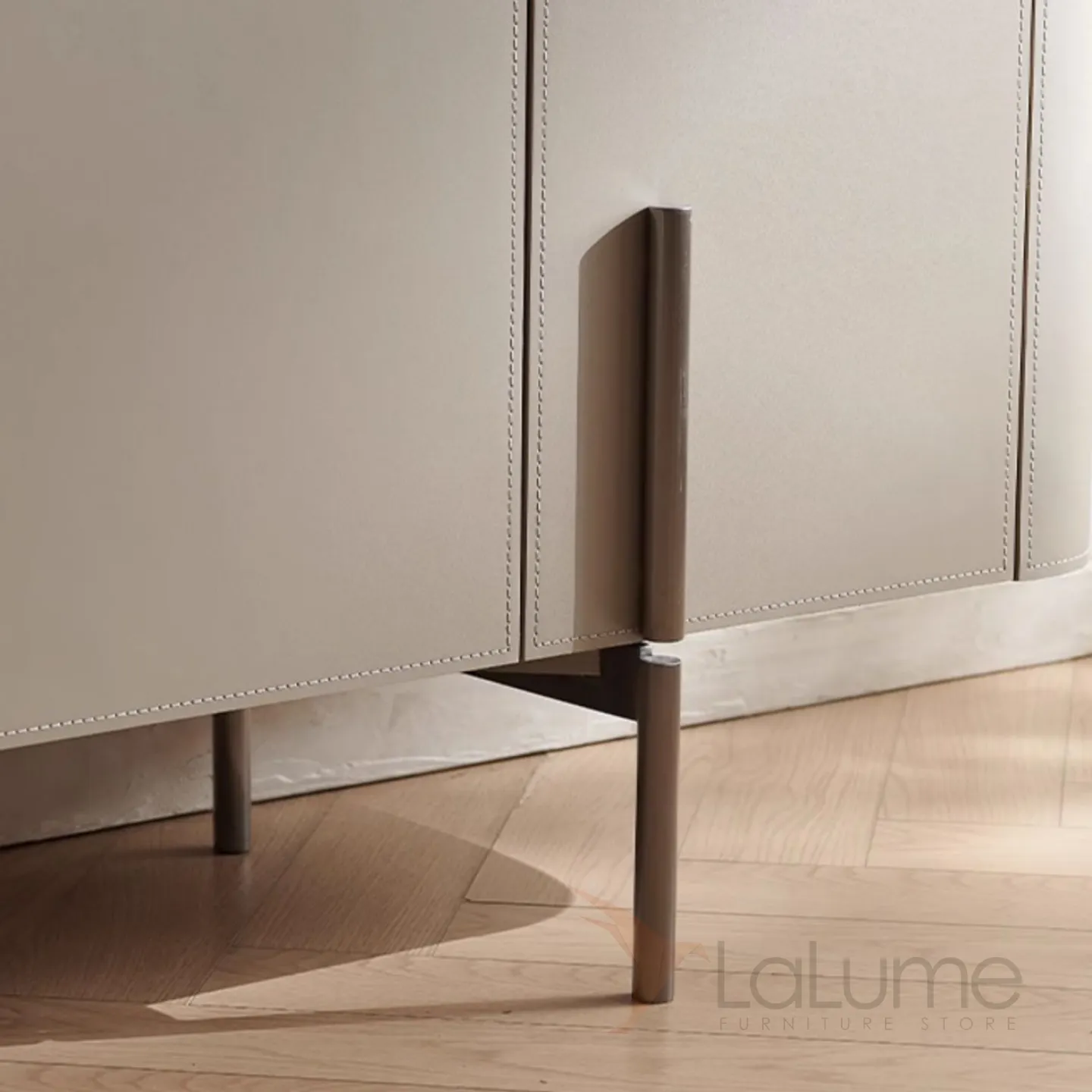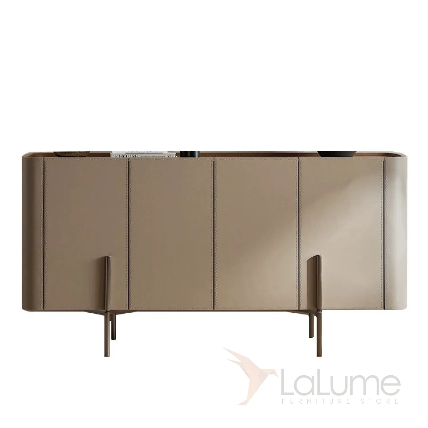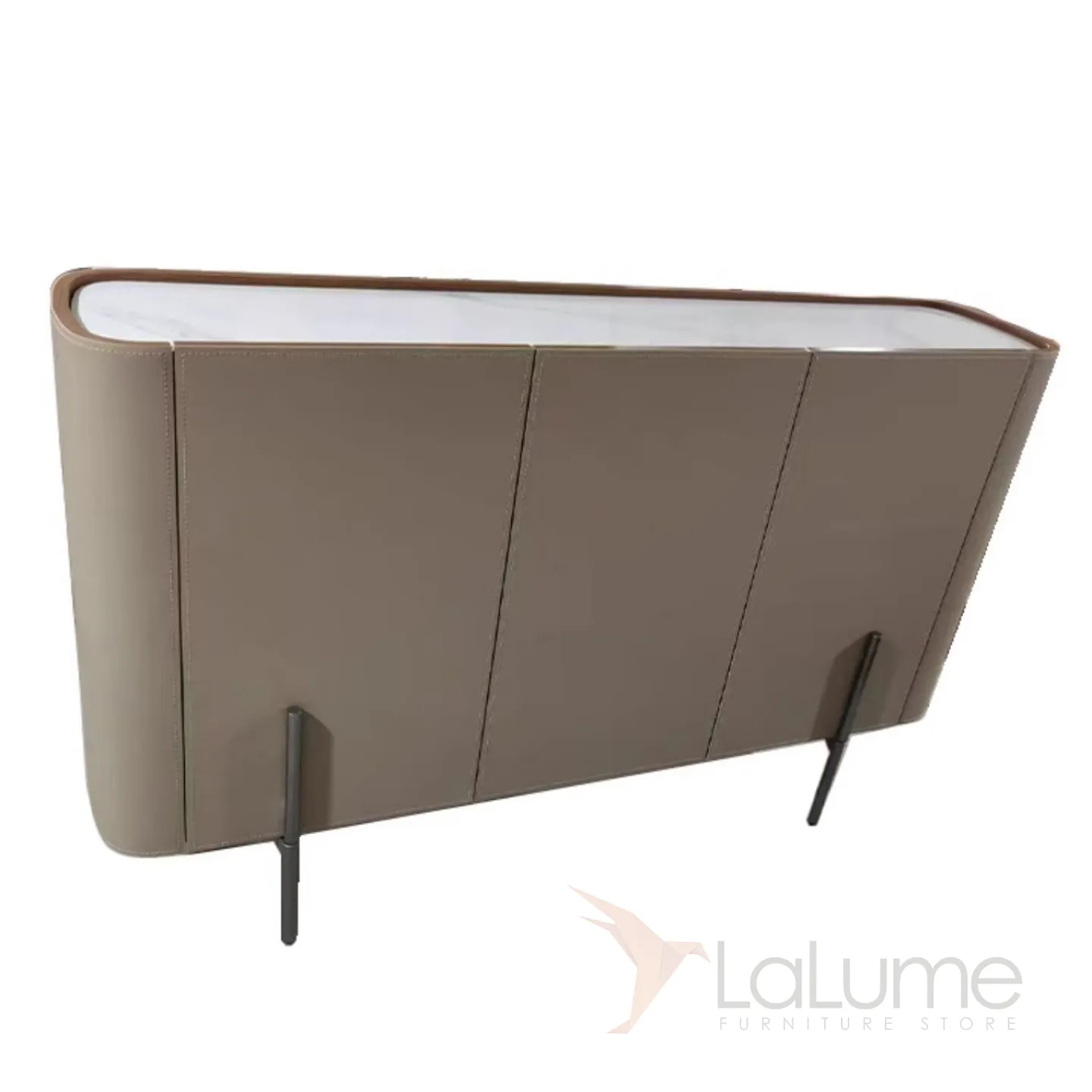 Комод с ножками из нержавеющей стали и деревянным корпусом, покрытым кожей. Столешница может быть кожаной или мраморной. Количество дверец варьируется в зависимости от длины комода: две, три или четыре.