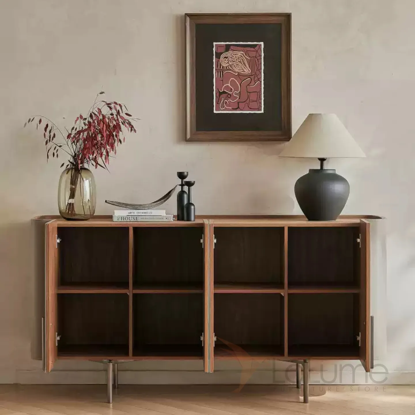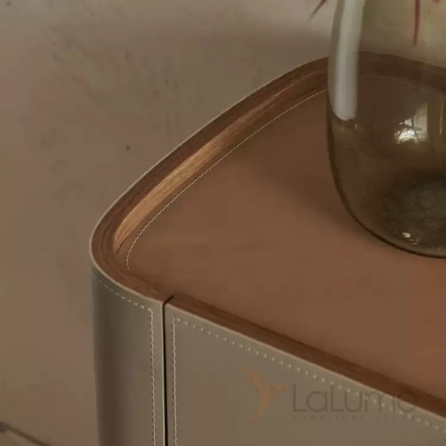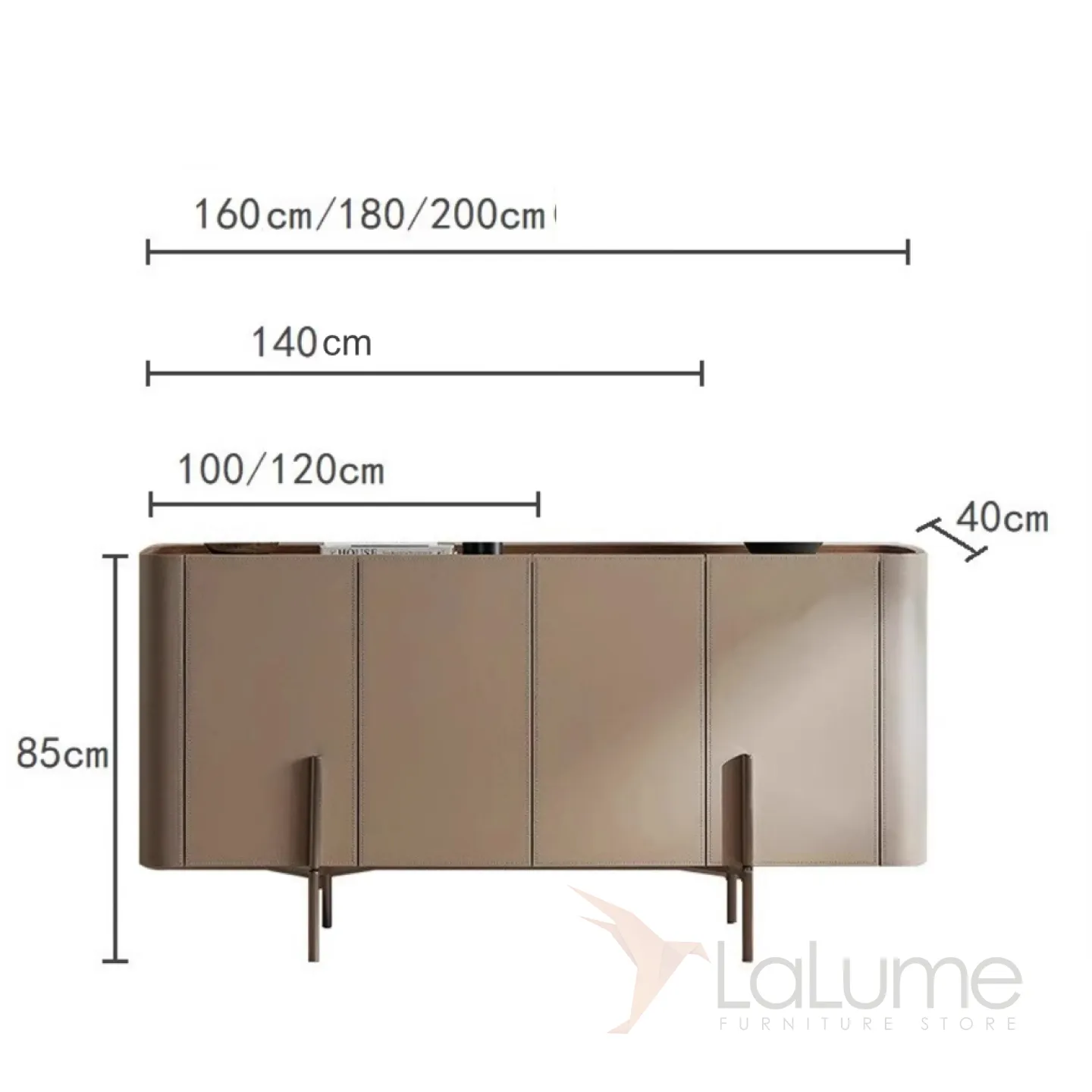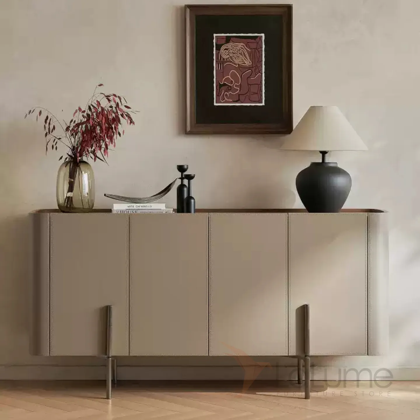Комод с ножками из нержавеющей стали и деревянным корпусом, покрытым кожей. Столешница может быть кожаной или мраморной. Количество дверец варьируется в зависимости от длины комода: две, три или четыре.