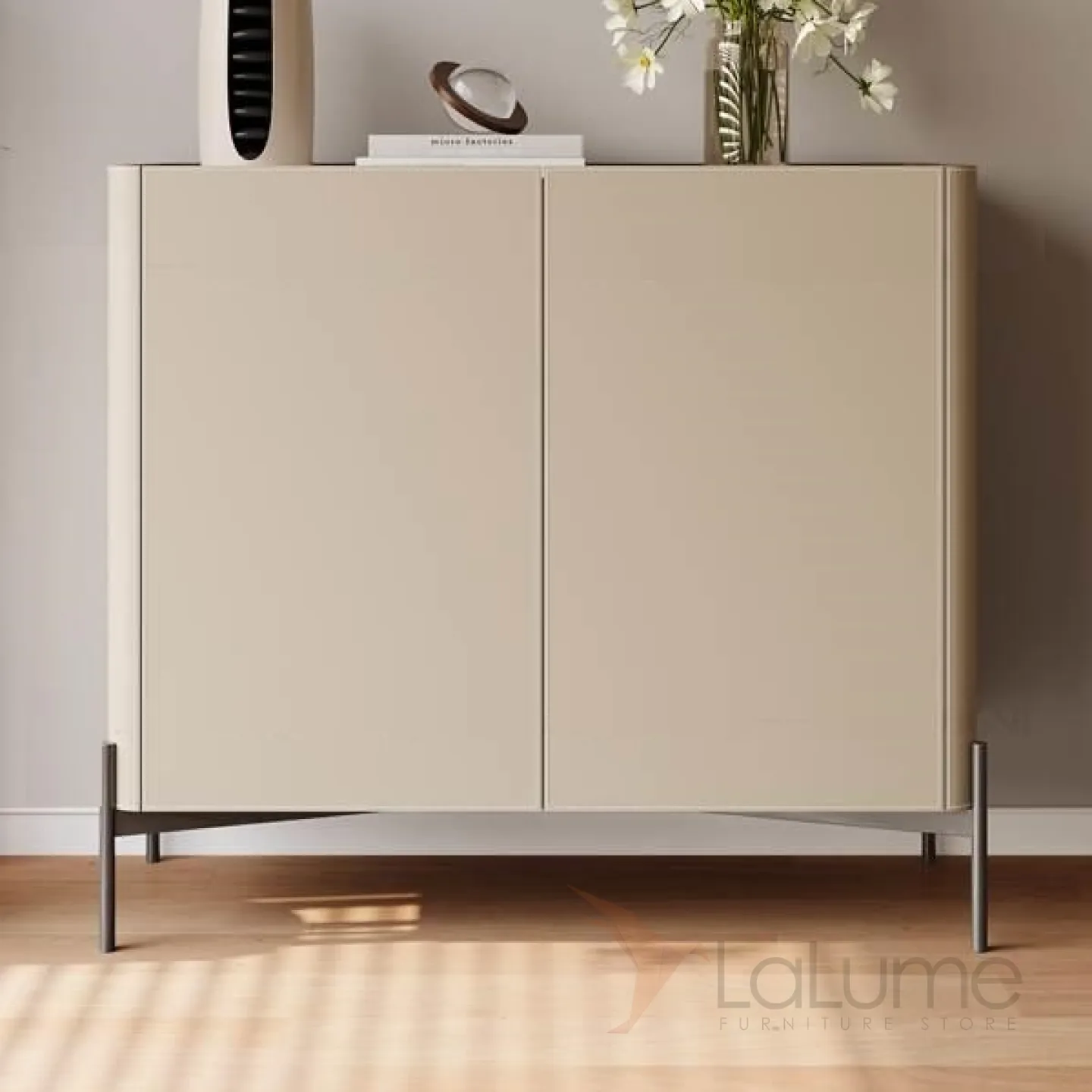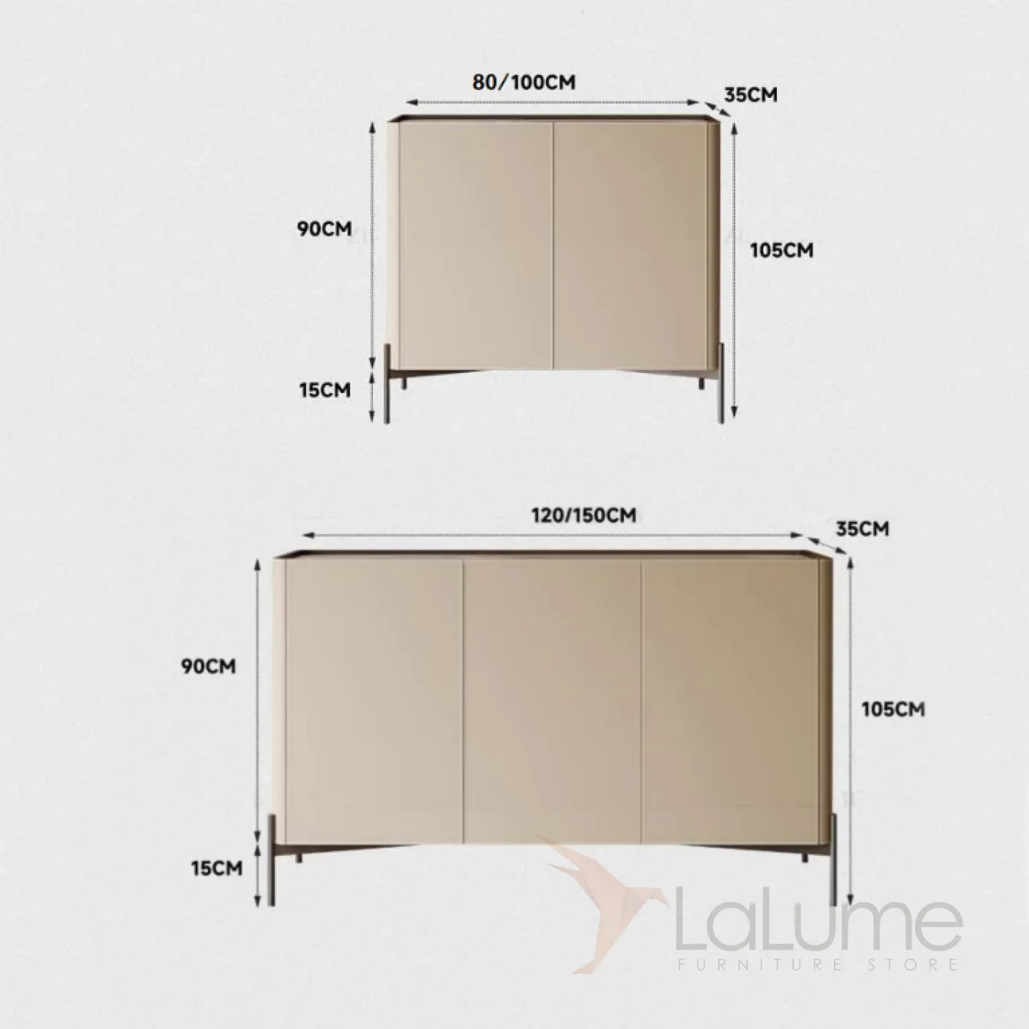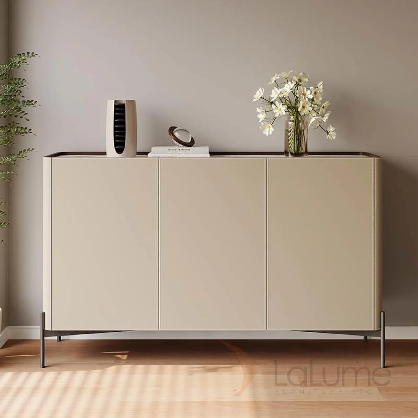 Этот деревянный комод на металлических ножках выглядит стильно и элегантно. Каркас обтянут кожей, а столешница выполнена из мрамора. Внутри есть 2 или 3 отделения с распашными дверцами, где можно удобно хранить вещи. Вы можете выбрать комода нужной длины.