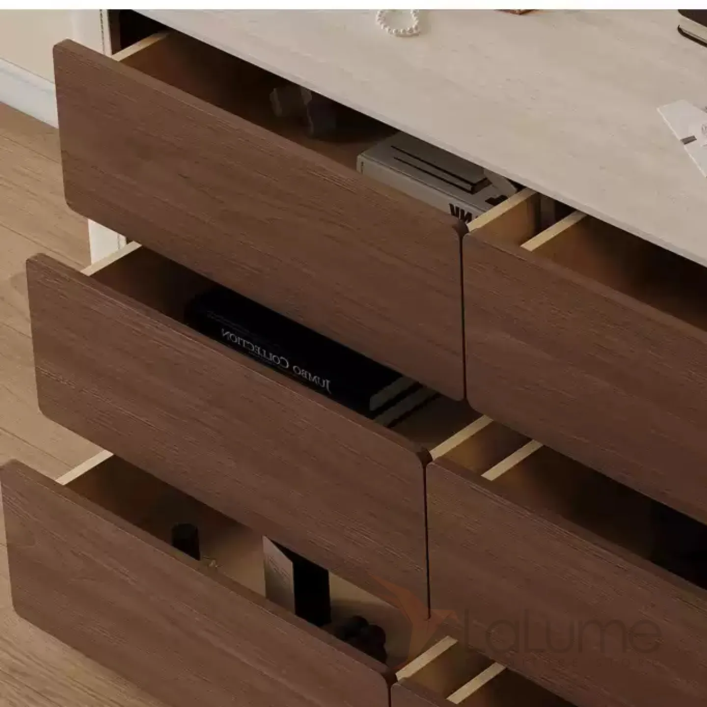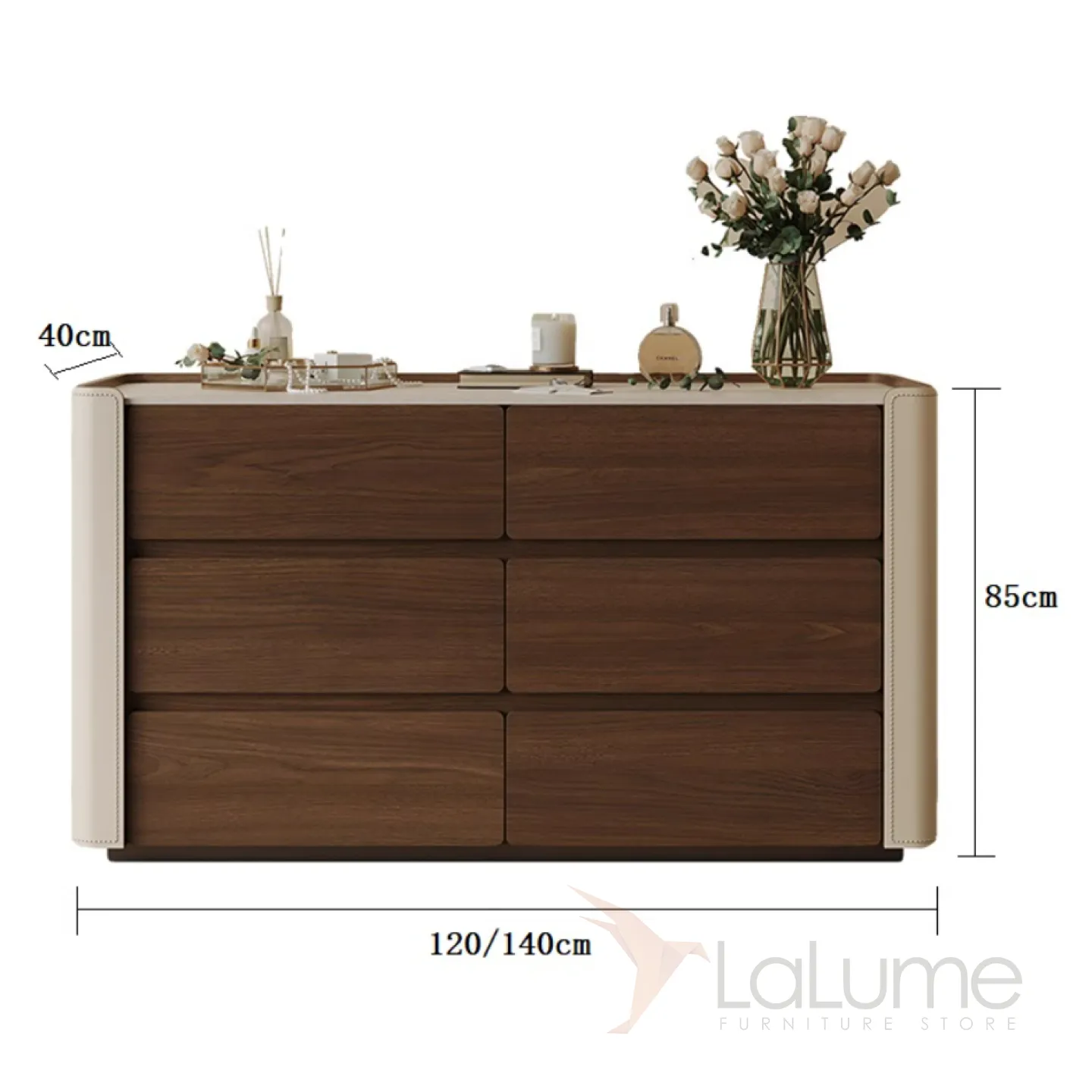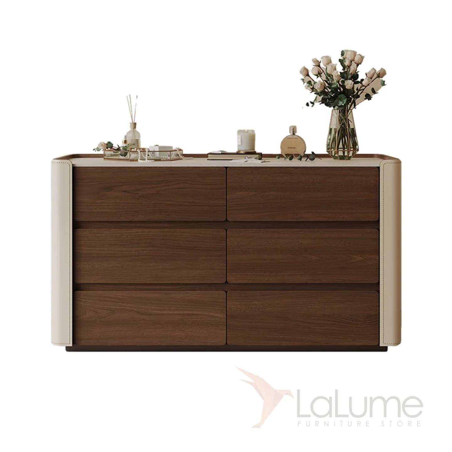 Деревянный комод выглядит стильно и элегантно. Боковые части каркаса обтянуты кожей, столешница из травертина. Для хранения вещей предусмотрены 6 выдвижных ящиков.