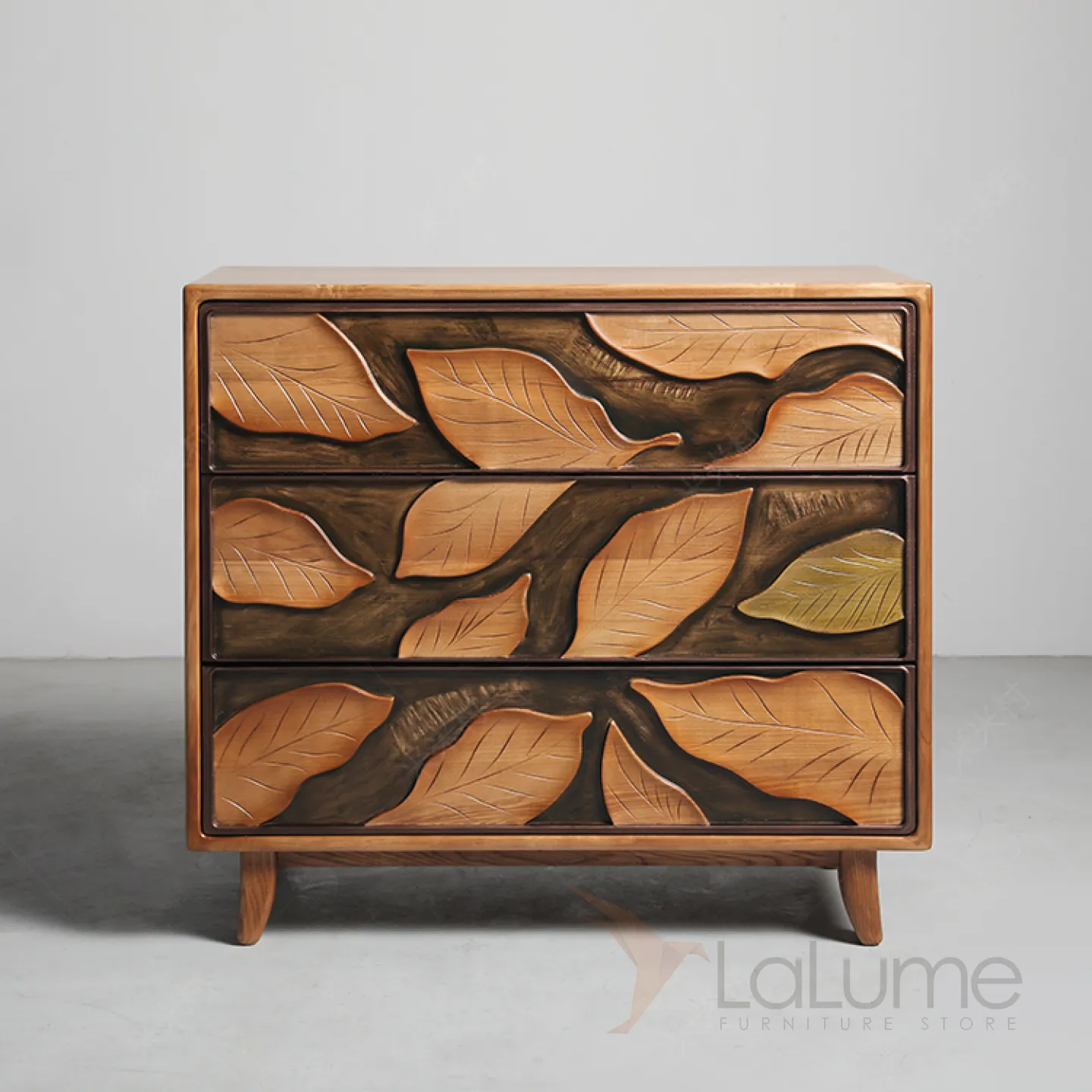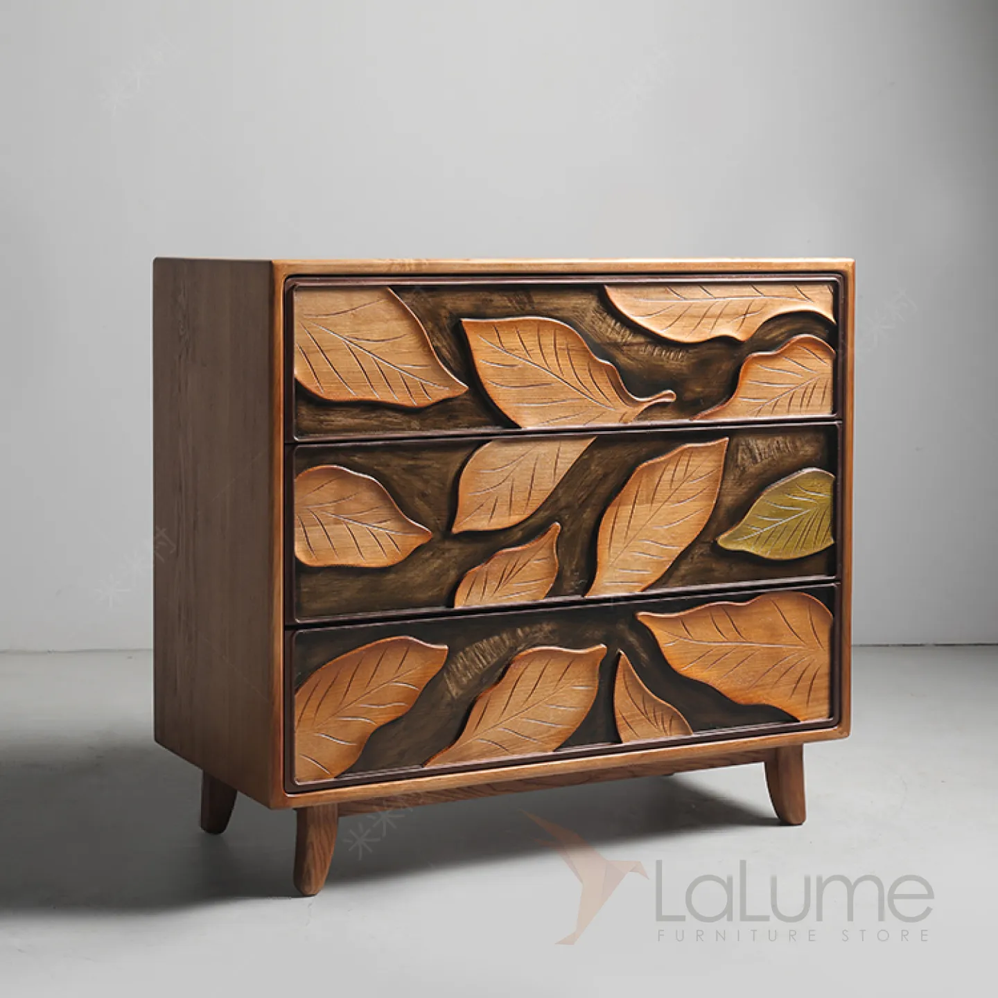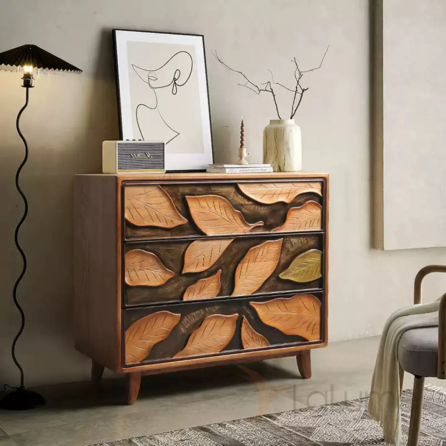 Резной комод из орехового дерева, созданный вручную, станет ярким акцентом в любом интерьере. Его фасад украшают изящные резные листья. Три выдвижных ящика помогут организовать хранение вещей.
