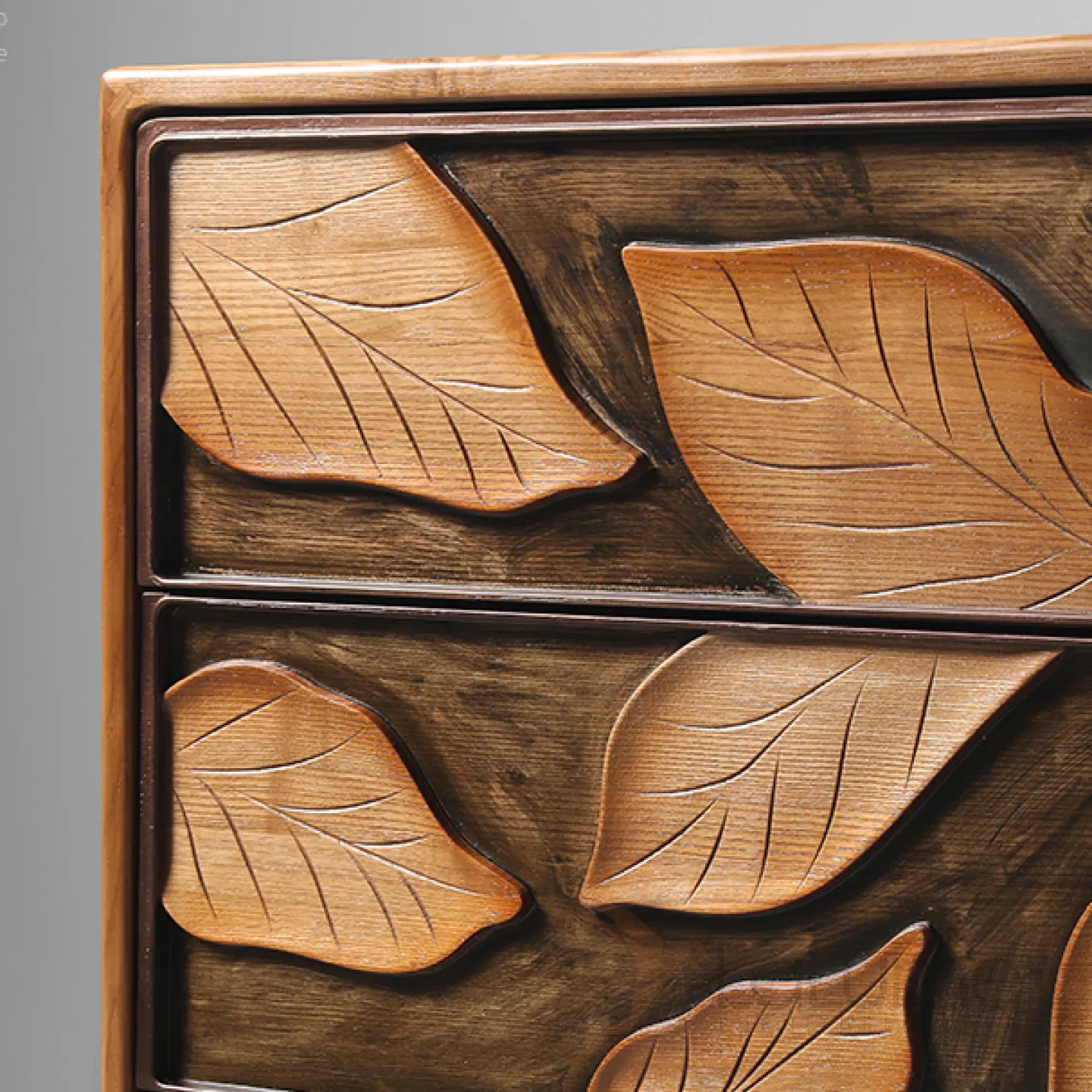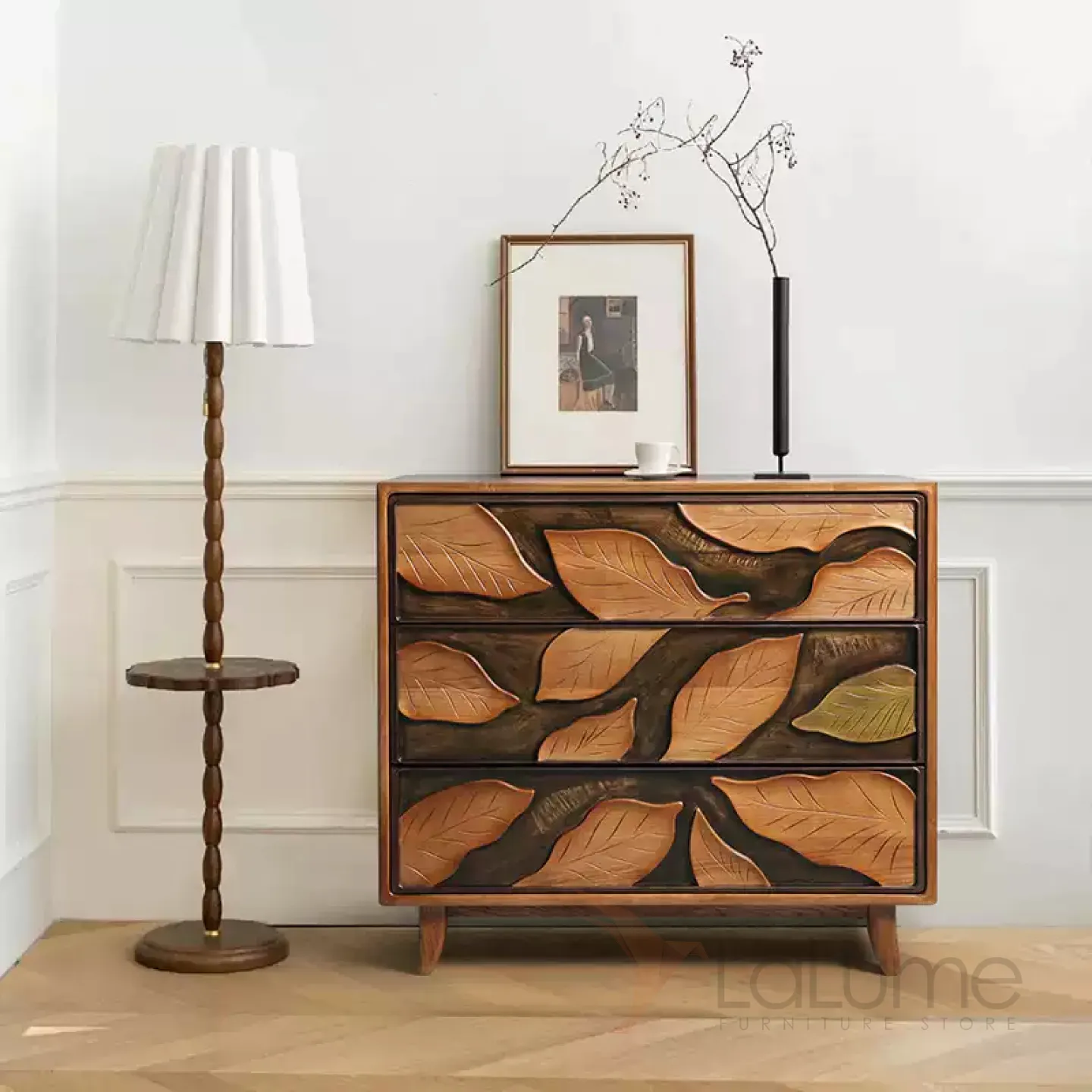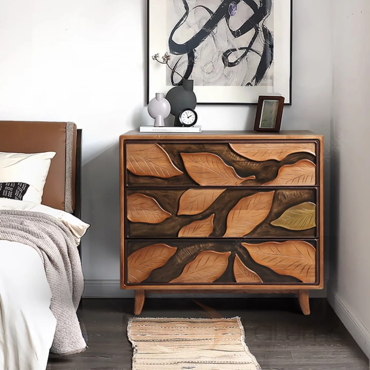 Резной комод из орехового дерева, созданный вручную, станет ярким акцентом в любом интерьере. Его фасад украшают изящные резные листья. Три выдвижных ящика помогут организовать хранение вещей.