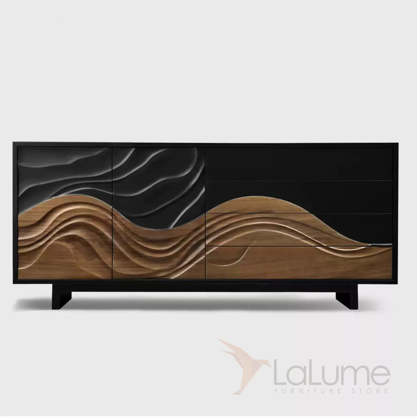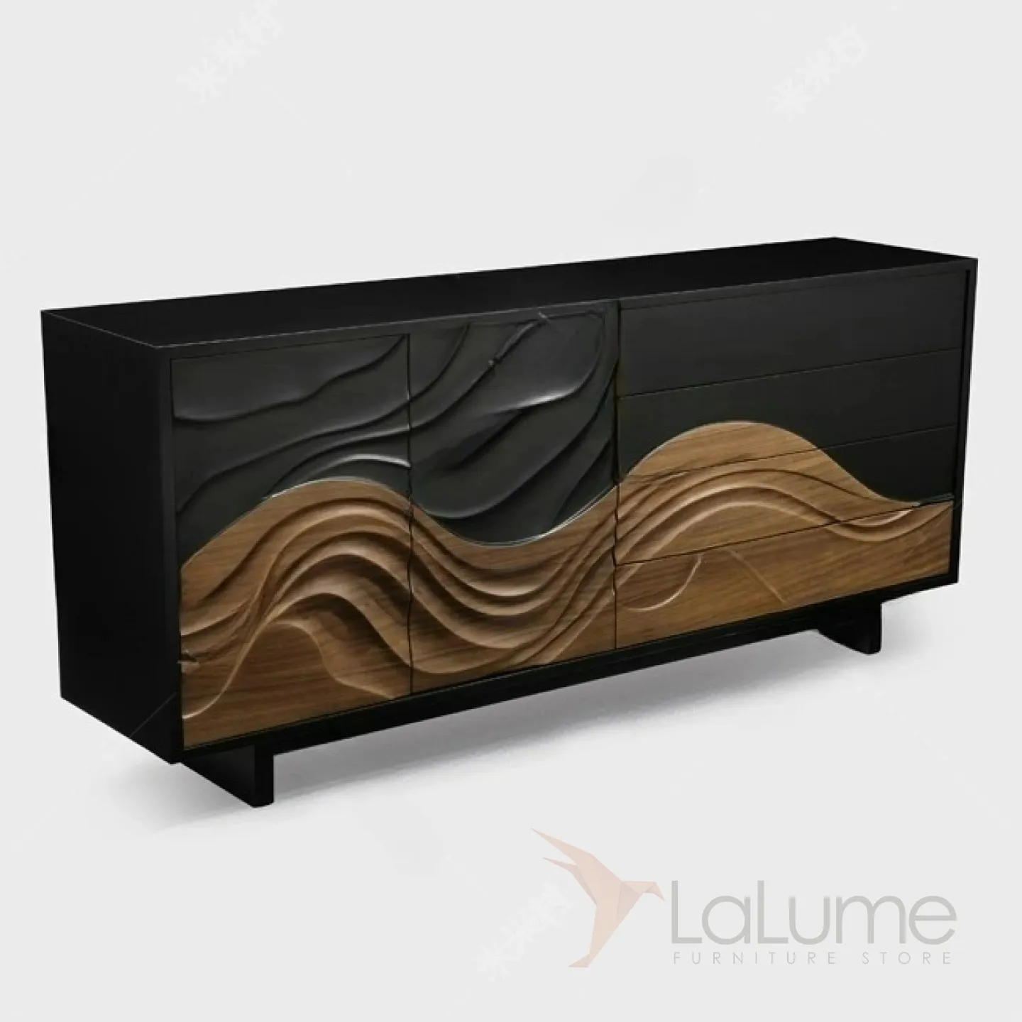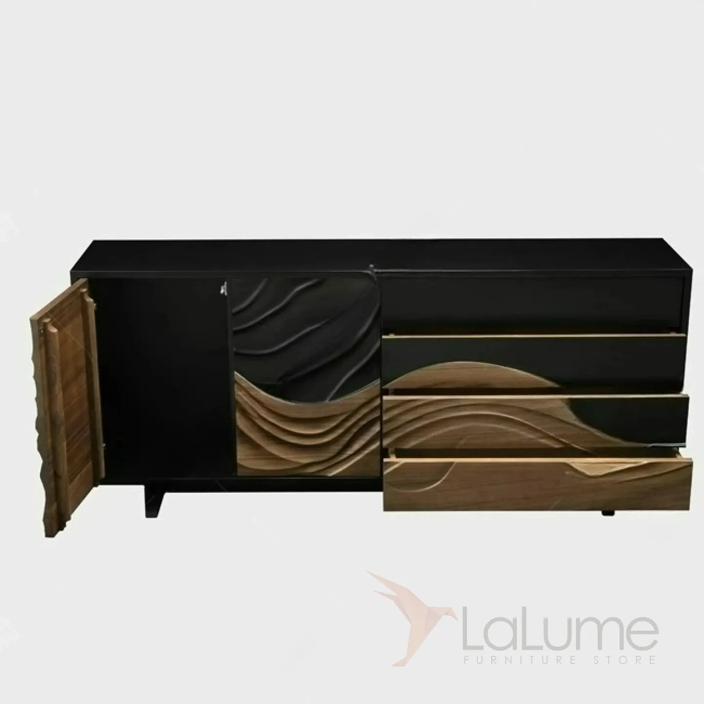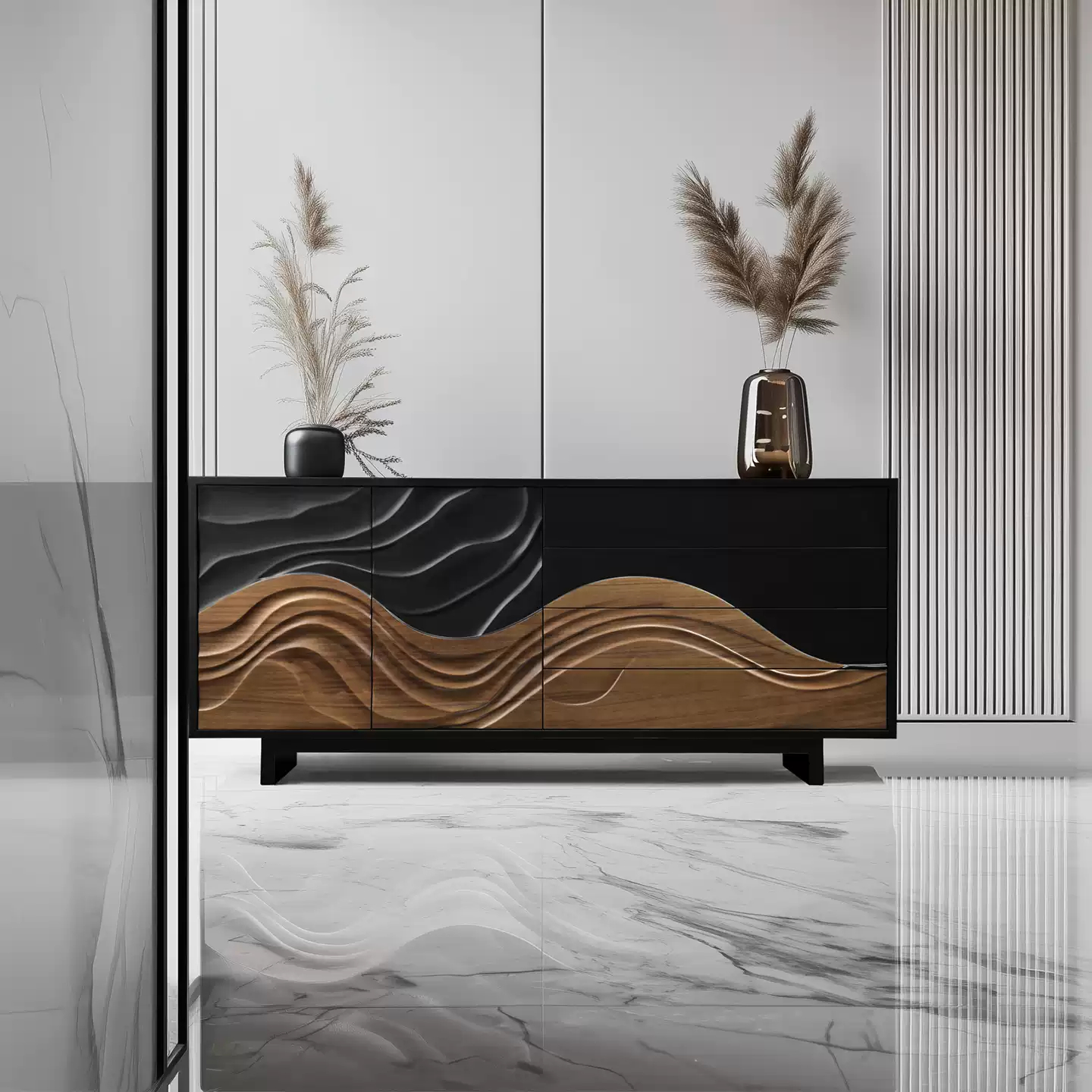 Резной комод из орехового дерева с текстурой сосны станет ярким акцентом в любом интерьере. Он оснащен двумя распашными дверцами и четырьмя выдвижными ящиками, что позволяет удобно организовать хранение вещей.