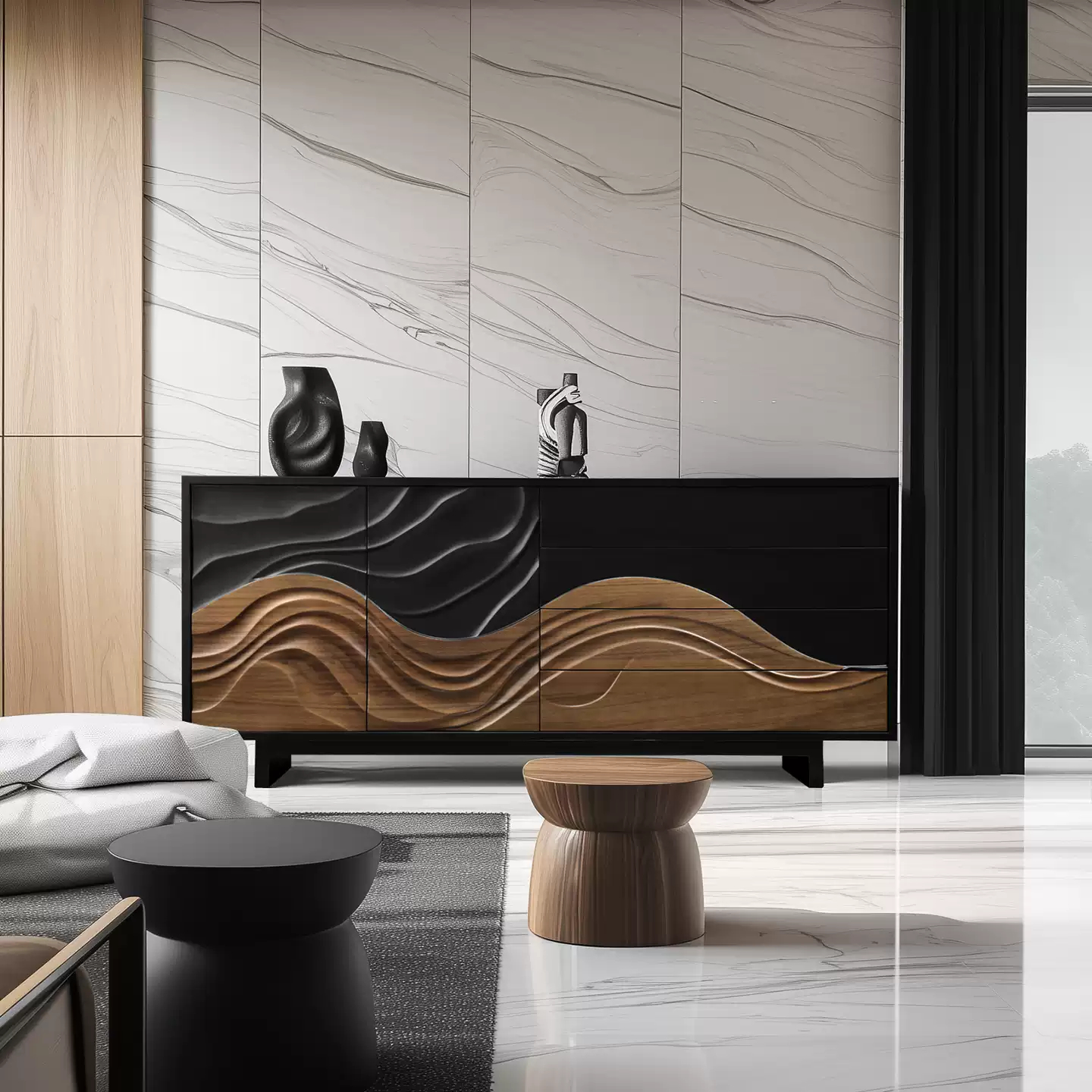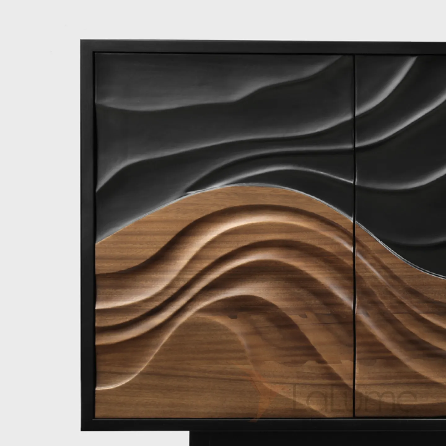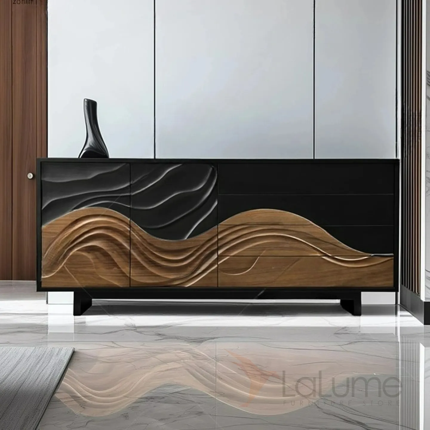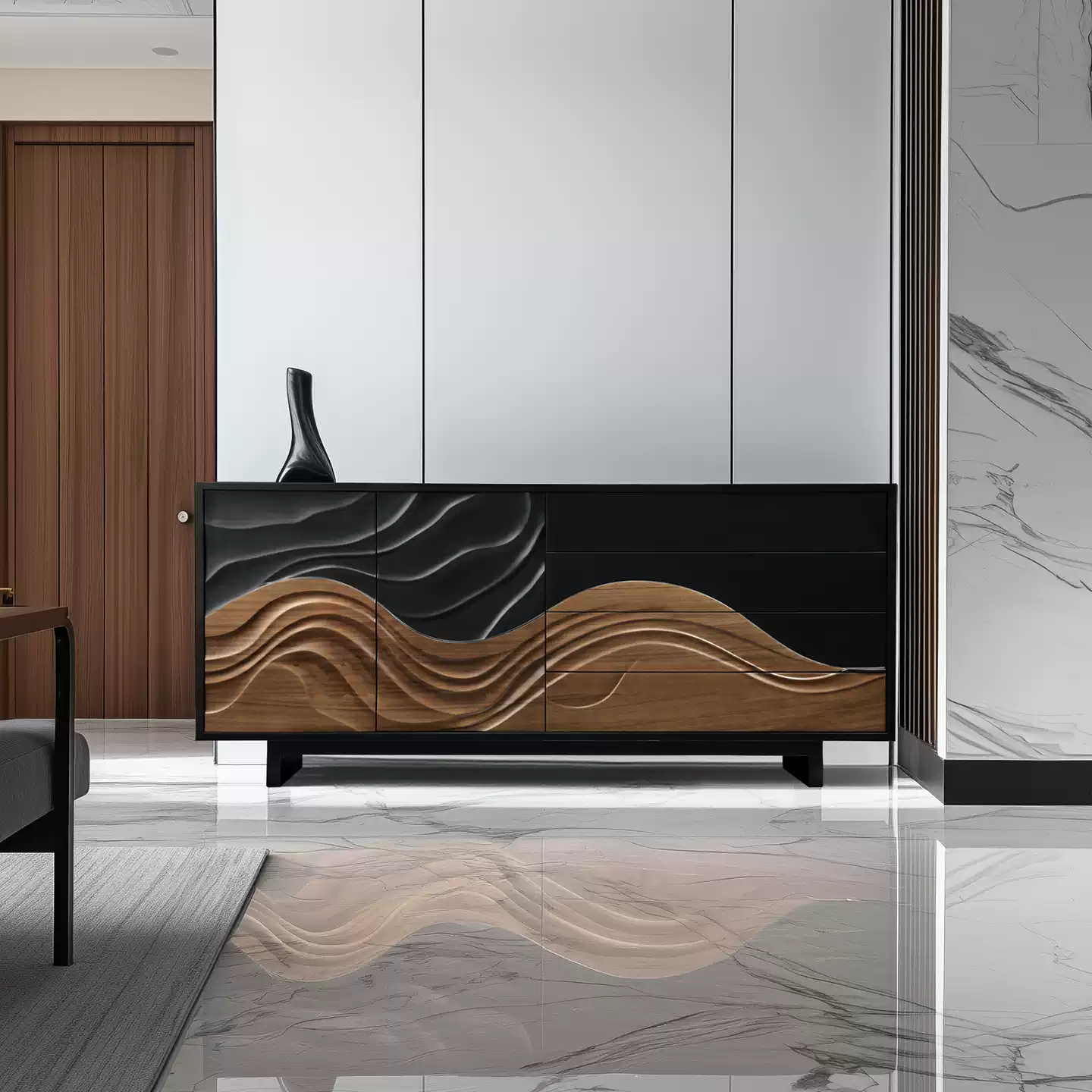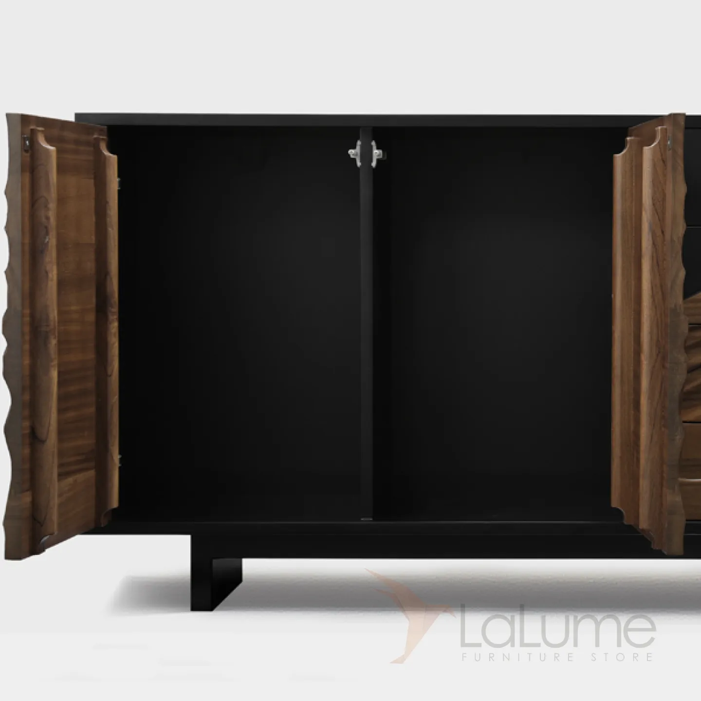 Резной комод из орехового дерева с текстурой сосны станет ярким акцентом в любом интерьере. Он оснащен двумя распашными дверцами и четырьмя выдвижными ящиками, что позволяет удобно организовать хранение вещей.