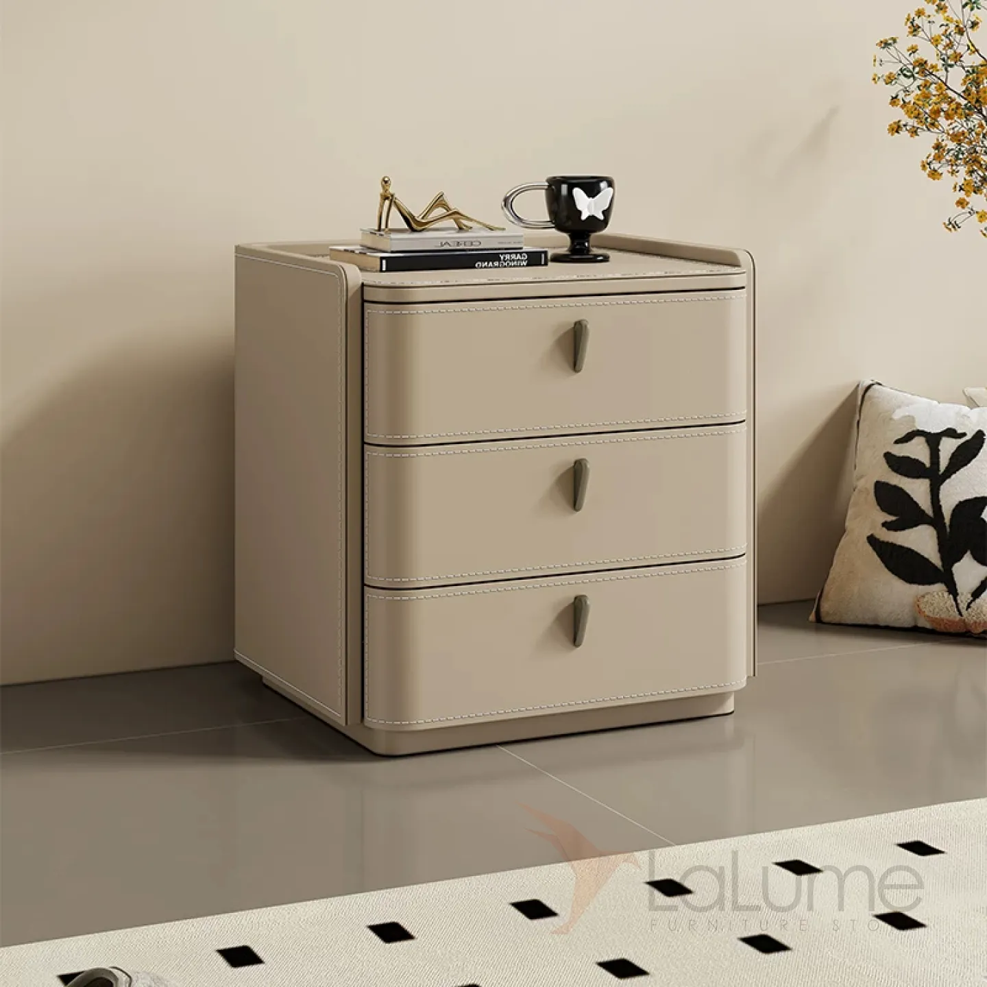 Небольшой прикроватный комод из цельного дерева с обивкой из натуральной кожи, есть варианты с мраморной столешницей. Функциональность дополнена двумя или тремя выдвижными ящиками.