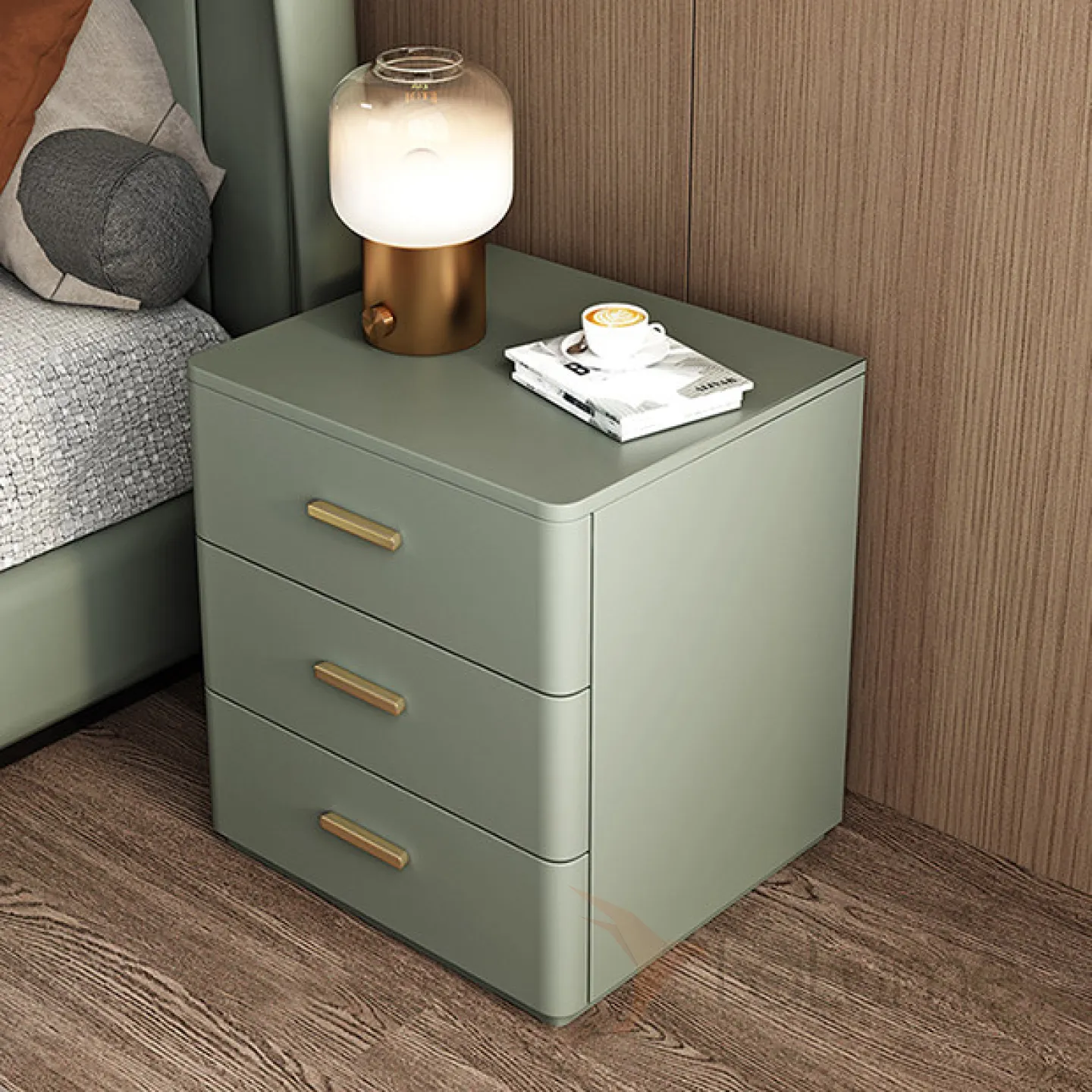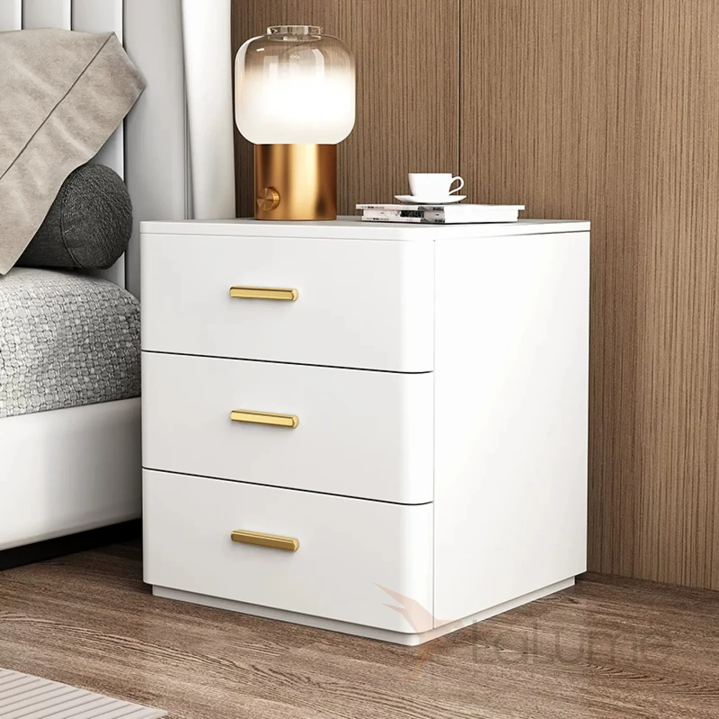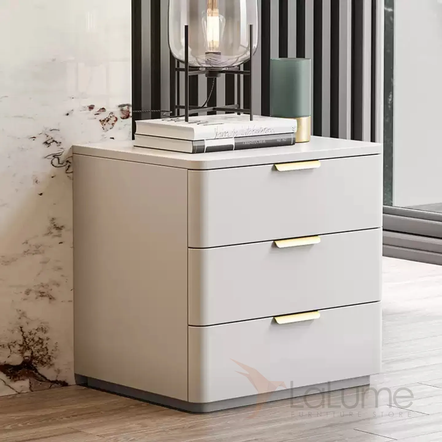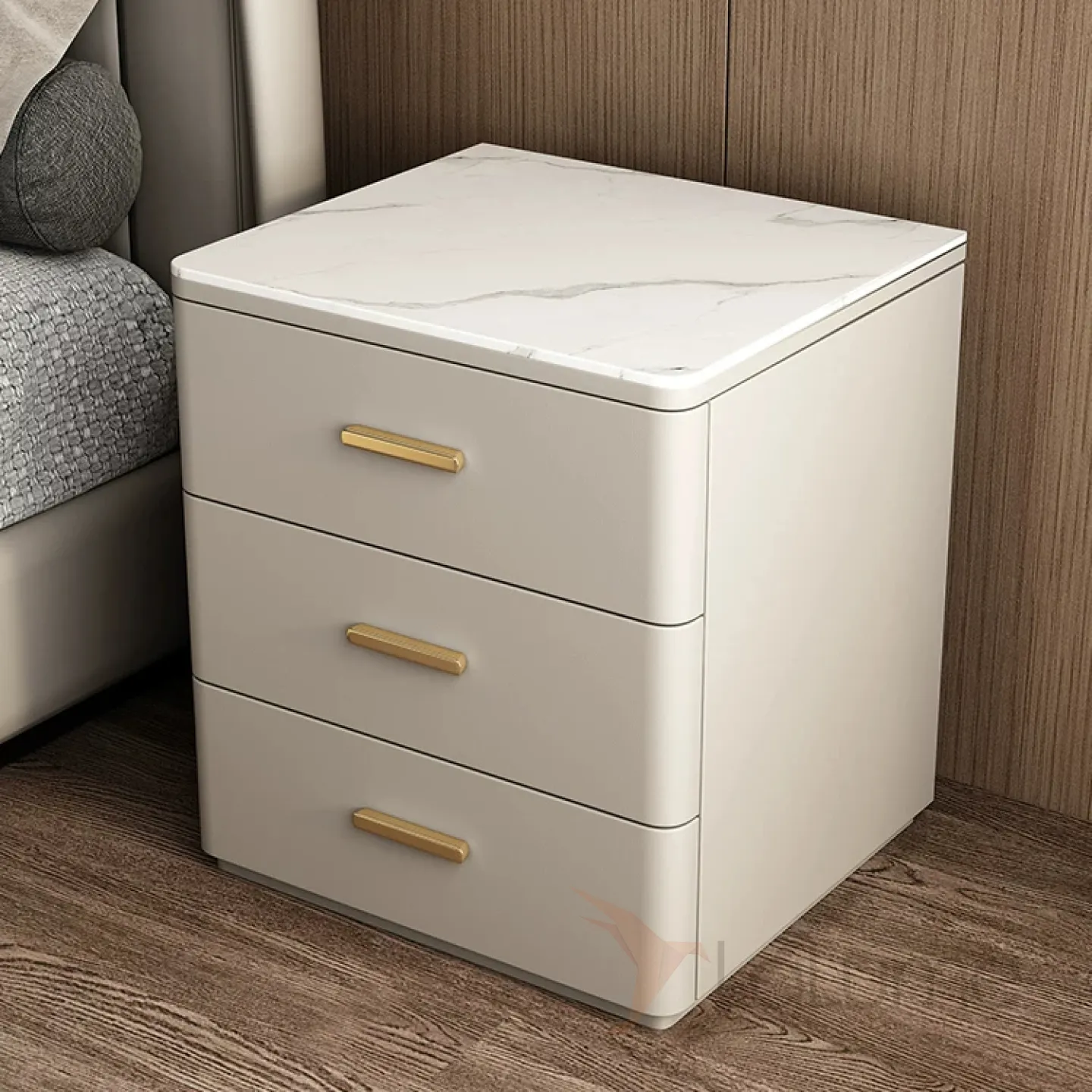 Небольшой прикроватный комод из цельного дерева с обивкой из натуральной кожи, столешница из кожи или мрамора, на выбор. Функциональность дополнена тремя выдвижными ящиками.