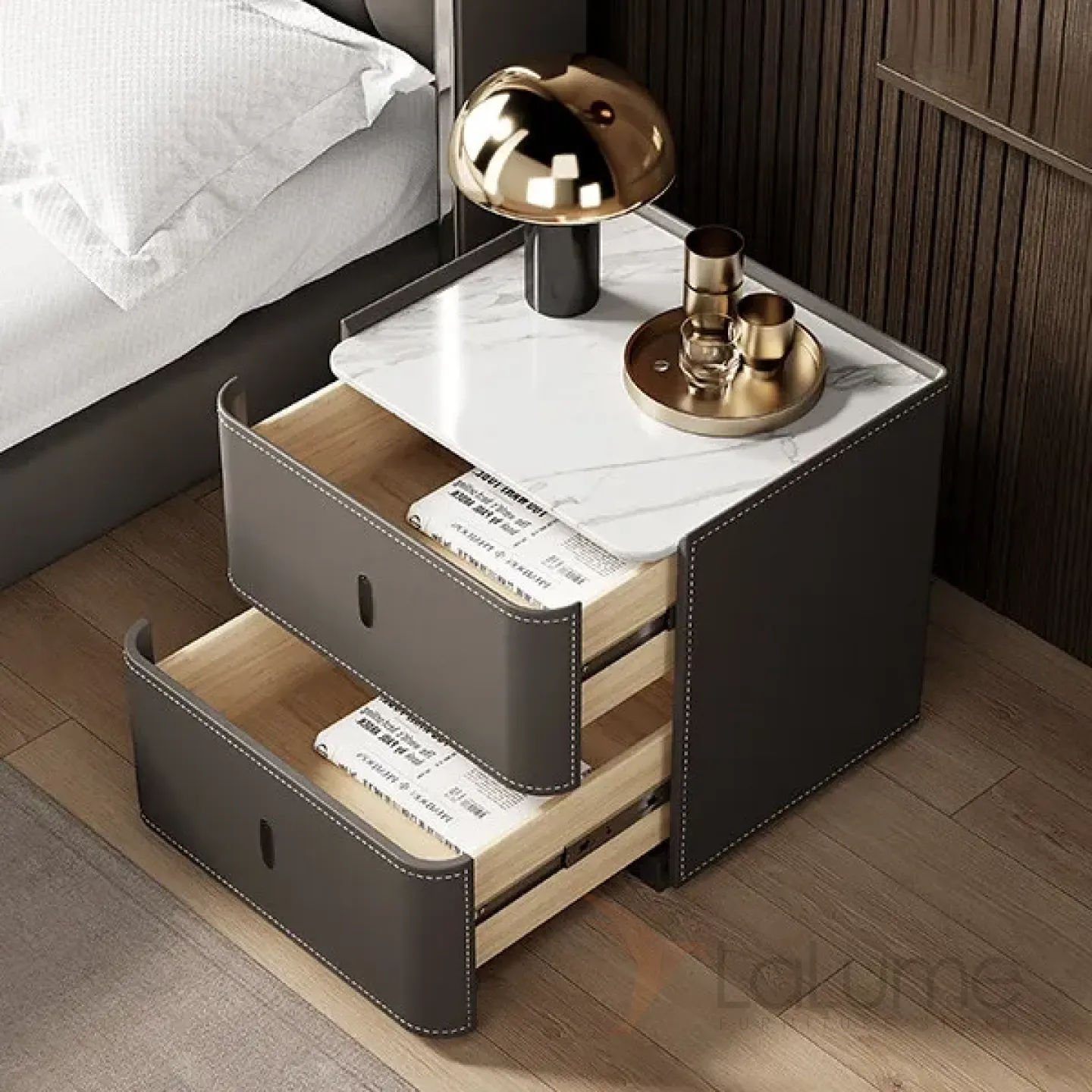Небольшой прикроватный комод из цельного дерева с обивкой из натуральной кожи, столешница из кожи или мрамора, на выбор. Функциональность дополнена двумя выдвижными ящиками.