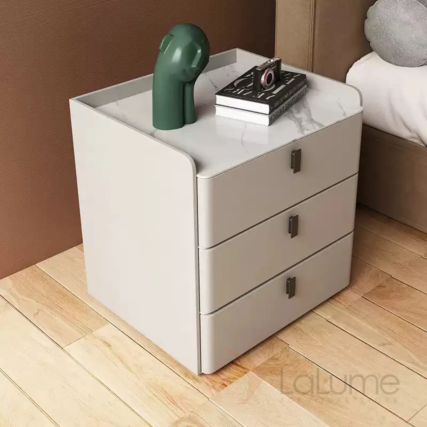 Классическая прикроватная тумба из цельного дерева обитого кожей, столешница из мрамора. Функциональность дополнена 3мя выдвижными ящиками.