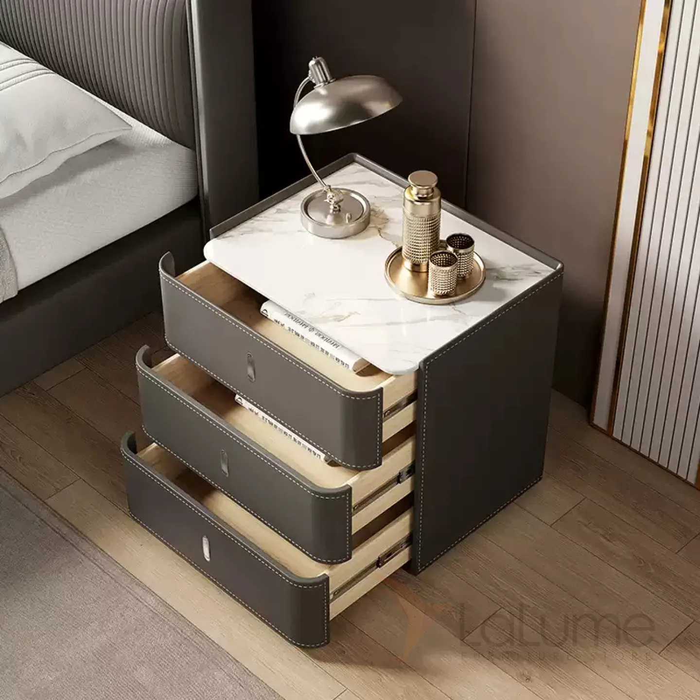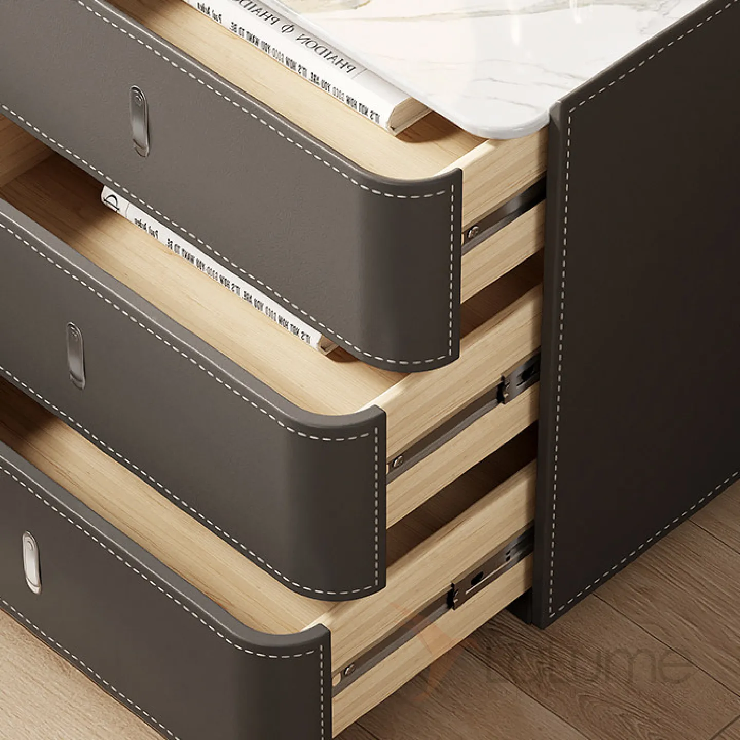 Классическая прикроватная тумба из цельного дерева обитого кожей, столешница из мрамора. Функциональность дополнена 3мя выдвижными ящиками.