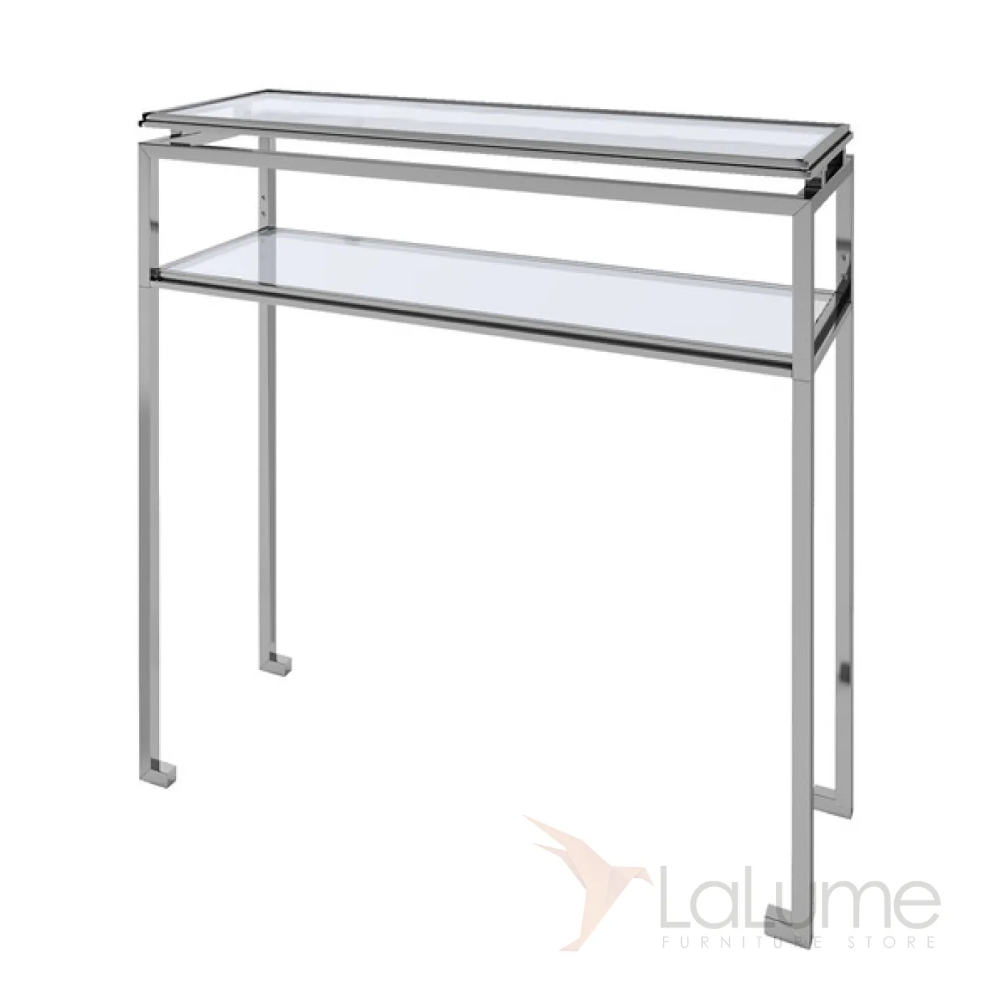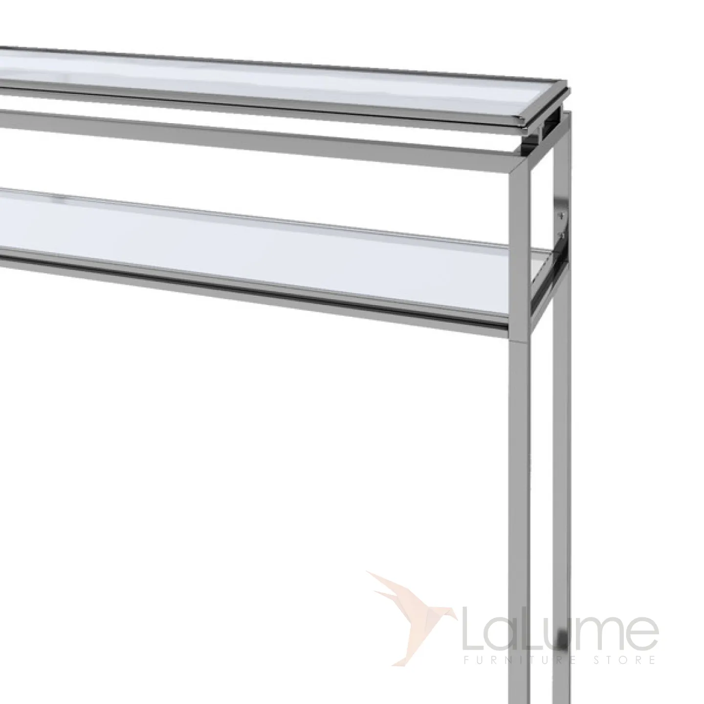 Консоль из хромированного металла со столешницей из стекла черного цвета.