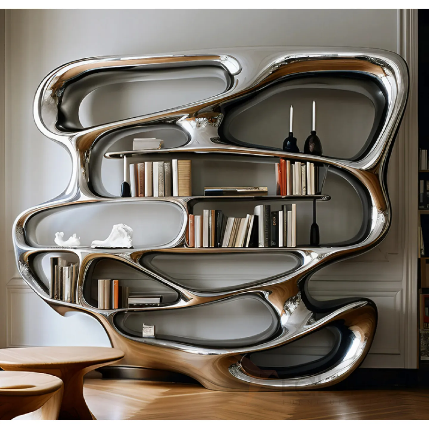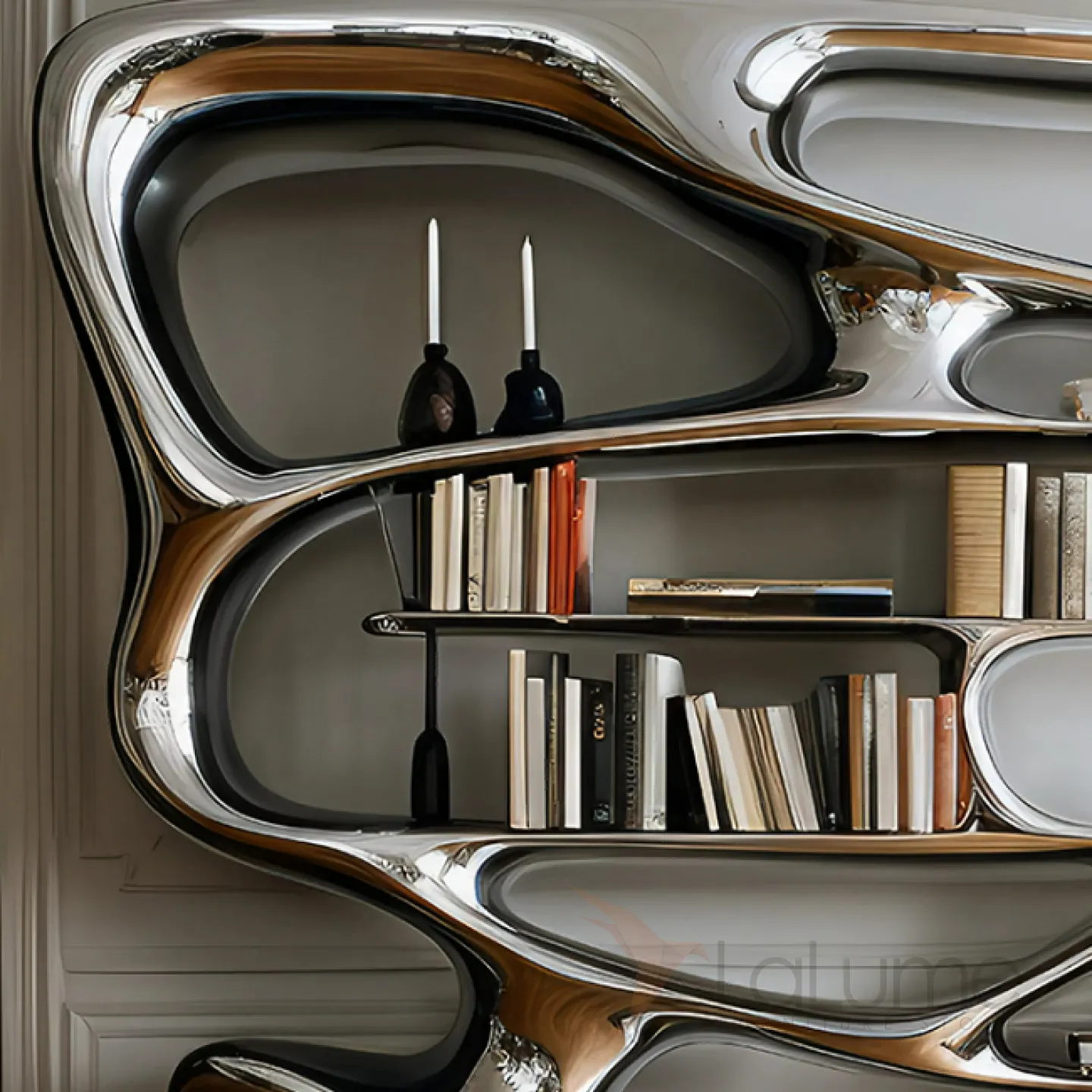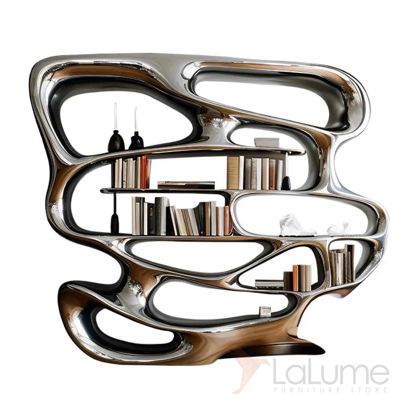 Книжная полка оригинального дизайна с множеством открытых отделений для различных предметов. Изготовлена из чёрного дерева, декорирована современным металлическим покрытием.