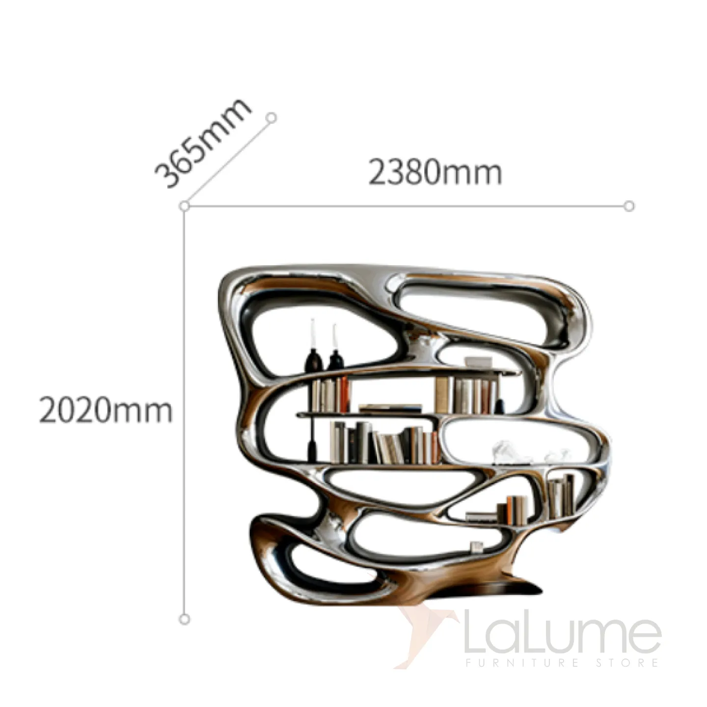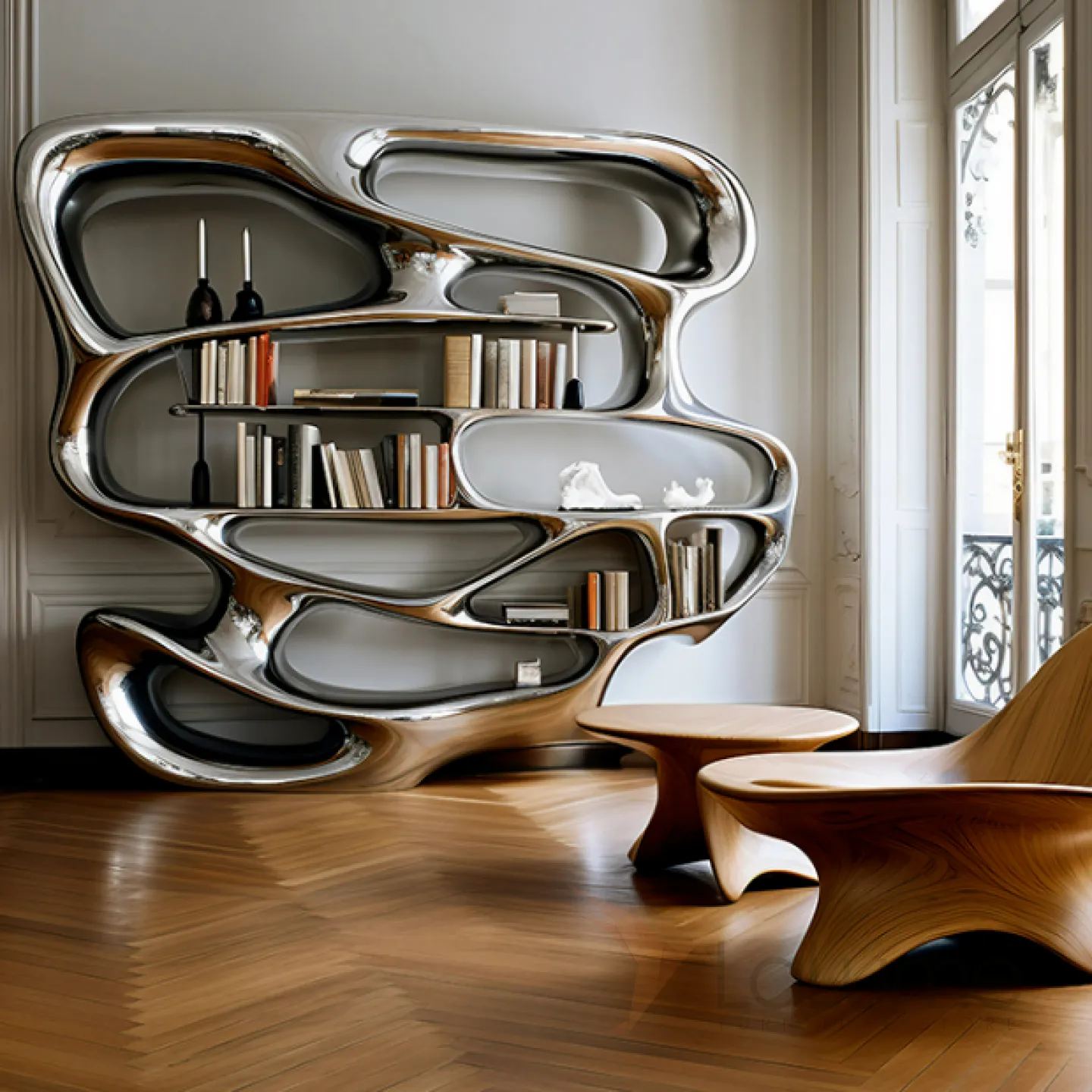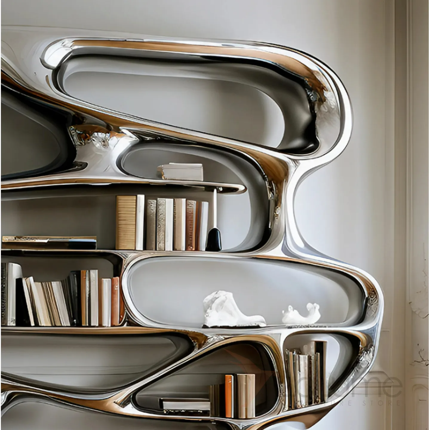 Книжная полка оригинального дизайна с множеством открытых отделений для различных предметов. Изготовлена из чёрного дерева, декорирована современным металлическим покрытием.