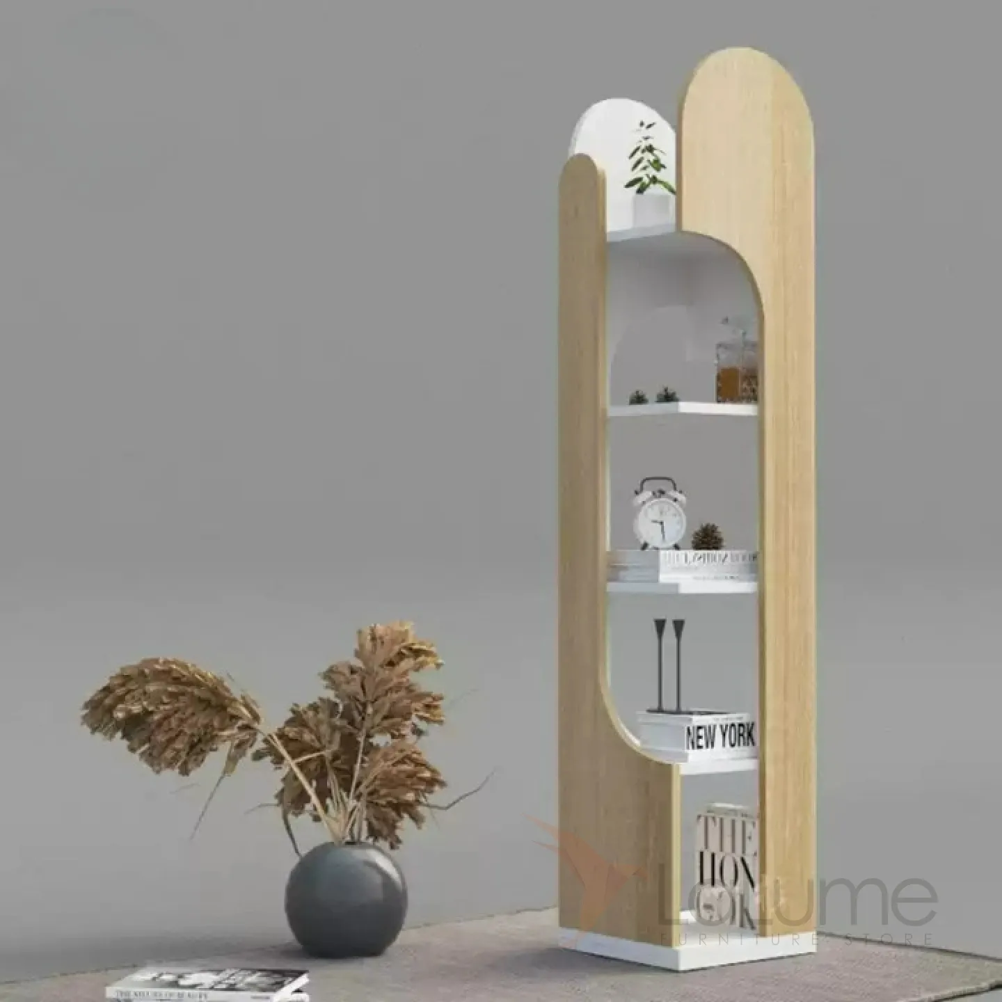 Книжная полка оригинальной формы из дерева. Вы можете выбрать подходящее цветовое решение.