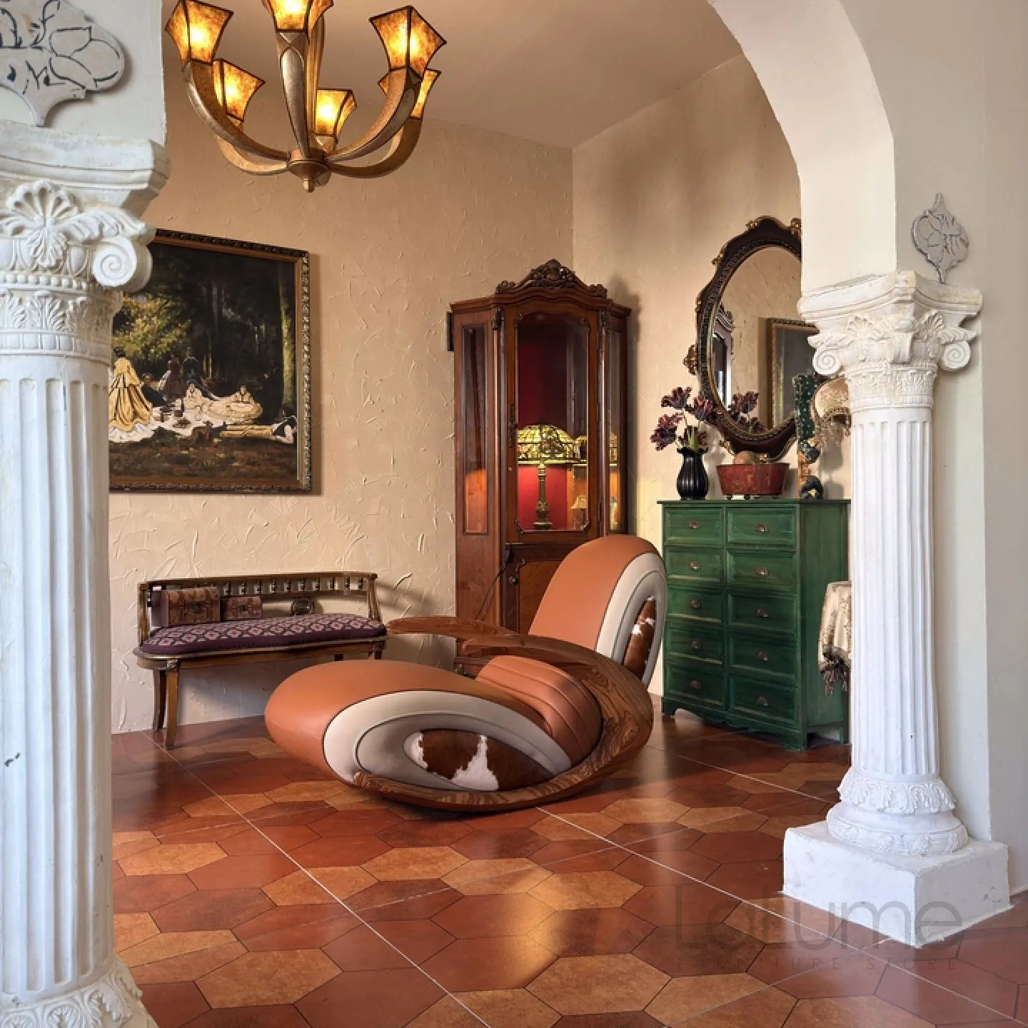 Это уникальное и эргономичное кресло-качалка, выполненное из натуральных материалов, обладает оригинальным дизайном. В его основе — чёрное дерево, привезённое из Африки, что придаёт креслу особый шарм и элегантность, ценимые истинными знатоками. Мягкое и глубокое сиденье обеспечивает удобство и позволяет полностью расслабиться. А вставки из коровьего меха по бокам кресла добавляют ему нотку шарма и изысканности.