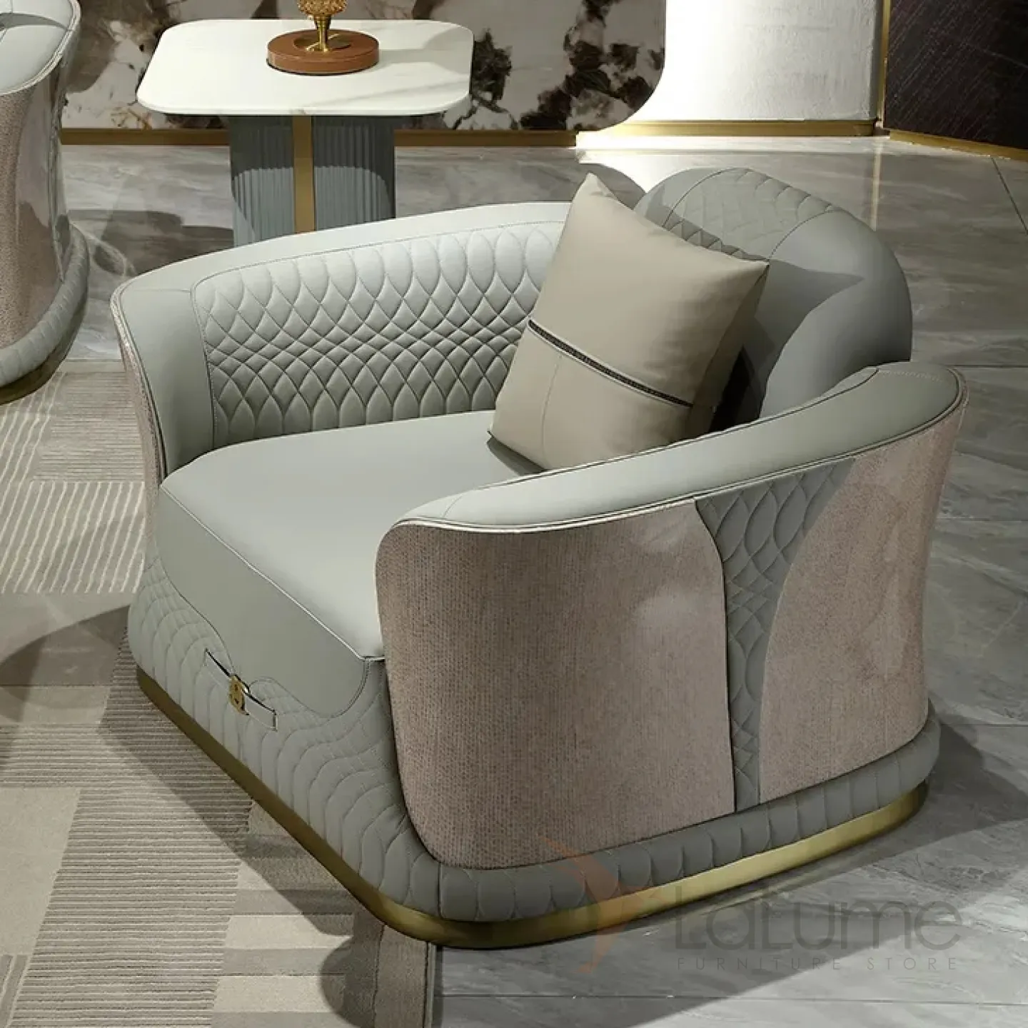 Кресло, изготовленное из натуральной кожи, имеет корпус из древесины красного дерева, покрытой высококачественным шпоном. Изысканные золотистые детали придают креслу роскошный и неповторимый вид. Кресло спроектировано с учётом особенностей человеческого тела, а в комплекте с ним идёт подушка, которая обеспечивает дополнительный уют.