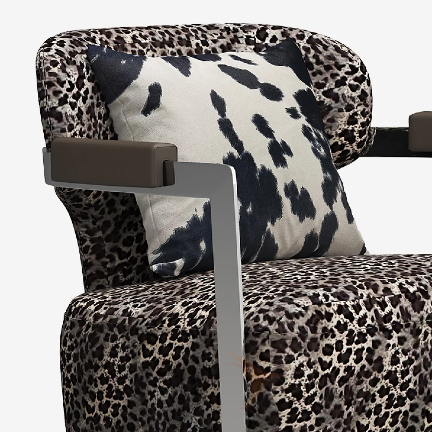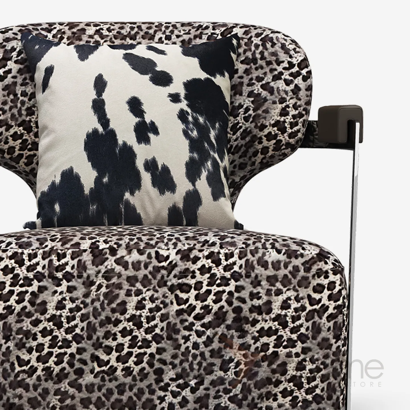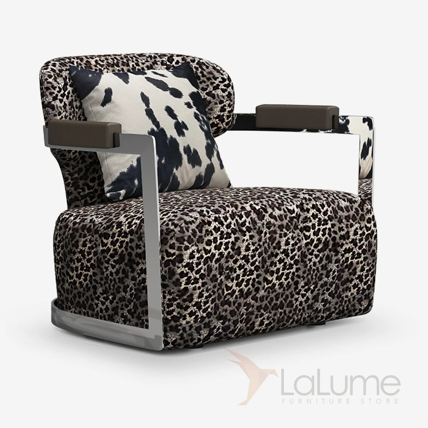 Дизайнерское кресло в стильной леопардовой расцветке. Основано на прочном буке и нержавеющей стали. Мягкость обеспечивает качественный поролон и мебельная фланель.