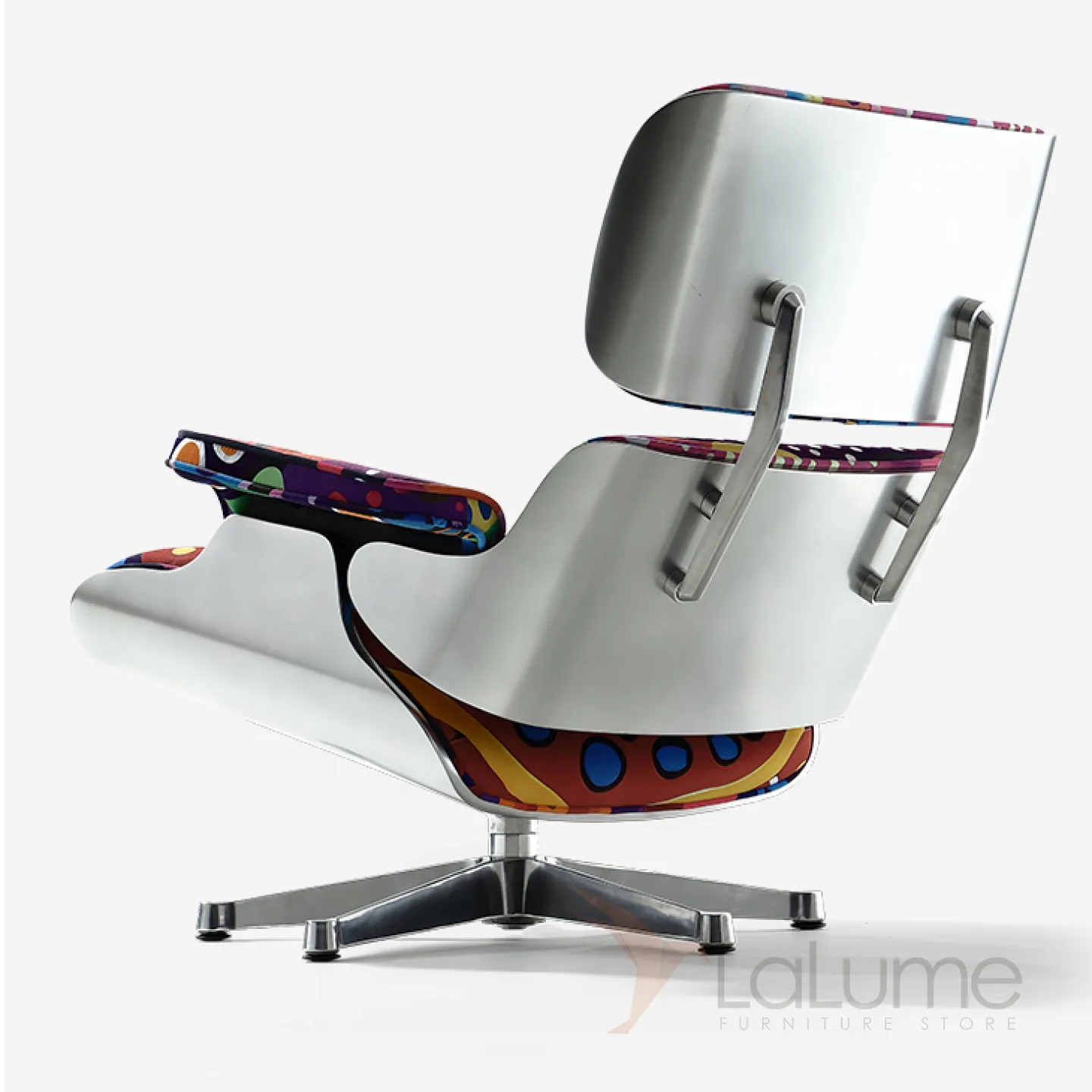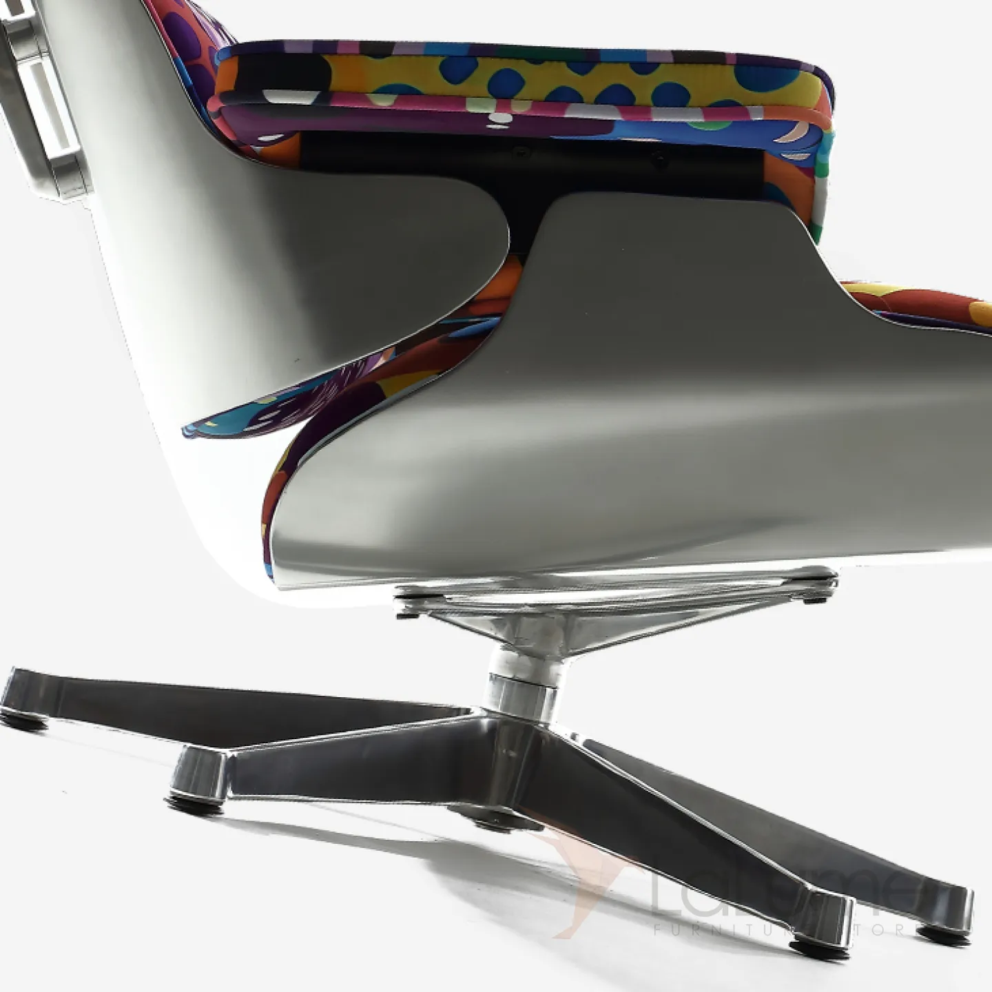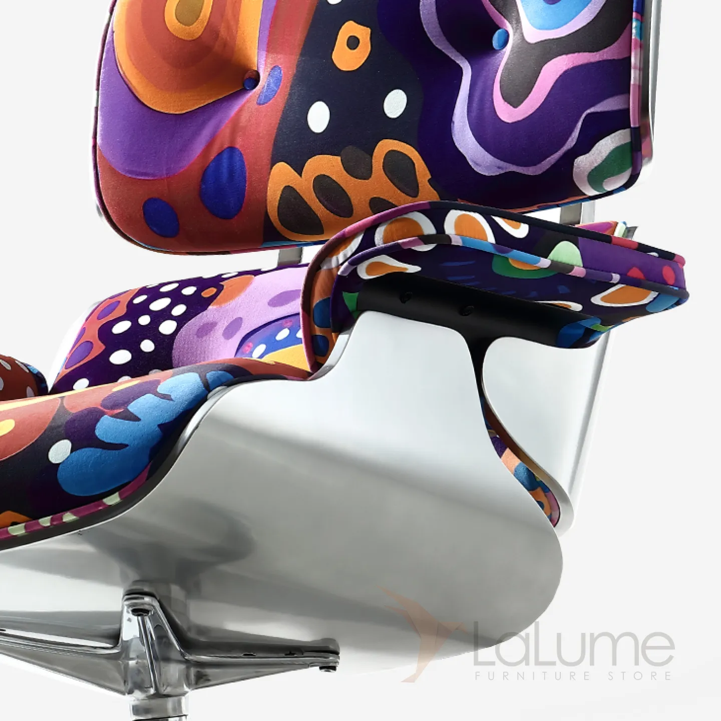 Поворотное кресло на прочном металлическом каркасе. Сиденье из плотного поролона и обивка из яркого мебельного текстиля. В комплекте подставка для ног.