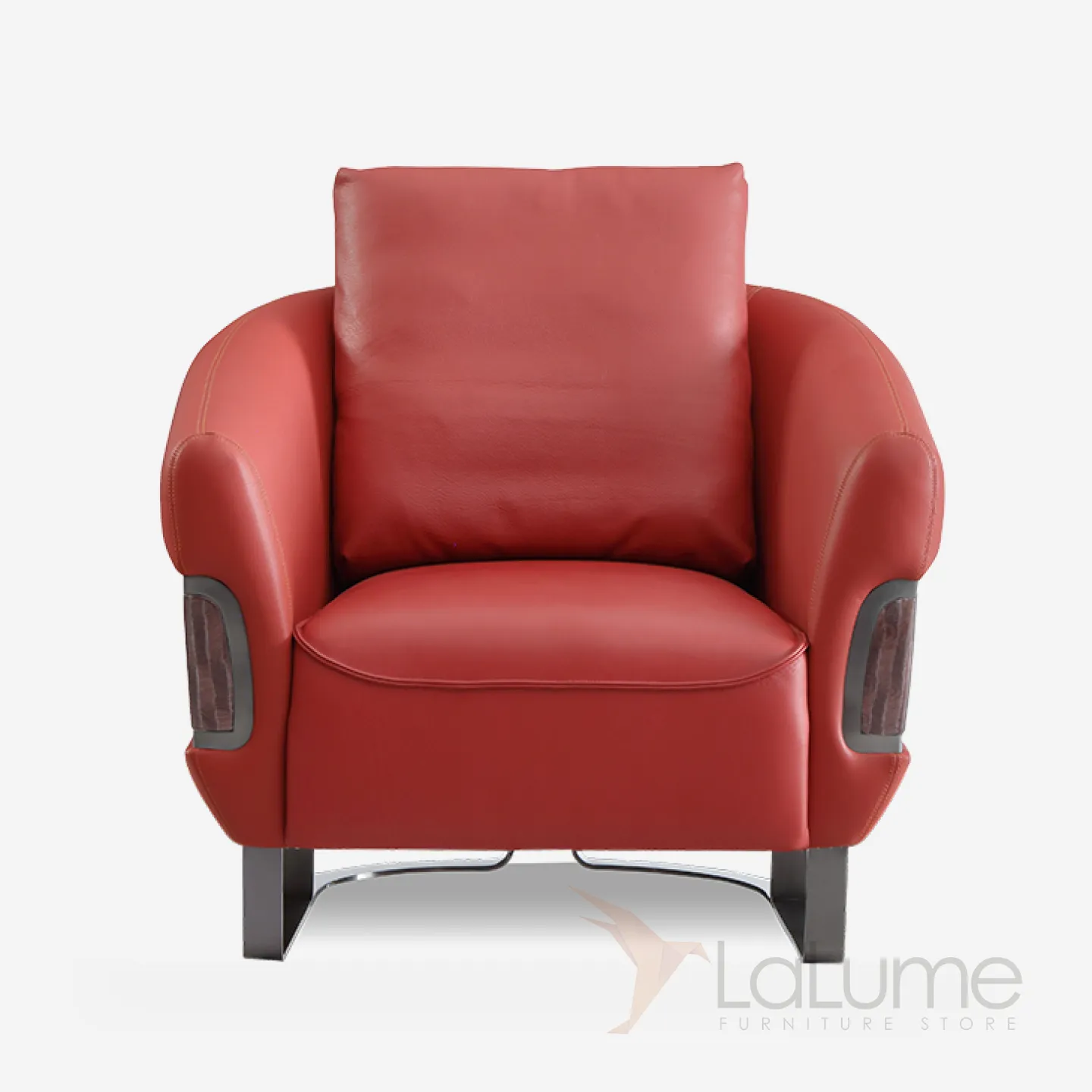 Изящное кожаное кресло насыщенного красного цвета. Его прочная основа из дерева и металла. Дизайн продуман до мелочей: удобная спинка и мягкая подушка создают комфорт в любое время дня и ночи.