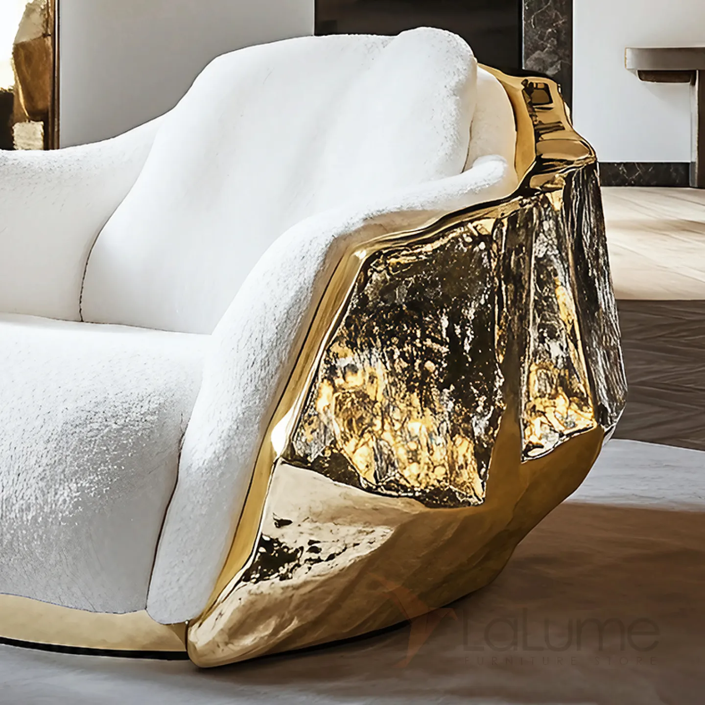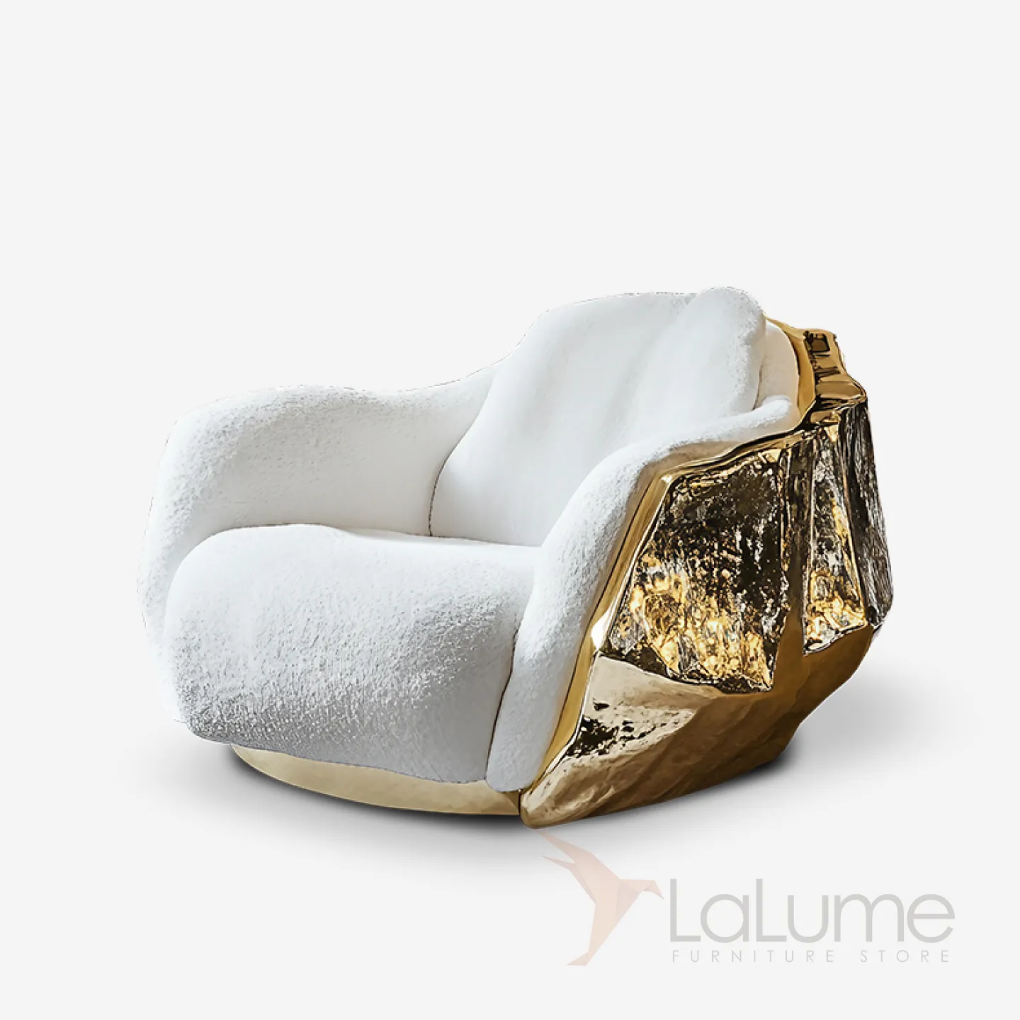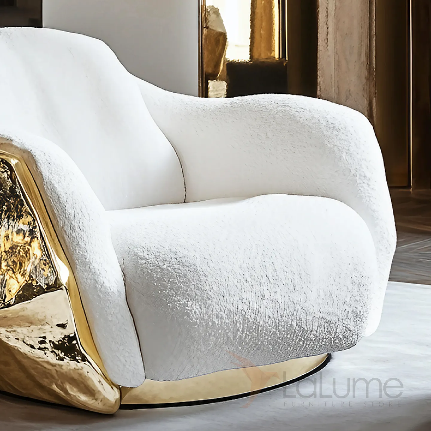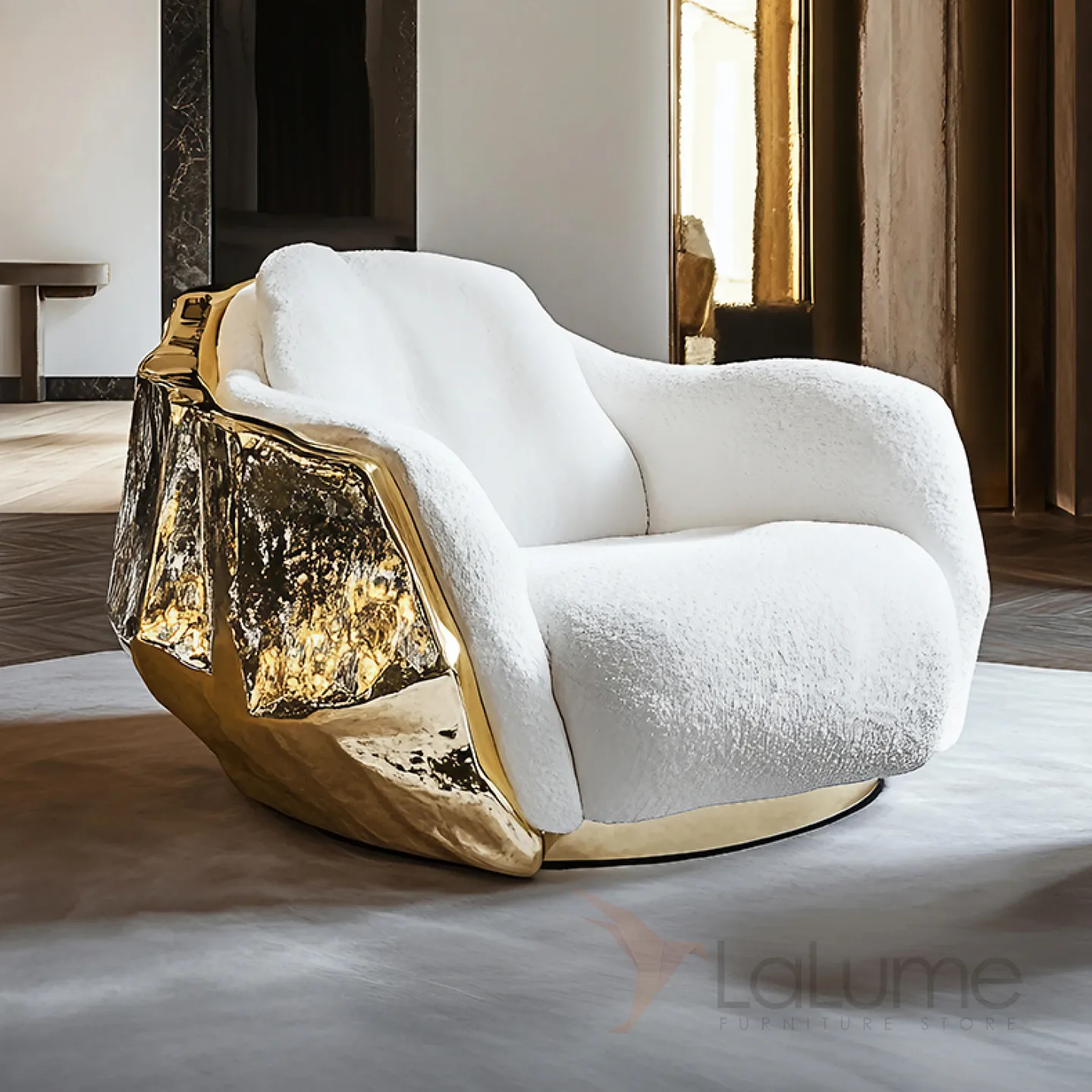 Кресло с оригинальным дизайном. Его плавные линии и изящные изгибы придают ему особую привлекательность. Сочетание белого и золотого в оформлении создаёт ощущение роскоши.