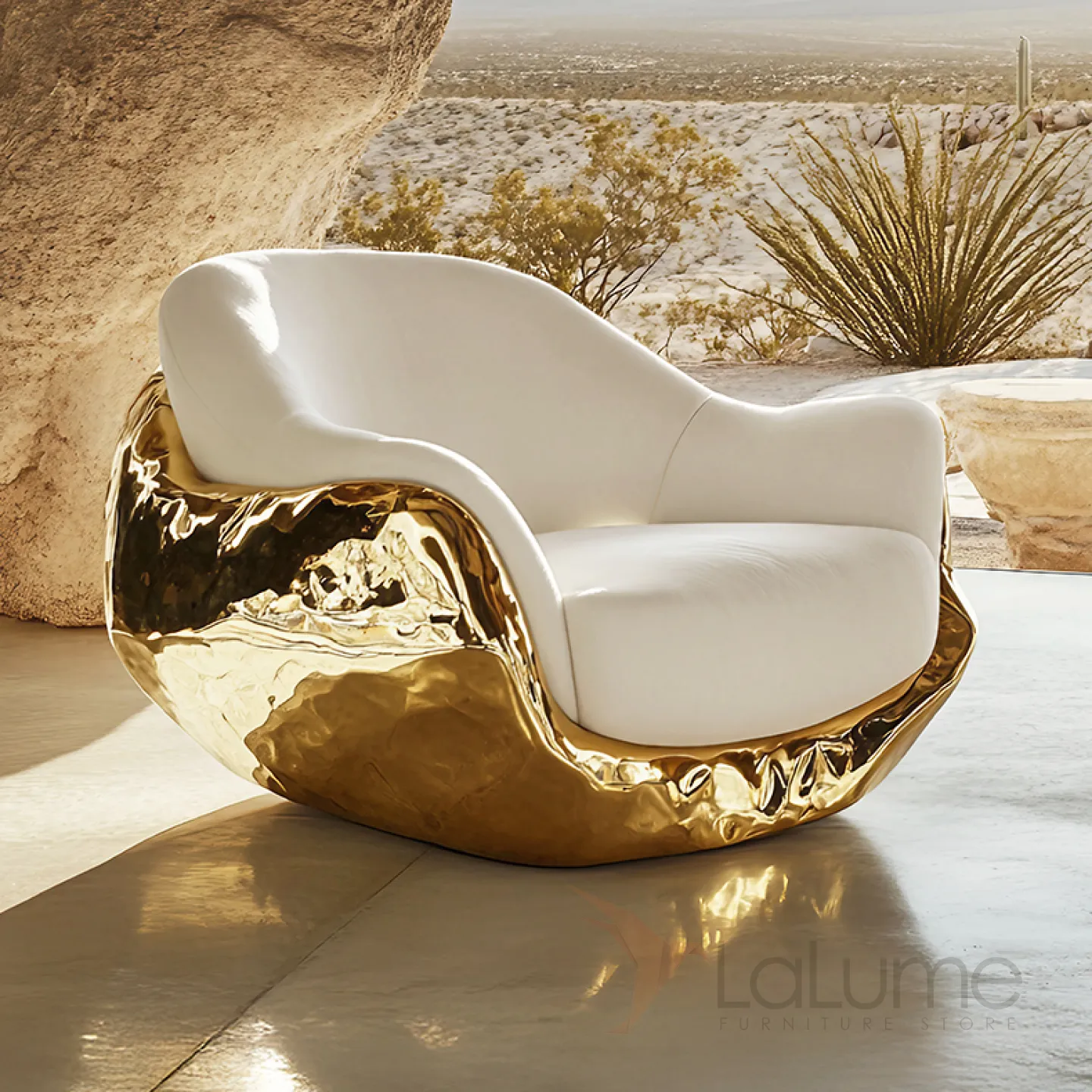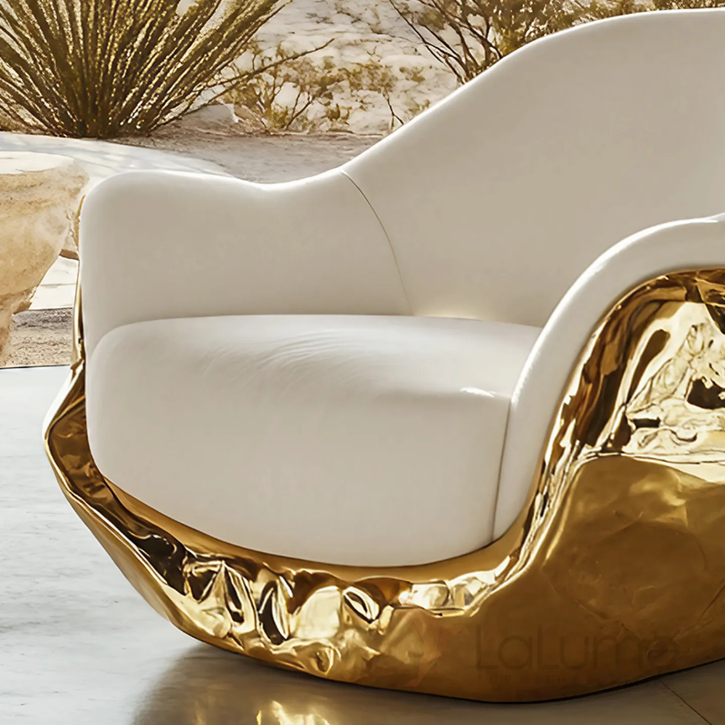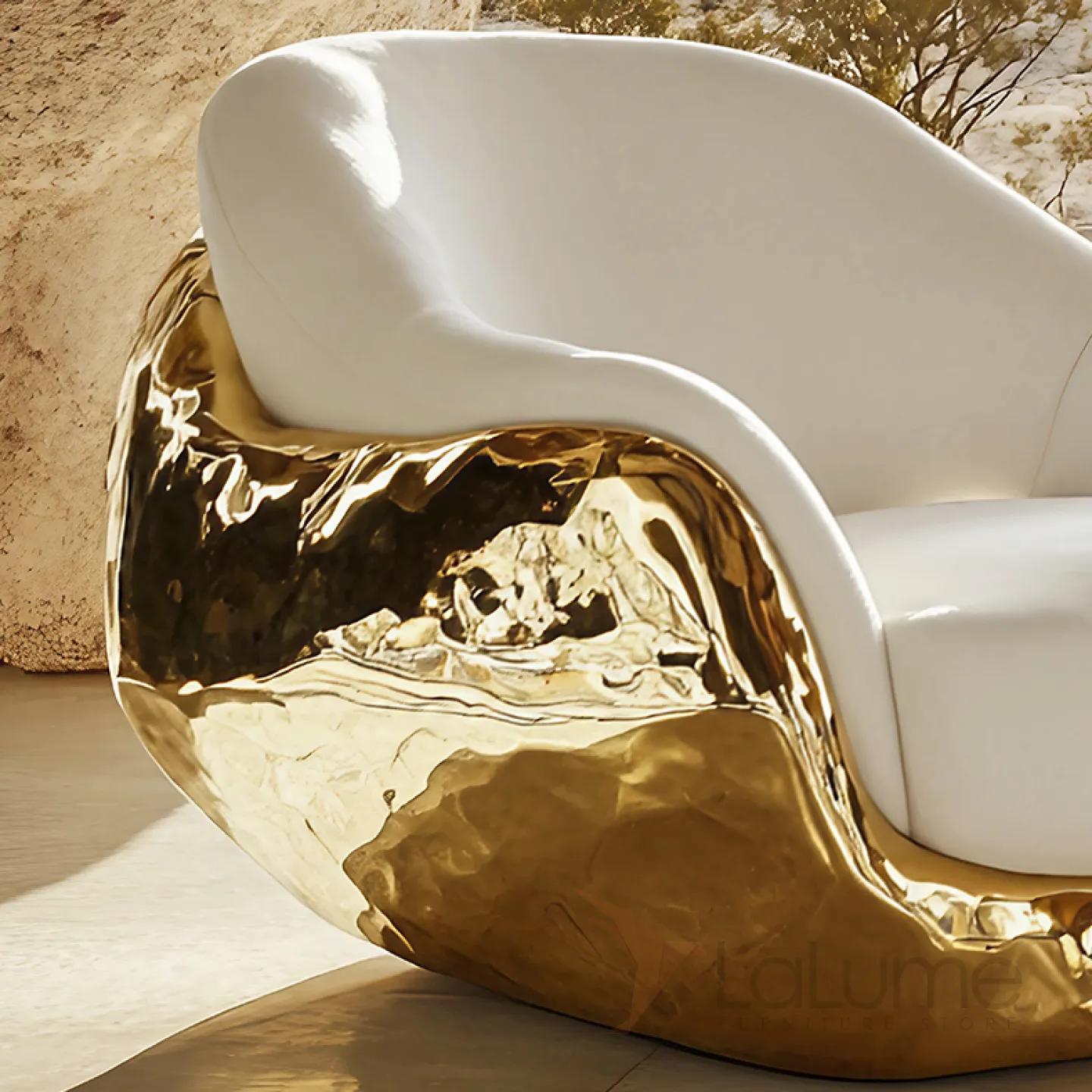 Элегантное кресло с уникальным дизайном. Мягкие очертания и утончённые изгибы подчёркивают его стиль. Сочетание золотых деталей и белой отделки придаёт интерьеру нотку изысканности и шика.