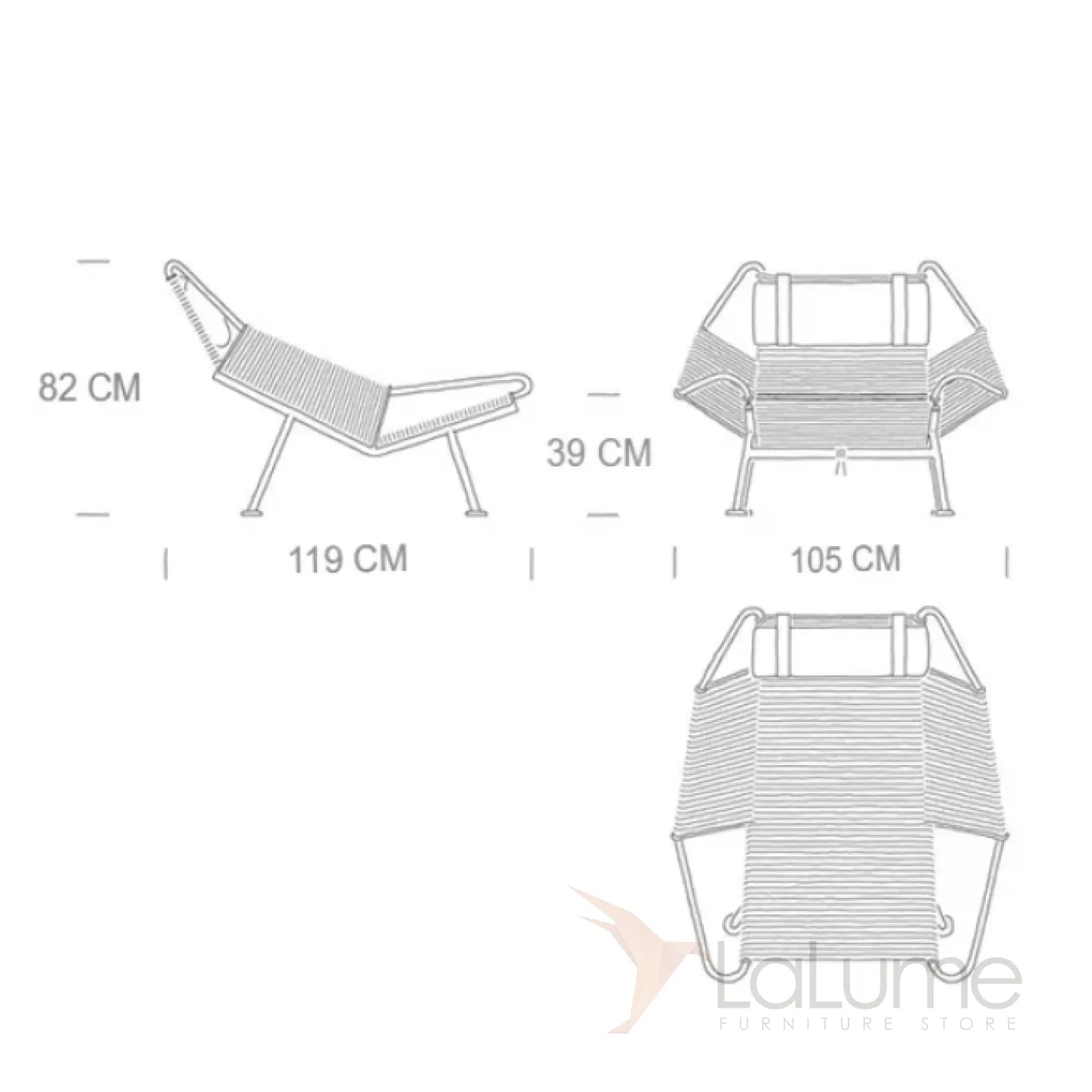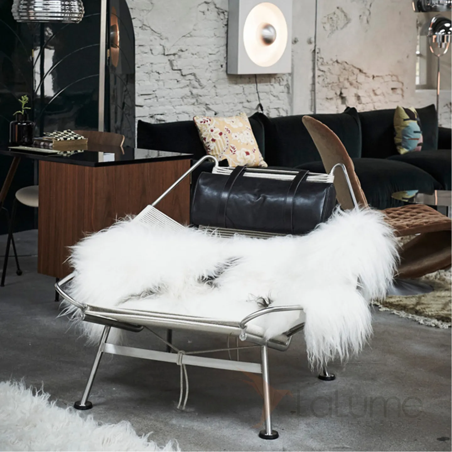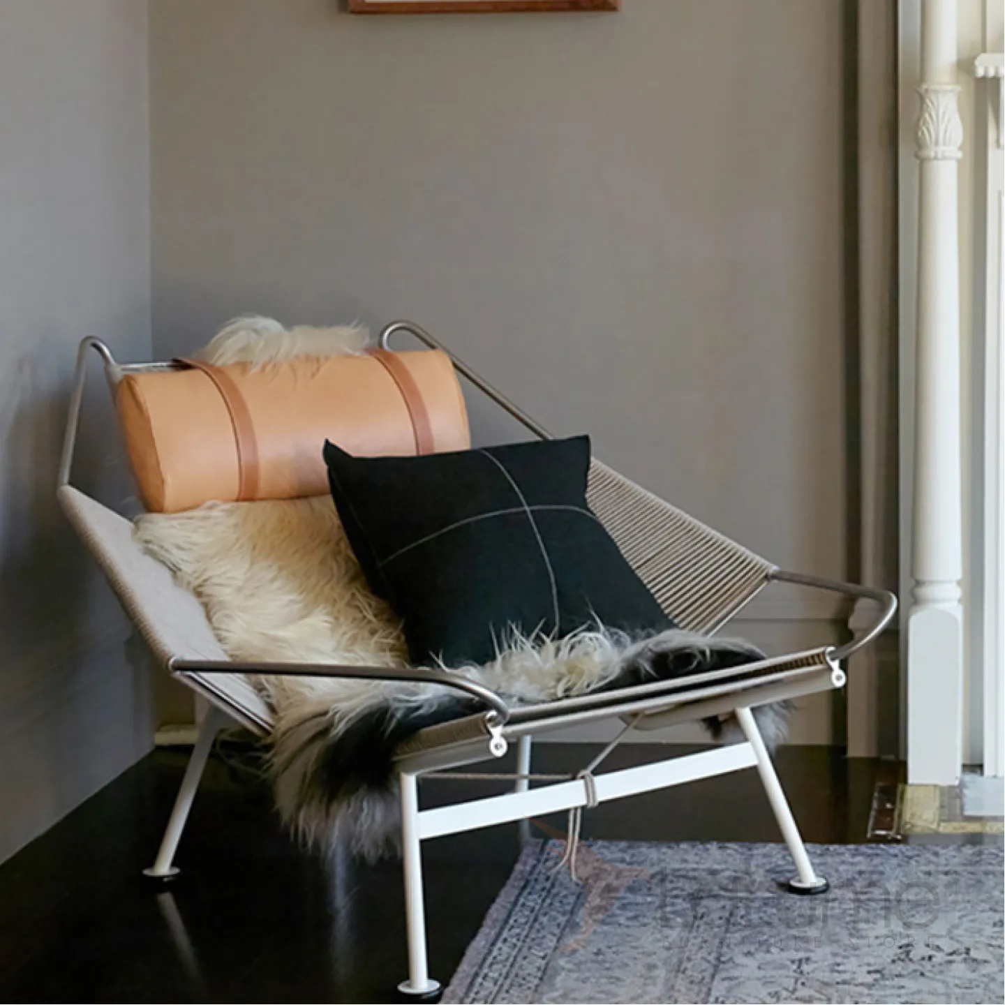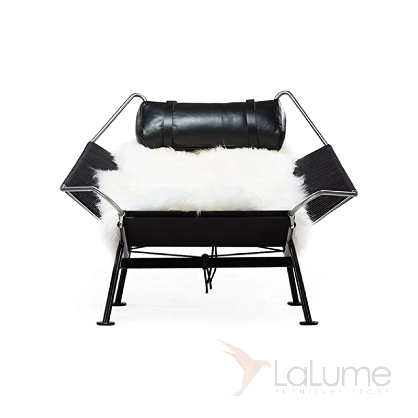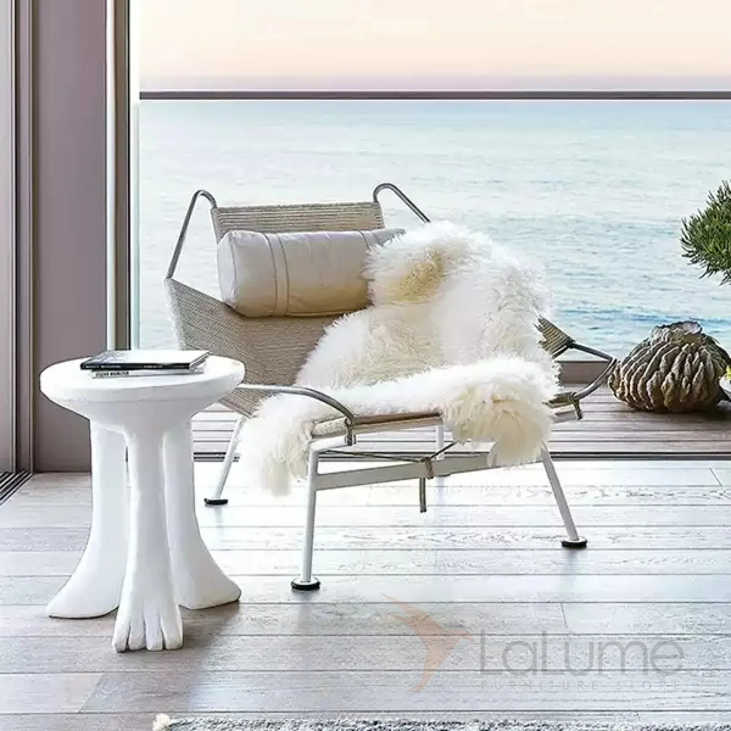 Шезлонг из нержавеющей стали с пеньковой веревкой, с натуральной меховой накидкой и с мягким подголовником. Есть модель без спинки, идеально подходящая для балкона или коридора.