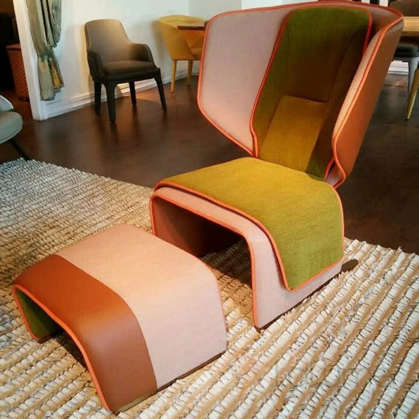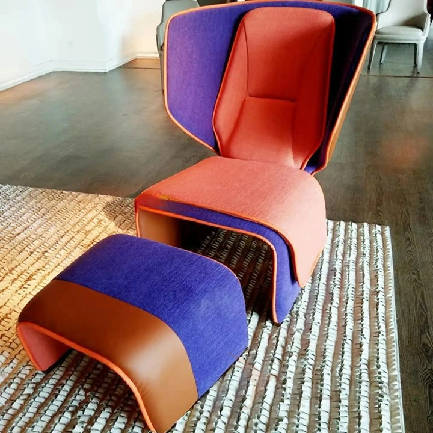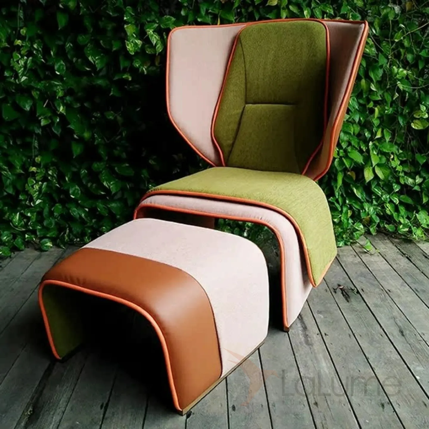 Кресло, выполненное в оригинальном дизайне, изготовлено из дерева и имеет обивку из поролона, кожи и мебельной ткани. Вы можете выбрать один из двух доступных цветовых вариантов.