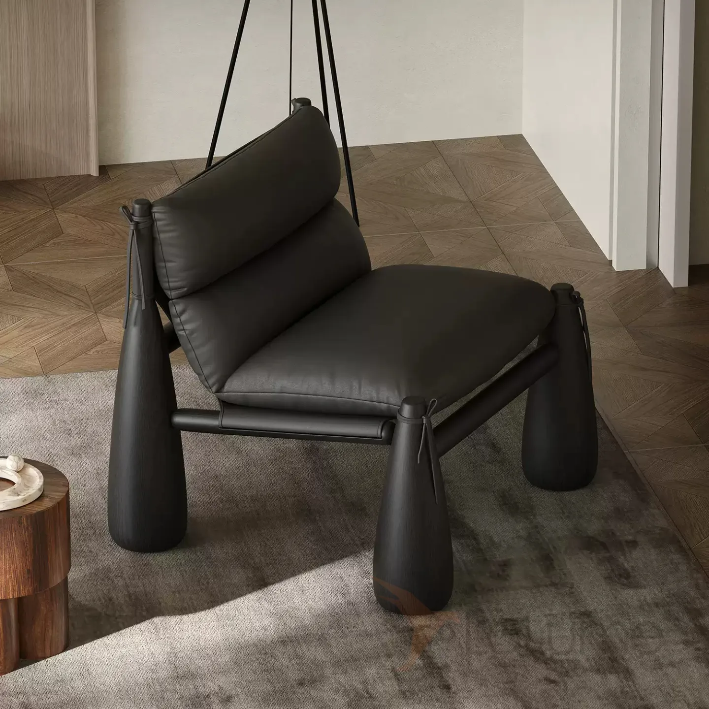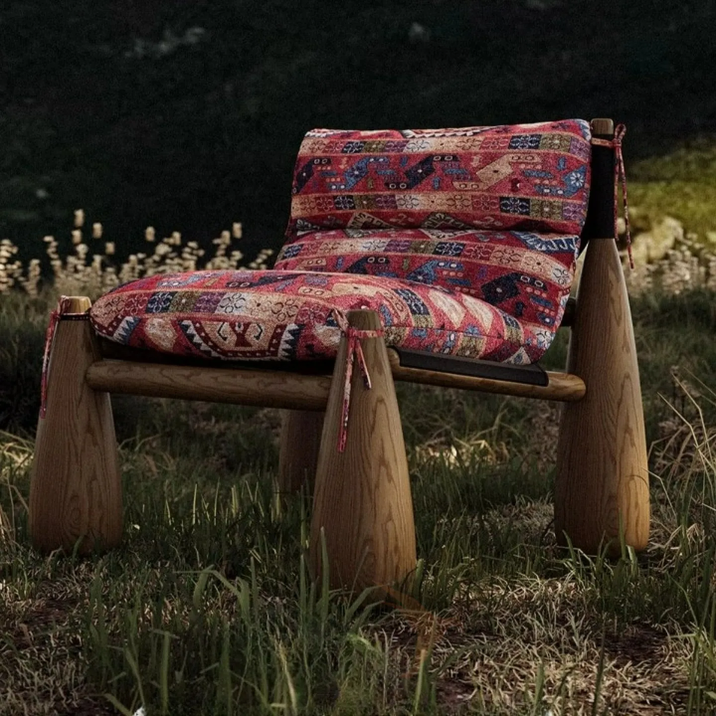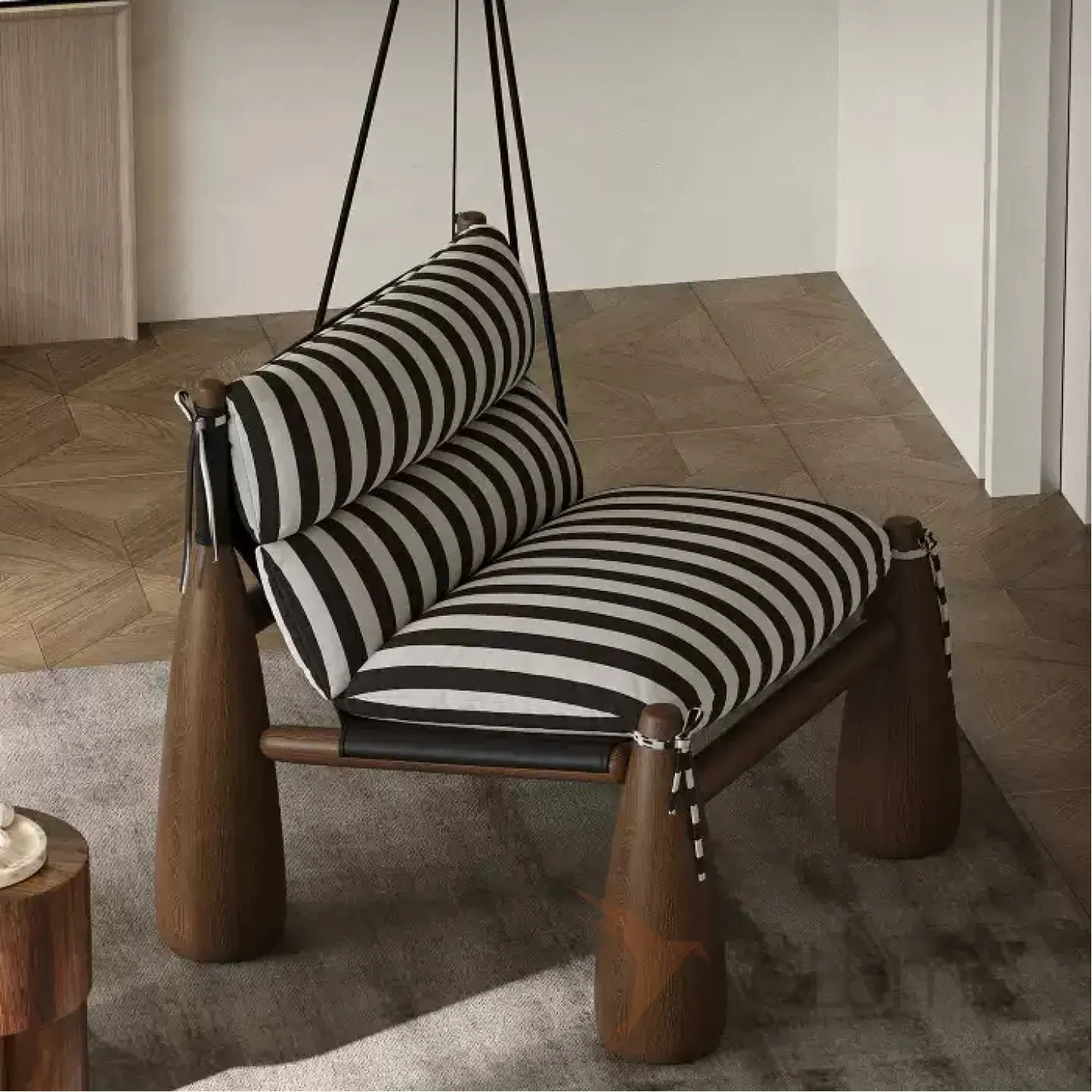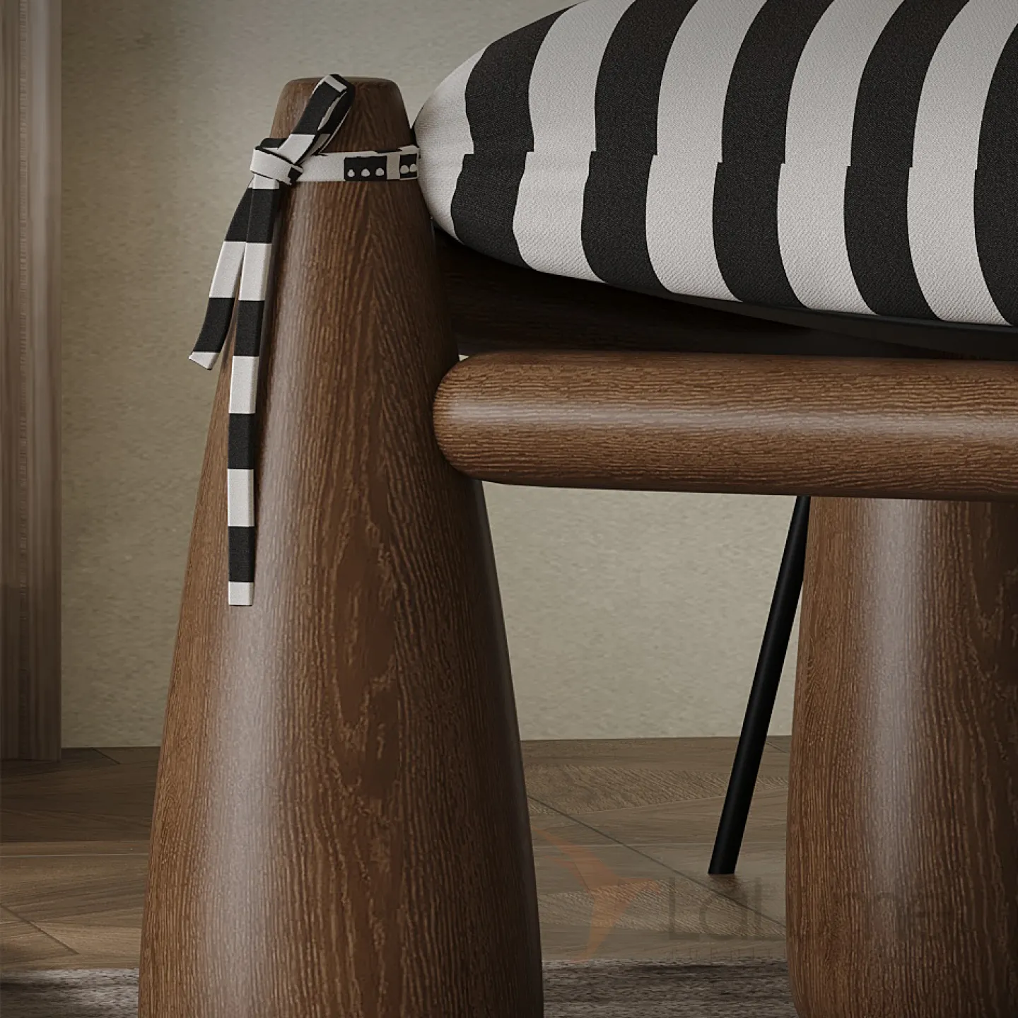 Кресло из дерева ясеня без подлокотников, в качестве обивки использован текстиль и кожа разных цветов, в зависимости от модели.