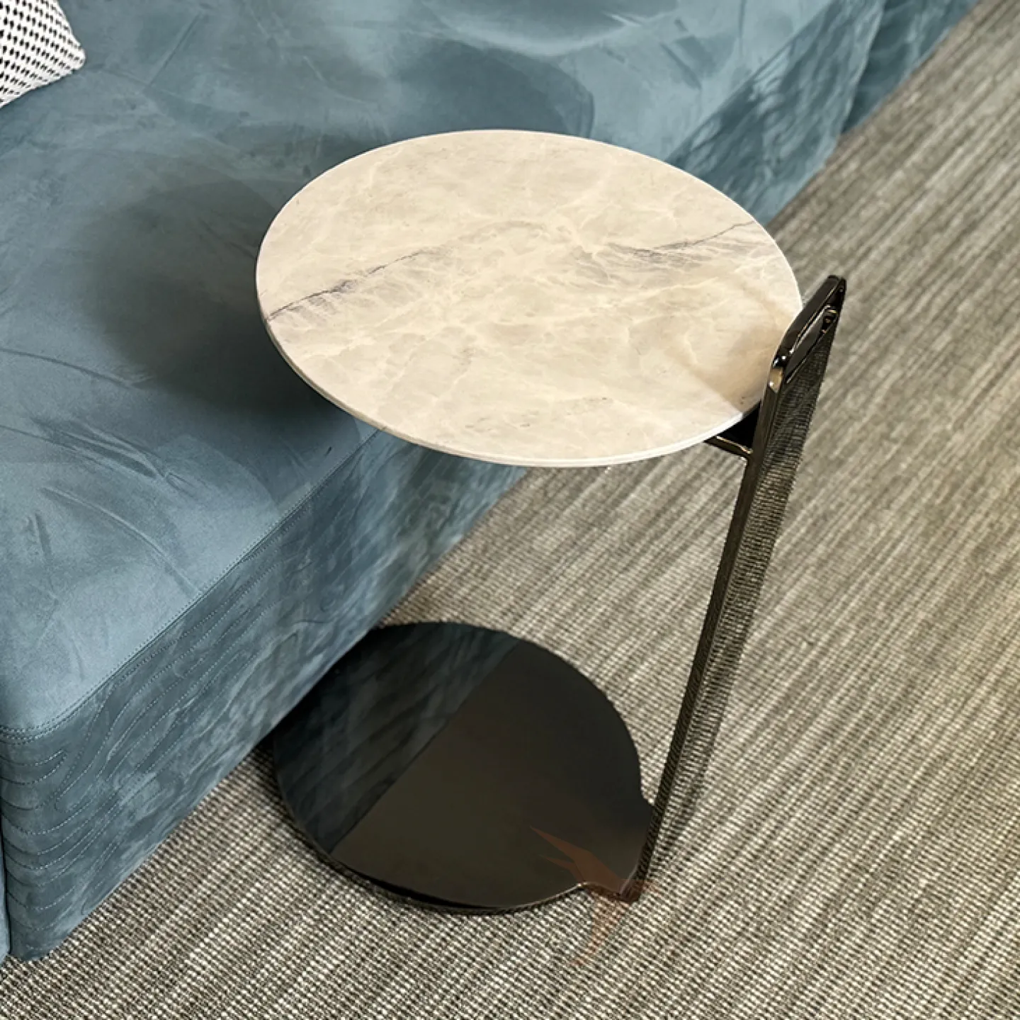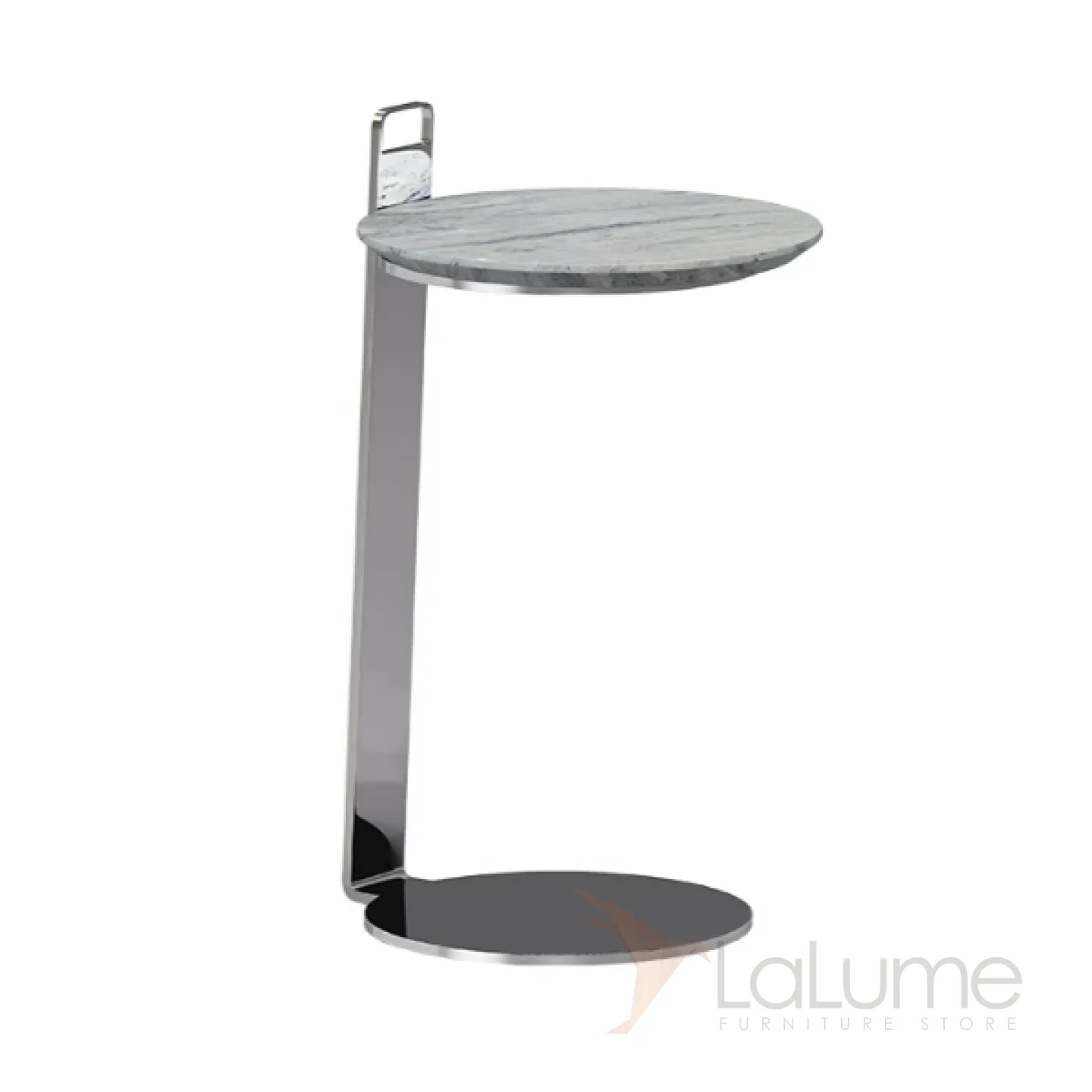 Компактный угловой столик с мраморной столешницей круглой формы и основанием из нержавеющей стали станет гармоничным дополнением к интерьеру. Его легко поставить рядом с креслом или диваном.